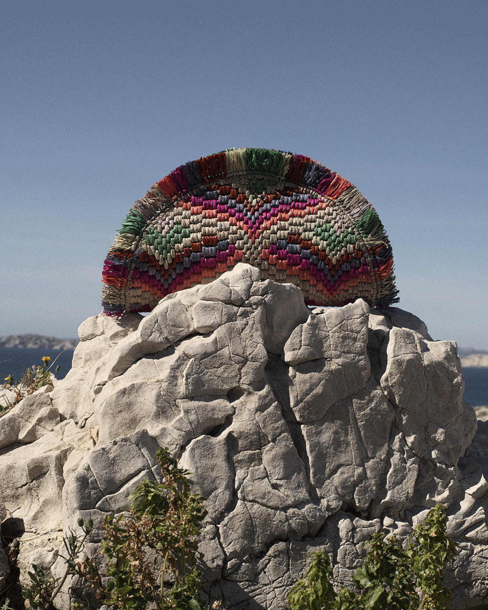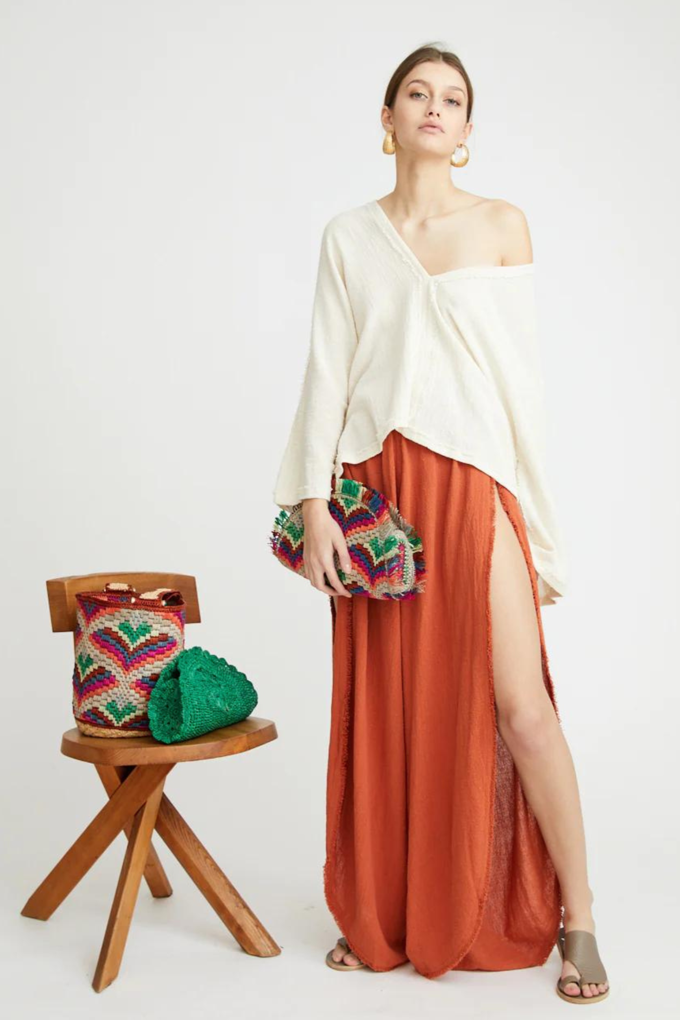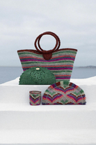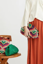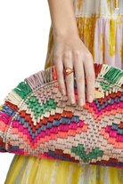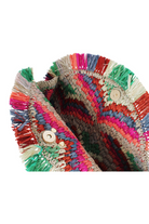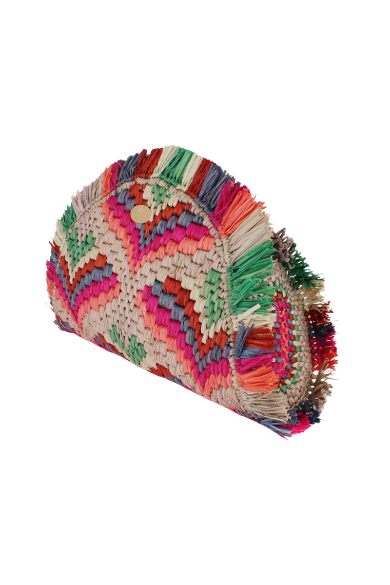 Our iconic raffia sun clutch is revisited this season in new colours and decorated with fringe. Features a magnetic closure. Handcrafted in Madagascar, our clutch bag is decorated with a gold logo and is worn by hand. The handicraft respects a sustainable and environmentally friendly production with local communities by promoting the employment of women from disadvantaged backgrounds. This bag comes with a protective cover. Each model is unique and may have irregularities due to the natural character of the fibre and its handcrafted manufacture.