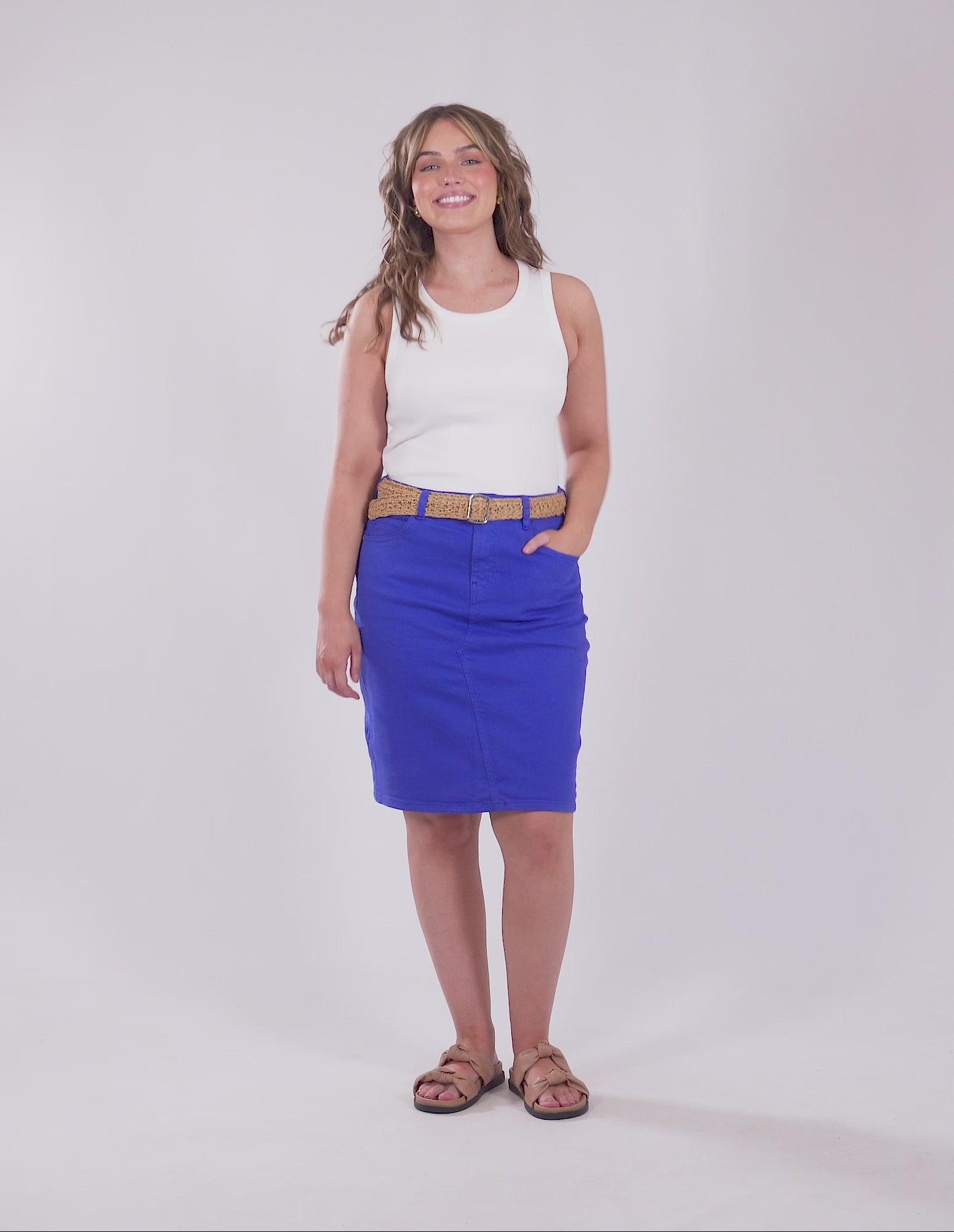 The belle skirt is a fun take on your classic denim skirt. made from a medium-weight denim this midi length straight cut skirt features a zip front, fitted waist, and hip pockets.