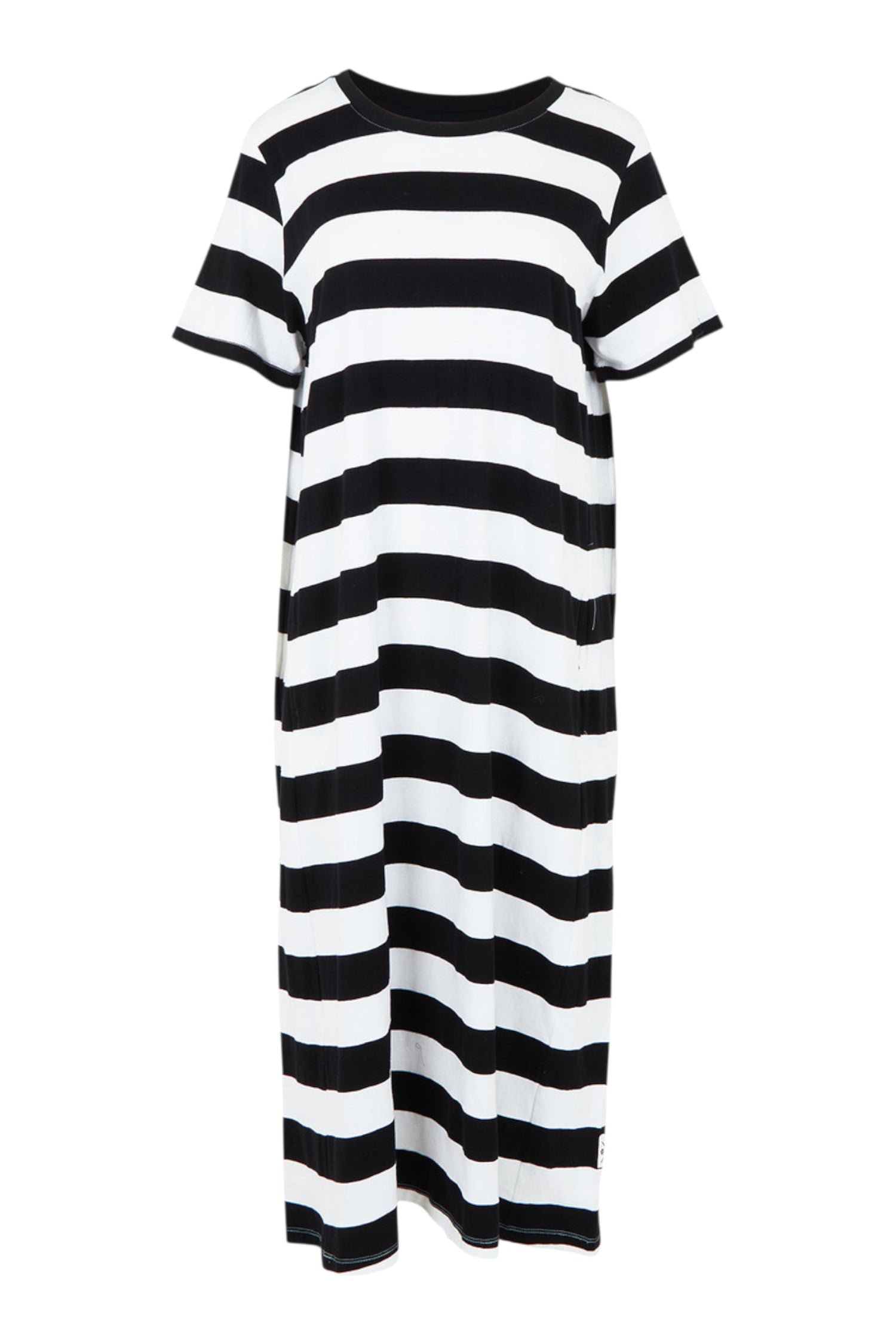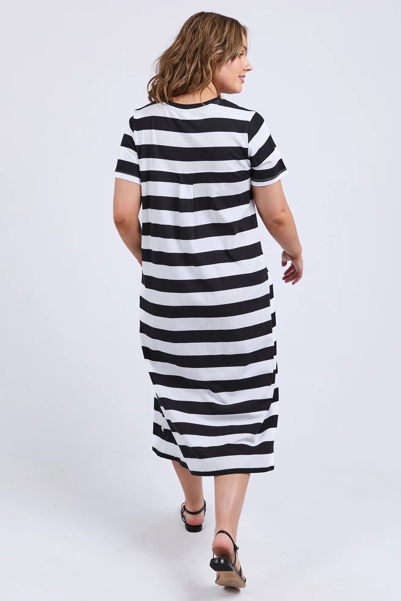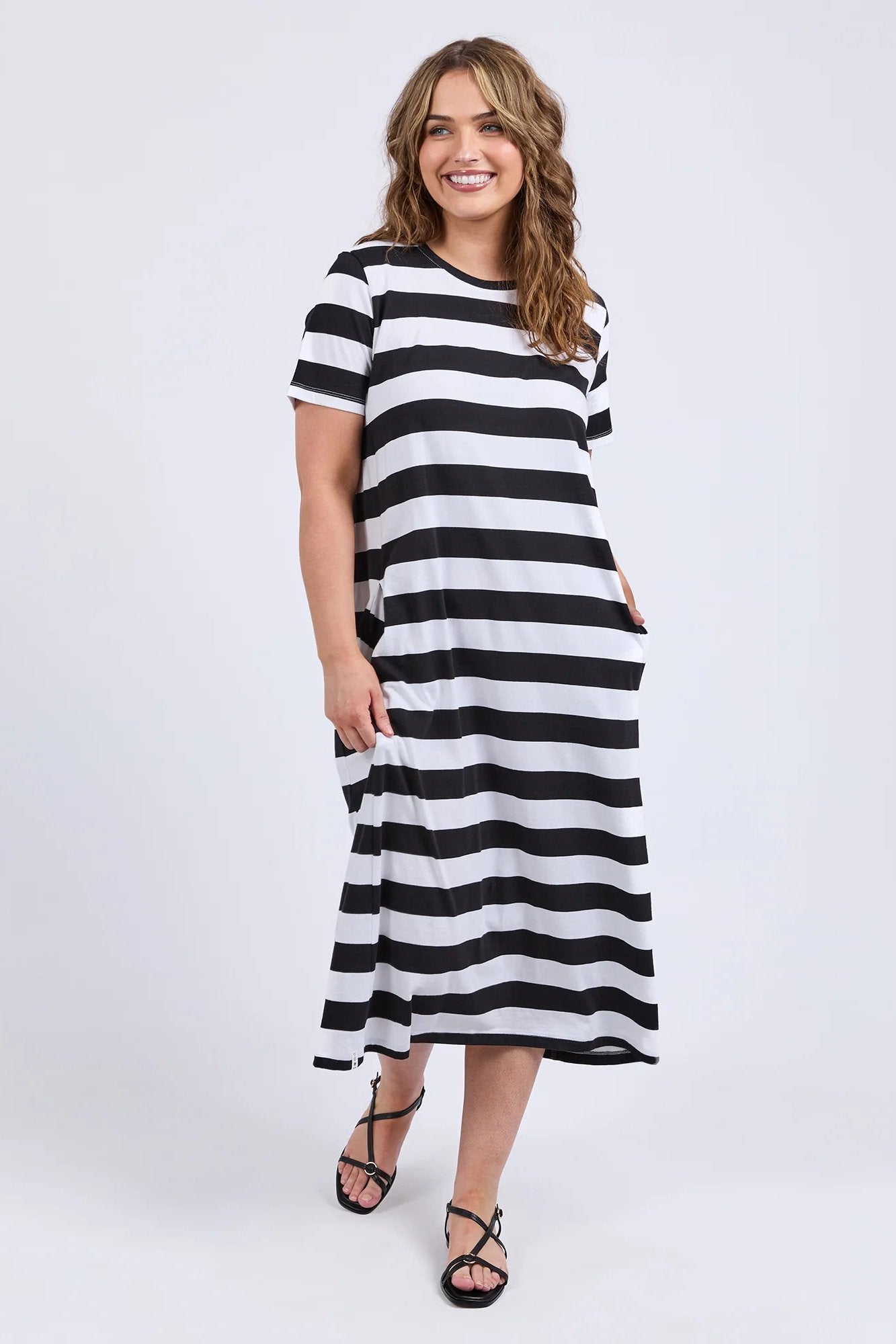 A t-shirt dress with shape; could there be a better blend of comfort and style? The Fundamental Adira Cotton Dress by Elm is a bold striped beauty and ticks all the boxes with its flattering paneling, calf-length cut, soft round neckline, and ever practical in-seam pockets. It is the kind of throw on and go piece that makes getting dressed a breeze. Layer with boots and a denim jacket when the weather cools, or keep it breezy with slides and sunnies.