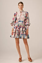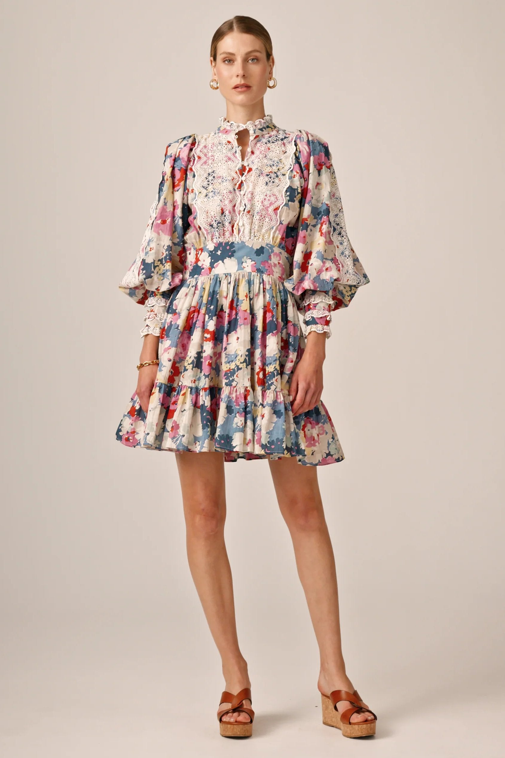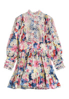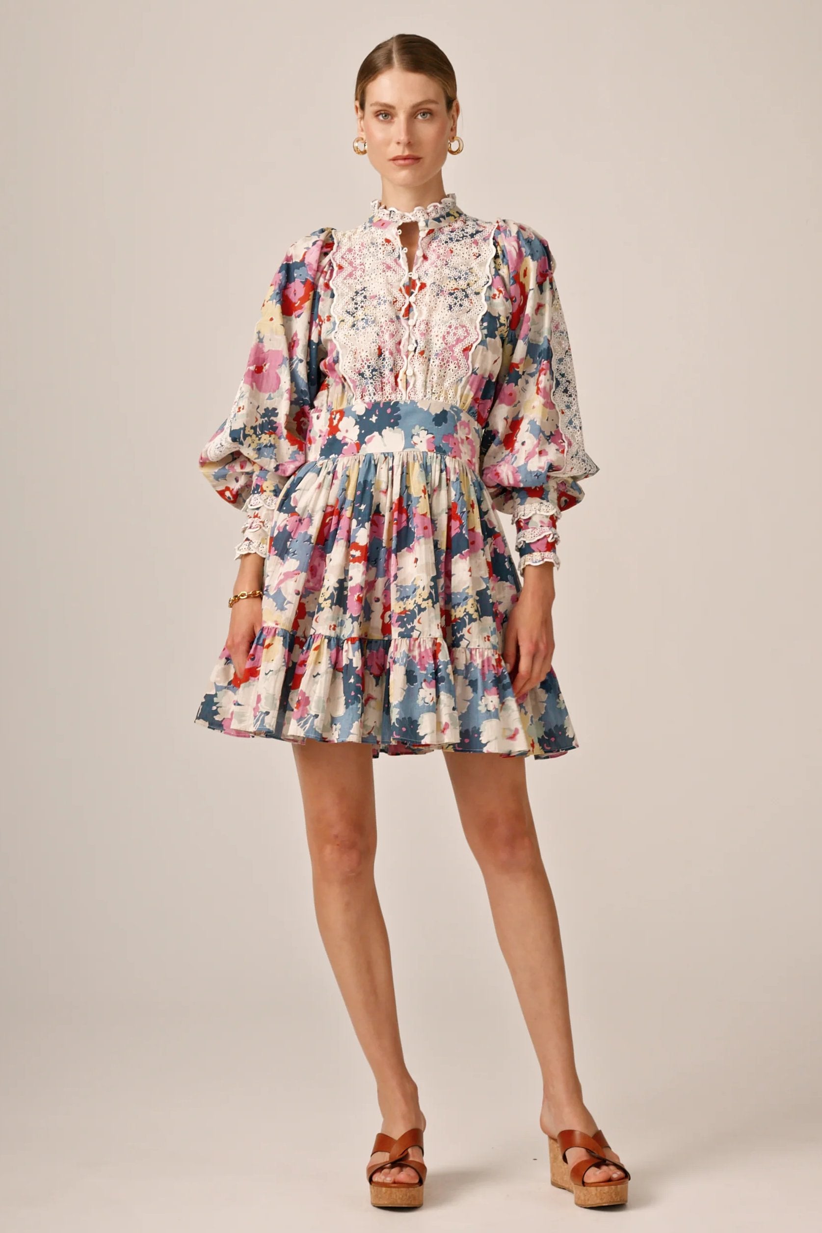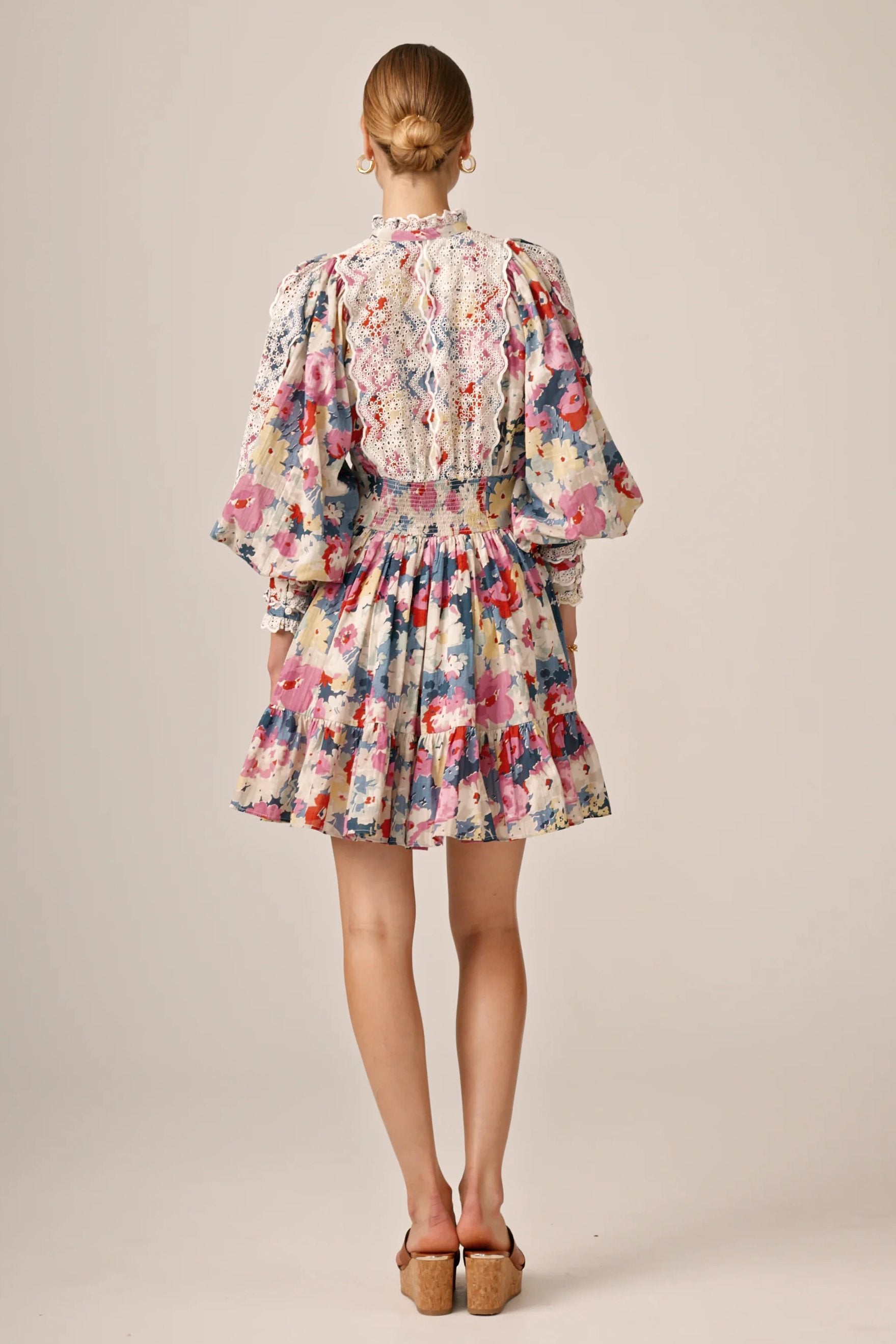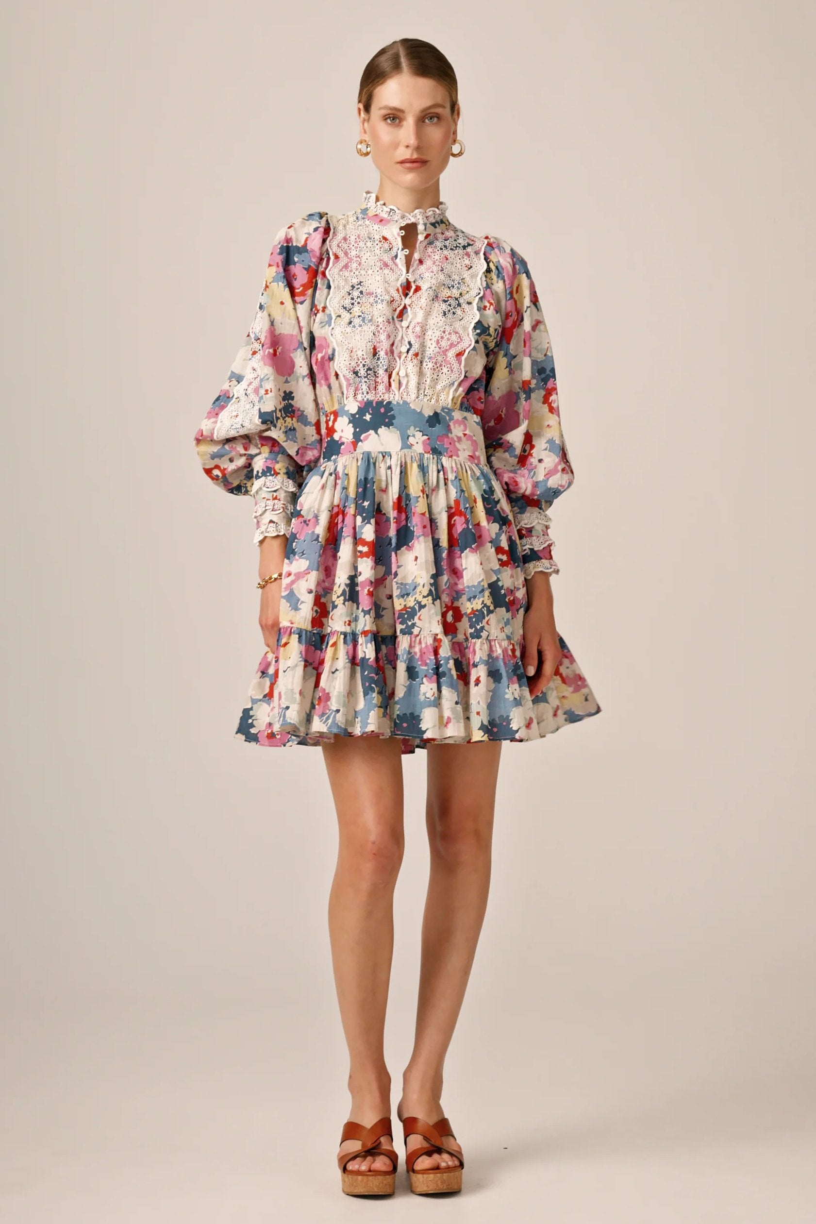 Beautiful dress for women from ByTiMo. The Cotton Slub Mini Dress is cut from a light and soft cotton quality, with slub details. It has a mini length, a defined waist with smocking in the back and a voluminous A-shaped skirt. The dress has oversized, vintage-inspired sleeves, with broderie anglaise inserts on the chest, sleeves, cuffs and neckline. The top has buttons at the front, and the skirt ends with a beautiful ruffle.