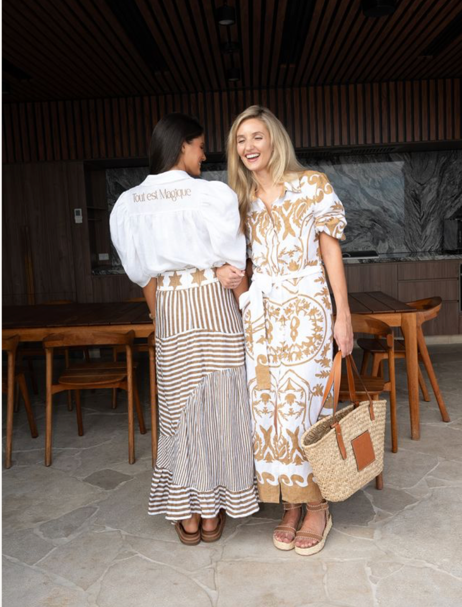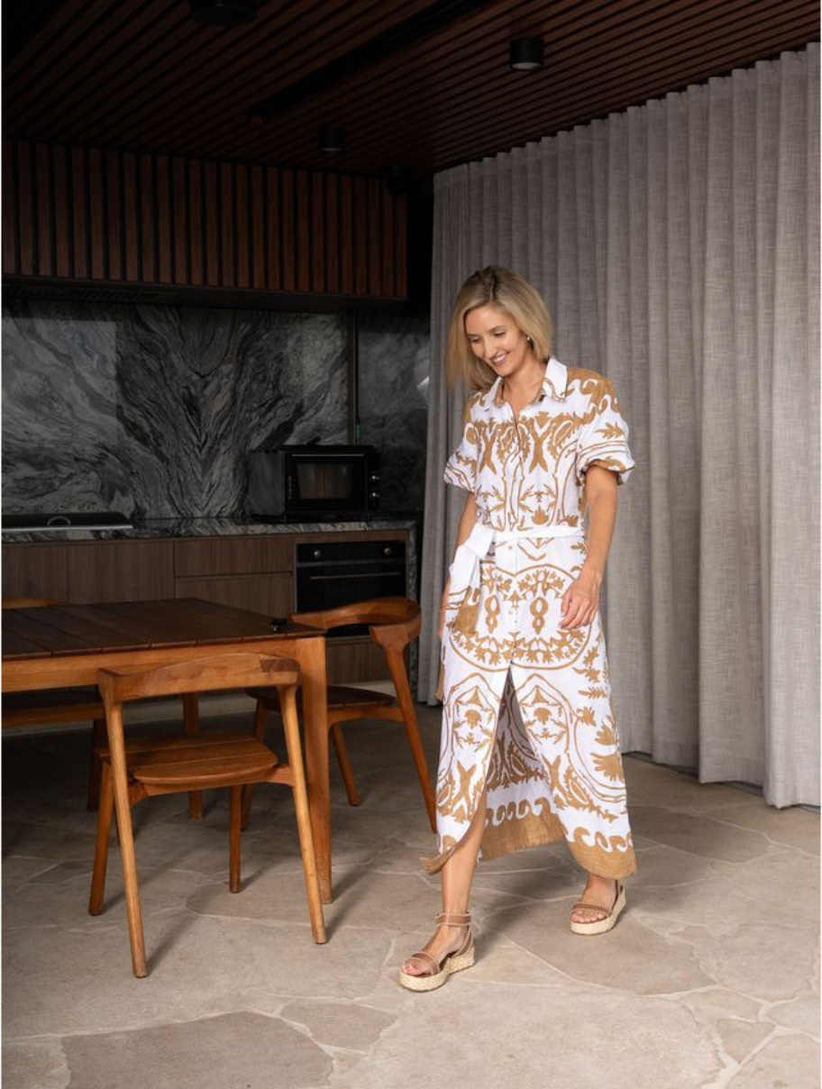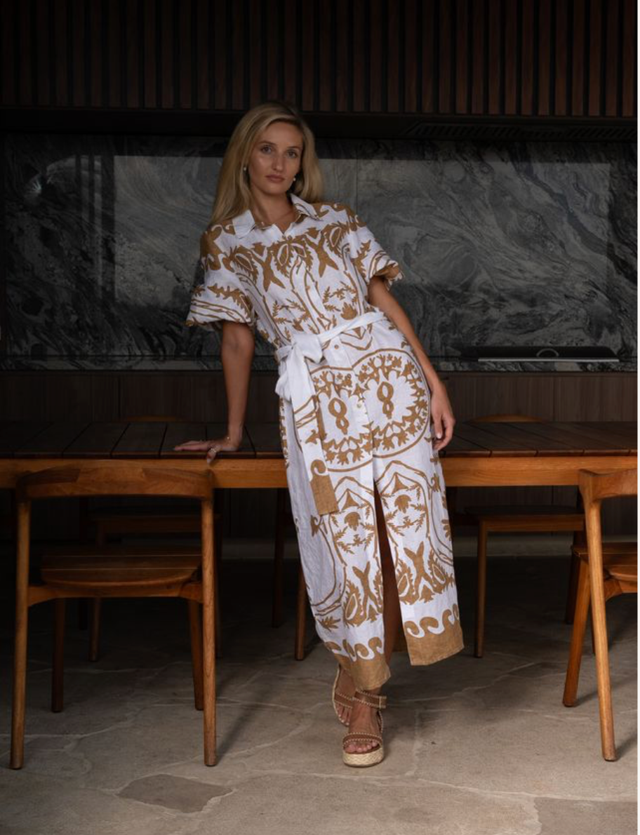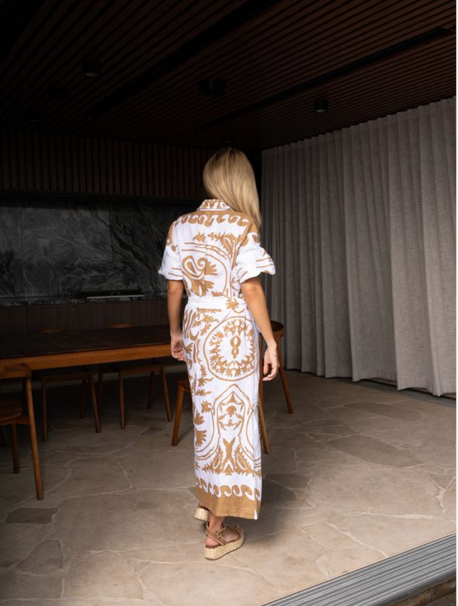 A true summer staple, the Mia is a button-up linen dress with a bohemian printed design.