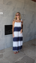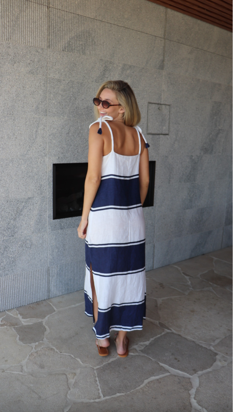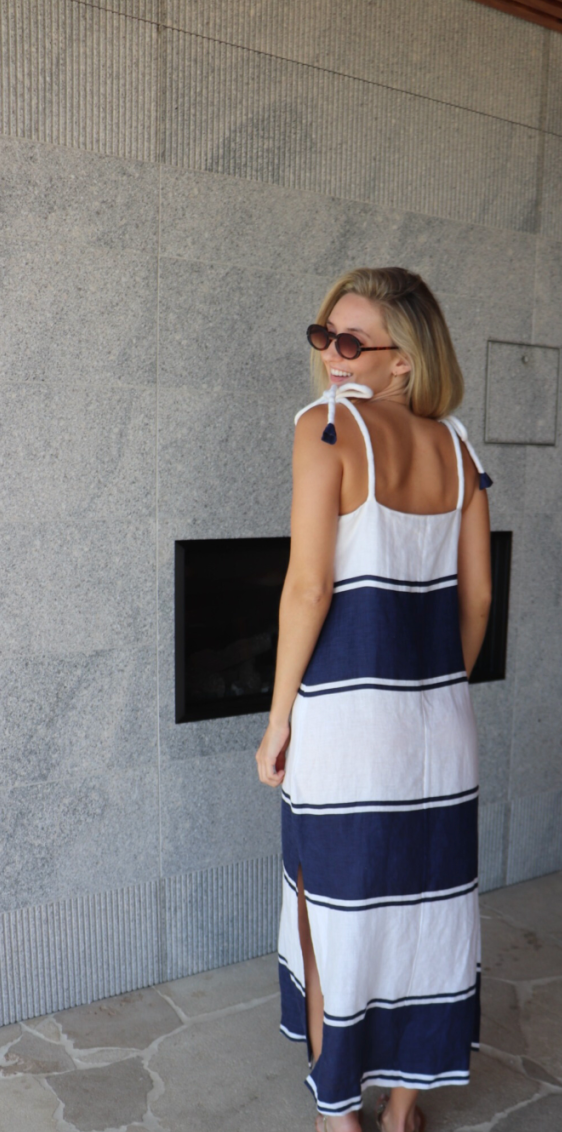 A modern linen cami straight through dress with Parisian flair. The Tia Dres features a chic bias cut with candy-stripe straps, bringing playful French styling to a versatile summer piece