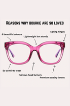 Meet Bourke, the ultimate oversized reading glasses,  that are here to elevate your eyewear game! If you're all about embracing a larger frame, Bourke is your perfect match.  With 6 fab colours to choose from,  she is super comfortable to wear and surprisingly light. Bourke is made from TR90  which is what makes the frame so light and flexible to wear.