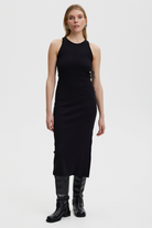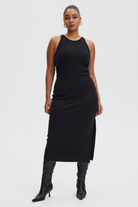Gestuz extends the Drew sleeveless top to this versatile midi dress. In a fashion-forward, body-skimming cut with a high neck and back, narrow shoulder straps and side slit. Made responsibly in a select blend of Better Cotton.