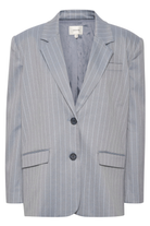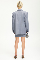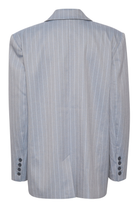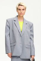 A single-breasted oversized blazer in a stylish pinstripe pattern. With shoulder pads, drop shoulder, peaked lapel, front flap pockets and handkerchief pocket, buttoned cuffs, logo lining and back slit. For a completely coordinated look, pair with the Fija Trouser in Dusty blue and Prya Crop Top to get the look.