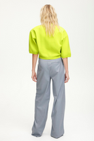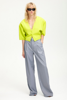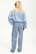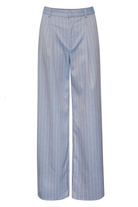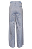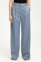 Pinstripe tailored pants with a modern touch in a subtle, spring-inspired hue. With a floor-length, wide leg structure designed to sit mid-waist, and belt loops, front darts and a single back pocket. Coordinate with the matching Fija Blazer in Dusty Blue for a classic, on-point aesthetic. The pants on the model have been taken down. Therefore, they will be shorter when you receive them. If you need more length, you can easily take them down yourself.