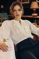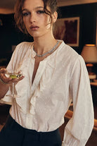A feminine, romantic blouse of cotton polka dot with neck to hem button opening & eyelash edged frill.