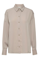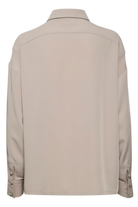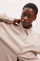 A modern take on the button-down shirt in an oversized fit with feminine details. With a classic collar, and pearl buttons down the front and at the cuffs. In a responsible blend with recycled materials. Style half-buttoned over the matching Sloan HW pants for a complete, chic look. Also Available in Red Alert and Jet Set.