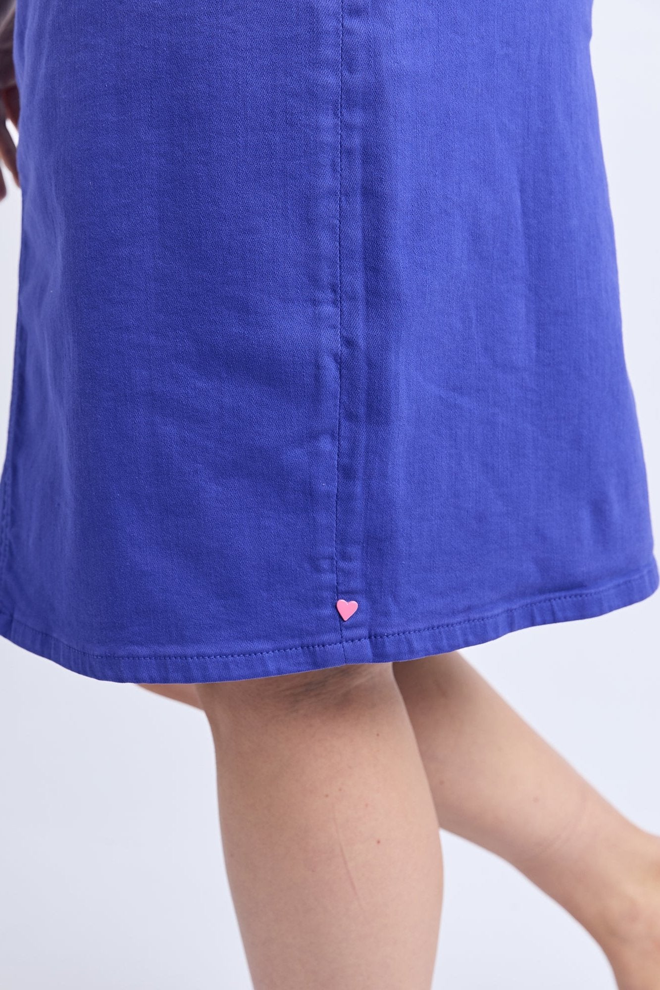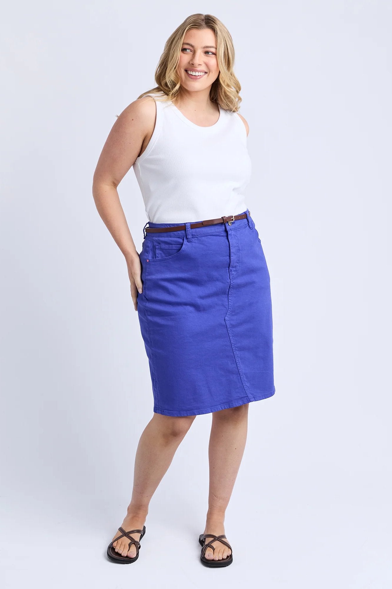 The belle skirt is a fun take on your classic denim skirt. made from a medium-weight denim this midi length straight cut skirt features a zip front, fitted waist, and hip pockets.