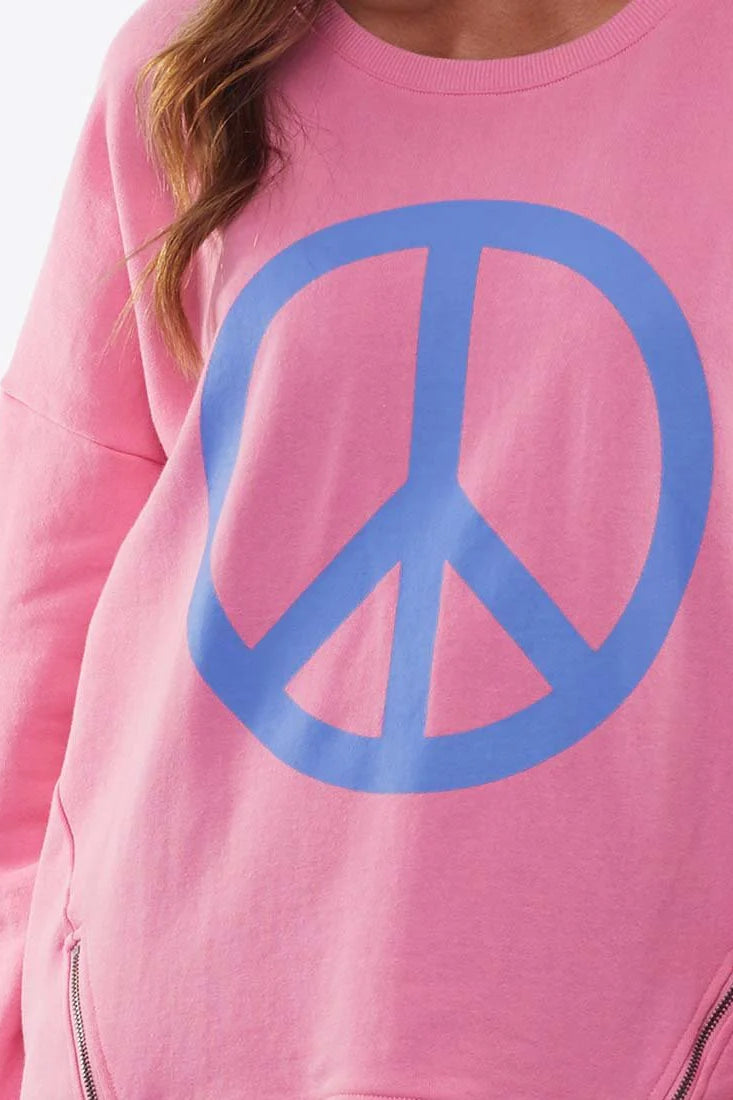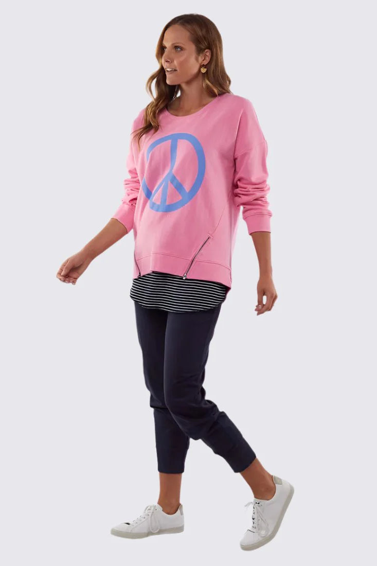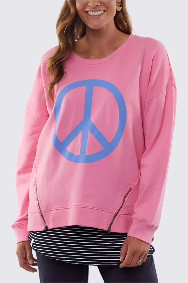 The Love And Peace Crew by Elm is a fun and casual jumper for everyday wear. Featuring a bold peace sign print, long sleeves and zip details, this casual piece will work well over track pants, active wear or your denim with sneakers.