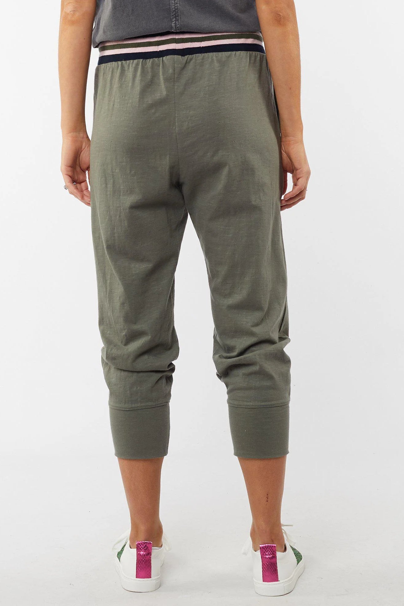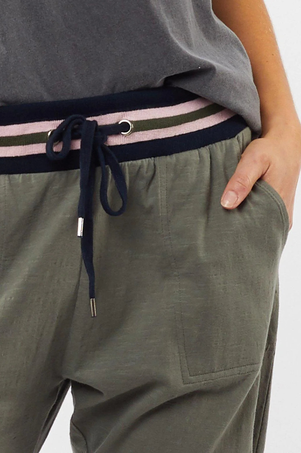 - Stripe design waistband in black, pink, and khaki