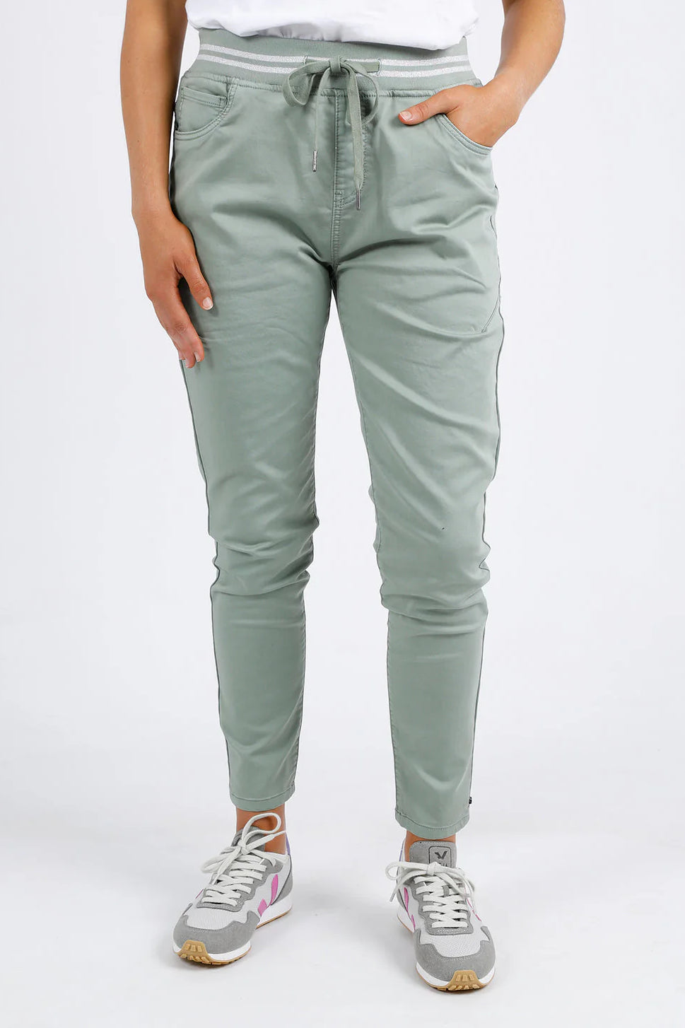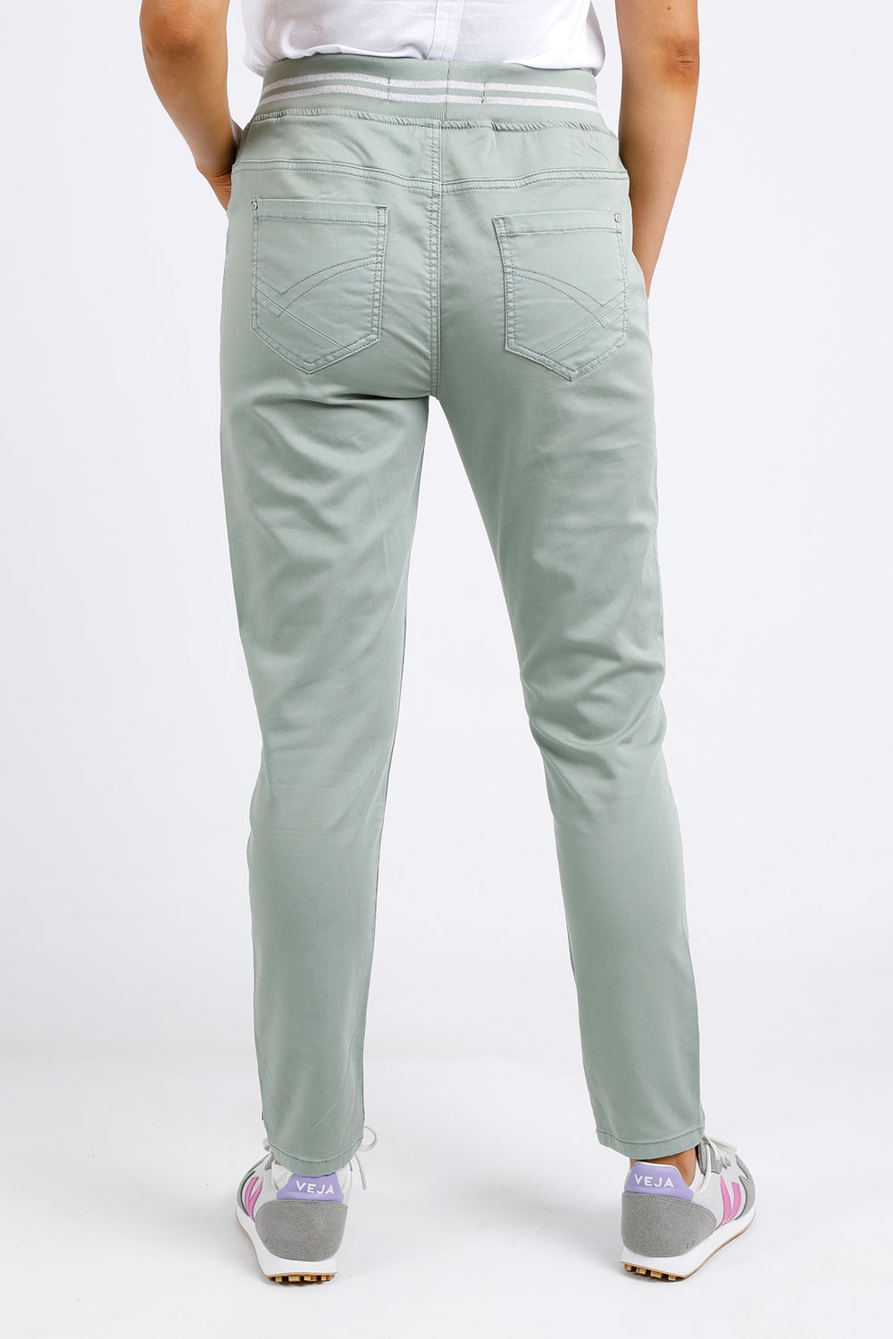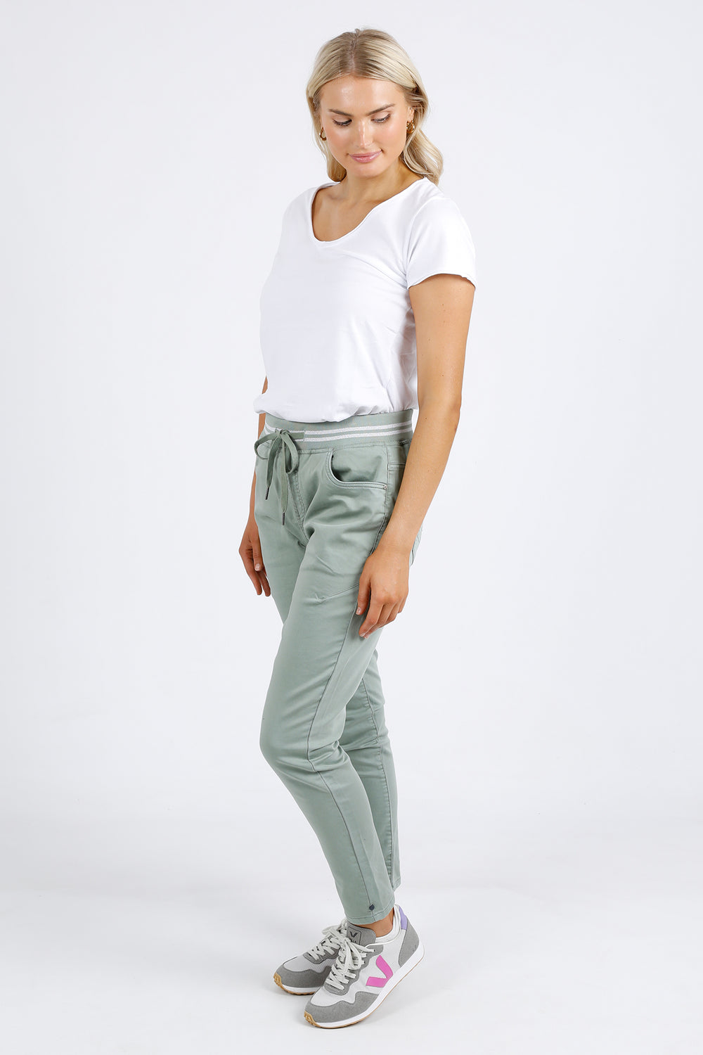 The Margo Jogger by Elm Lifestyle are a functional and fantastic stretch drill pant featuring a slim leg and comfort plus rib waist band with a cute metallic stripe.