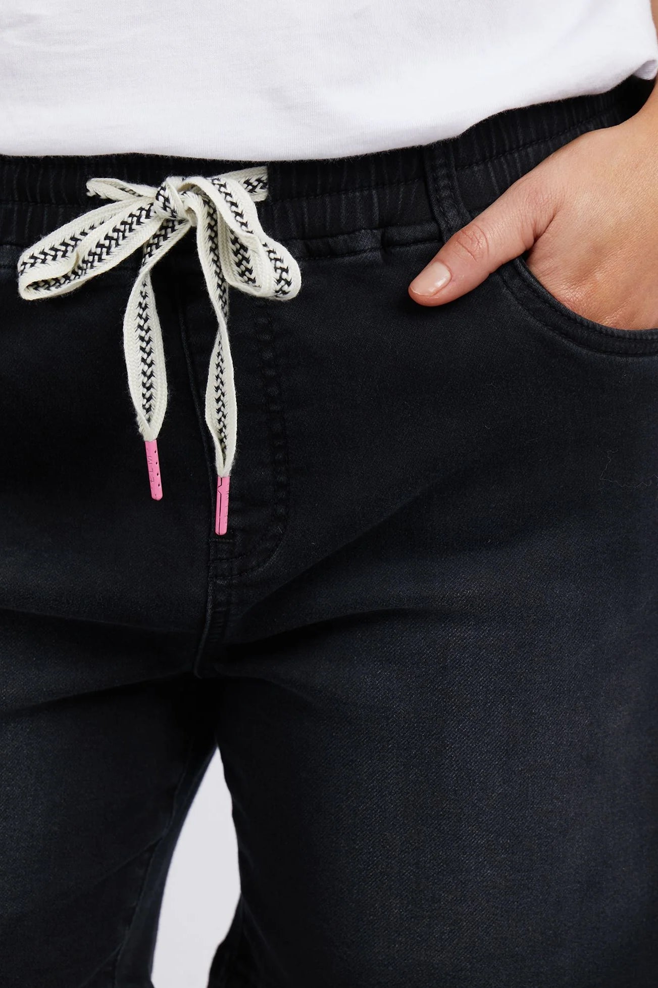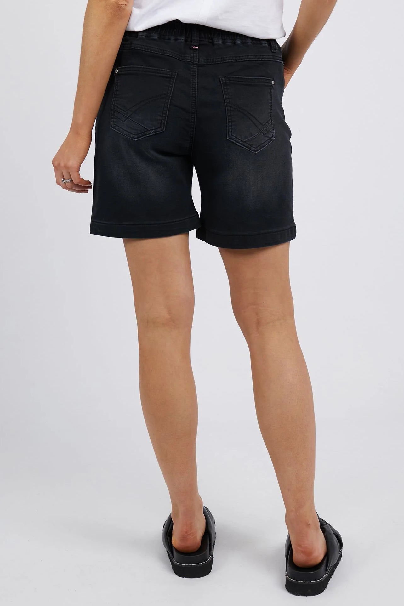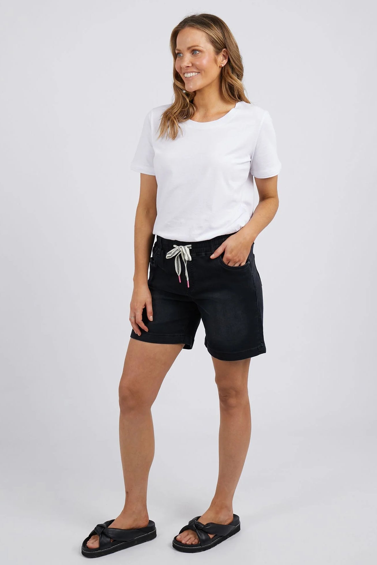 Crafted from comfy stretch denim, these shorts feature an elastic waist with belt loops, sportive drawstring, front pockets and mock back pockets.