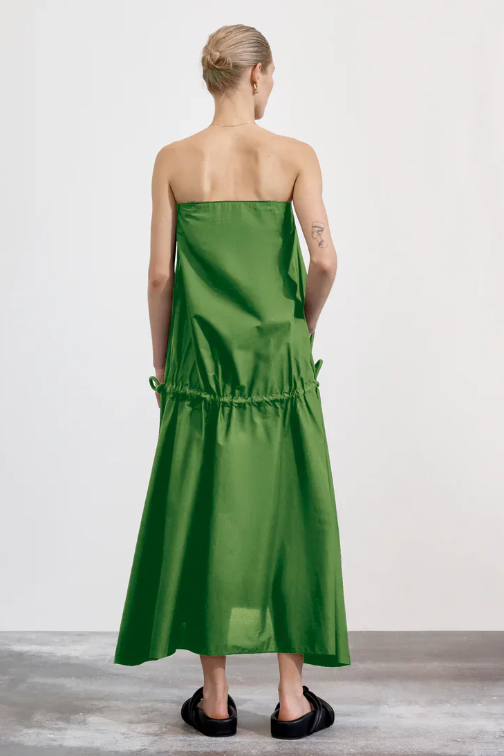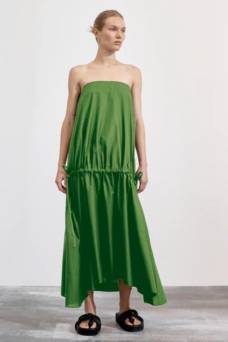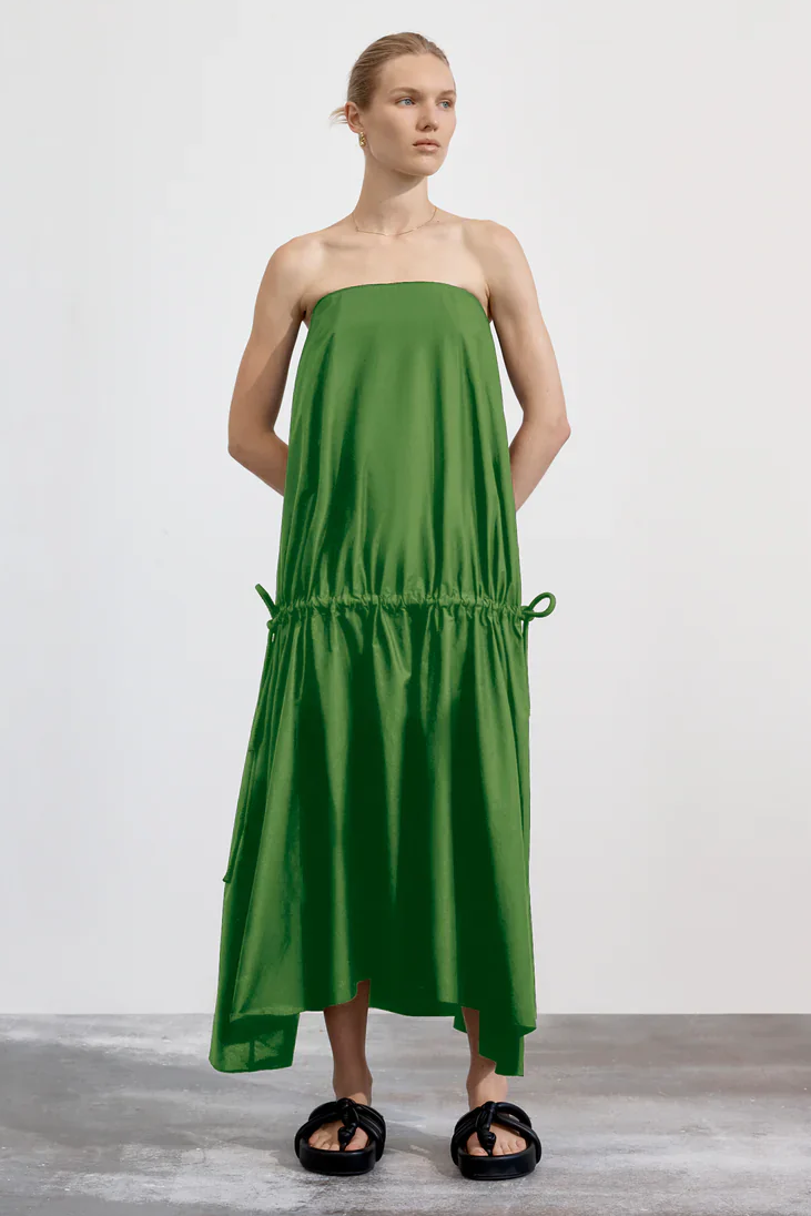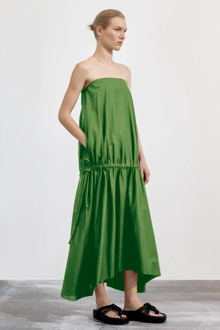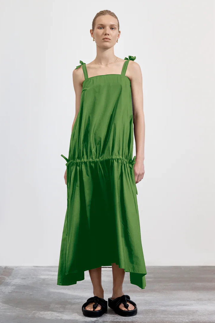 An effortless "cool girl" dress, the Clara features a streamlined silhouette with adjustable shoulder straps for comfort and ease. The drop waist falls to a curved hem and is accented by a covered rope draw cord creating gather and allowing a more cinched in look.