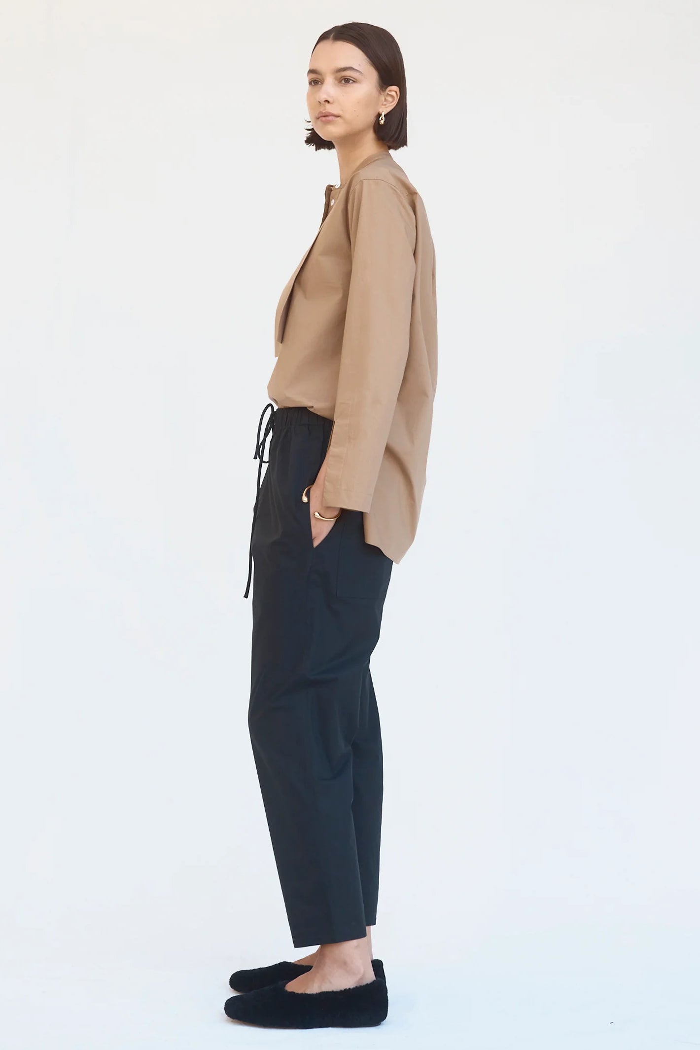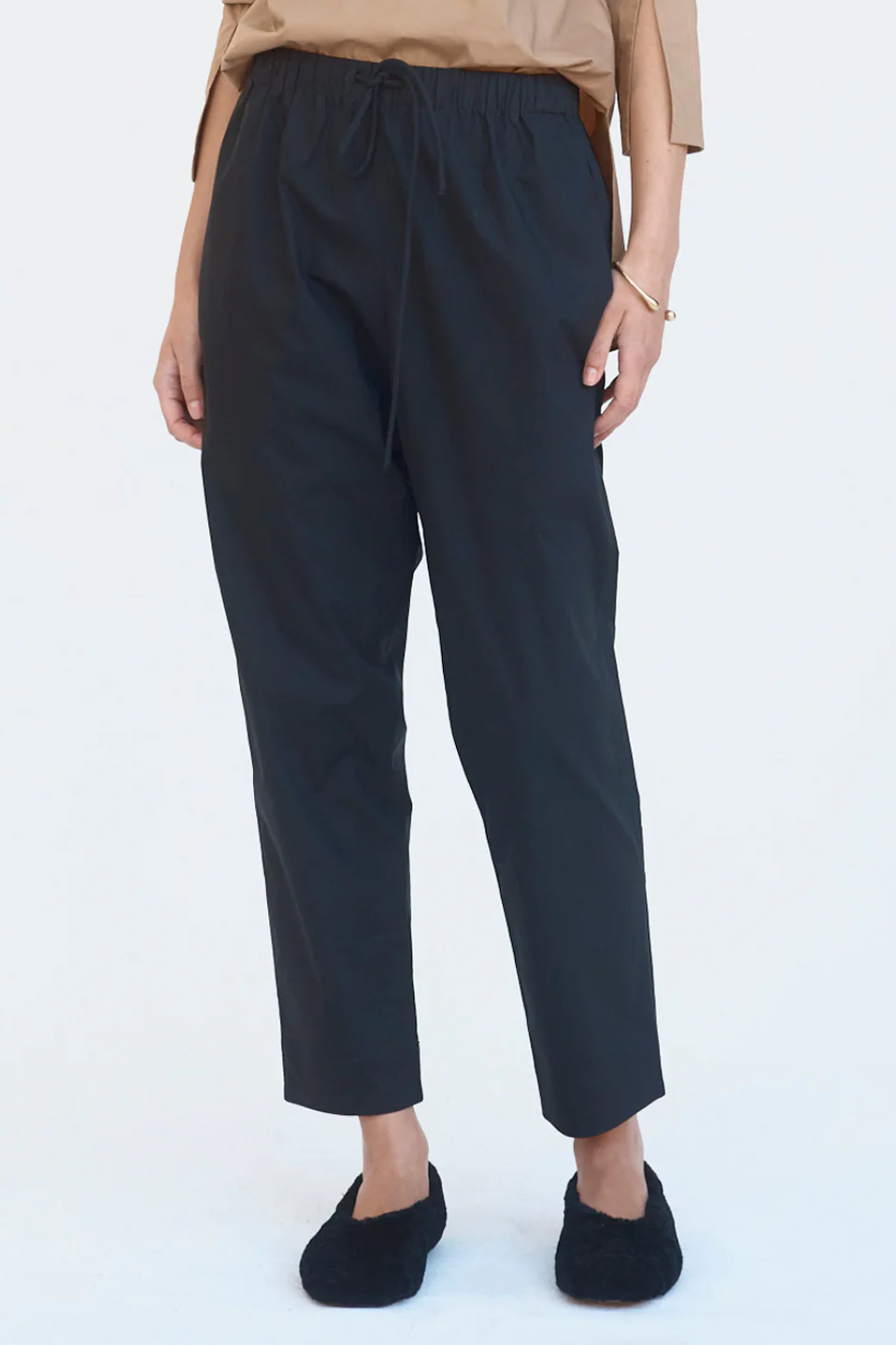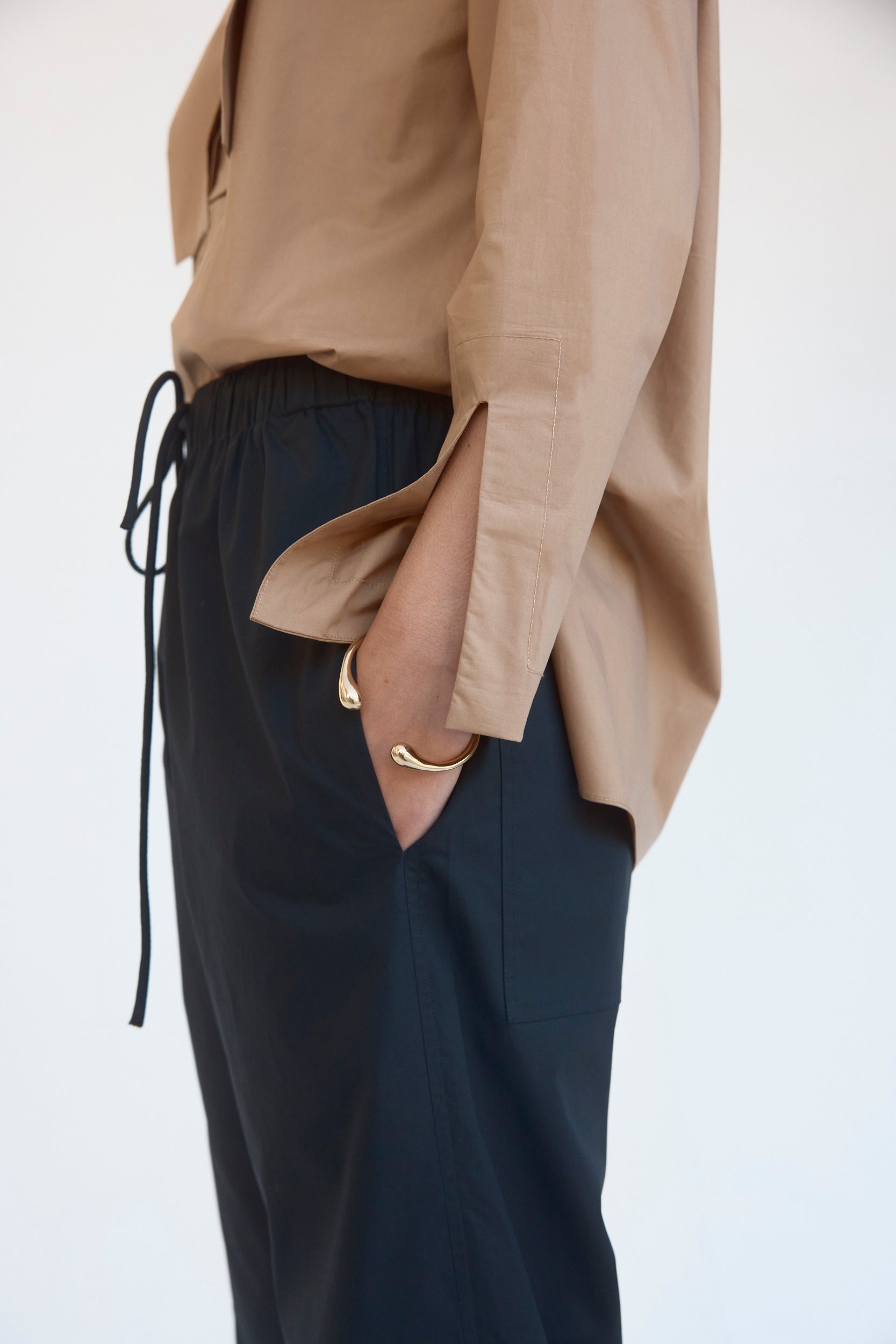 Designed with back patch pockets, a low crotch and subtle taper, these minimalist pants provide comfort and ease. Cut in cool cotton poplin and designed to sit on the high hip, they feature an elasticised waist with self-cover rope draw cord and practical twin side pockets.