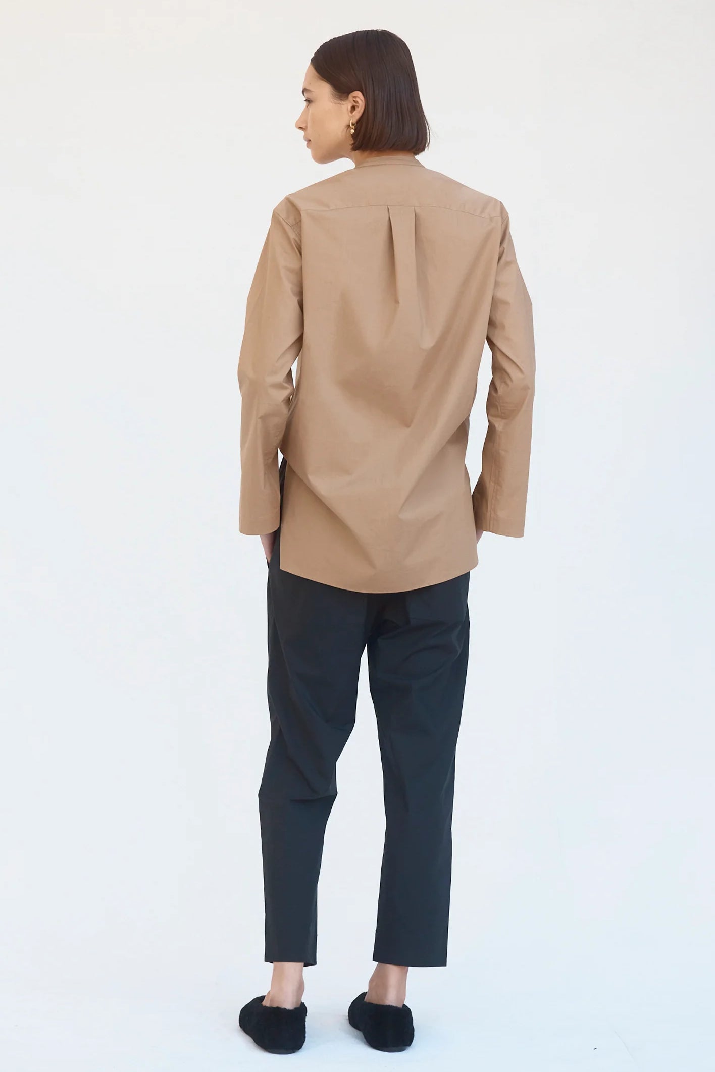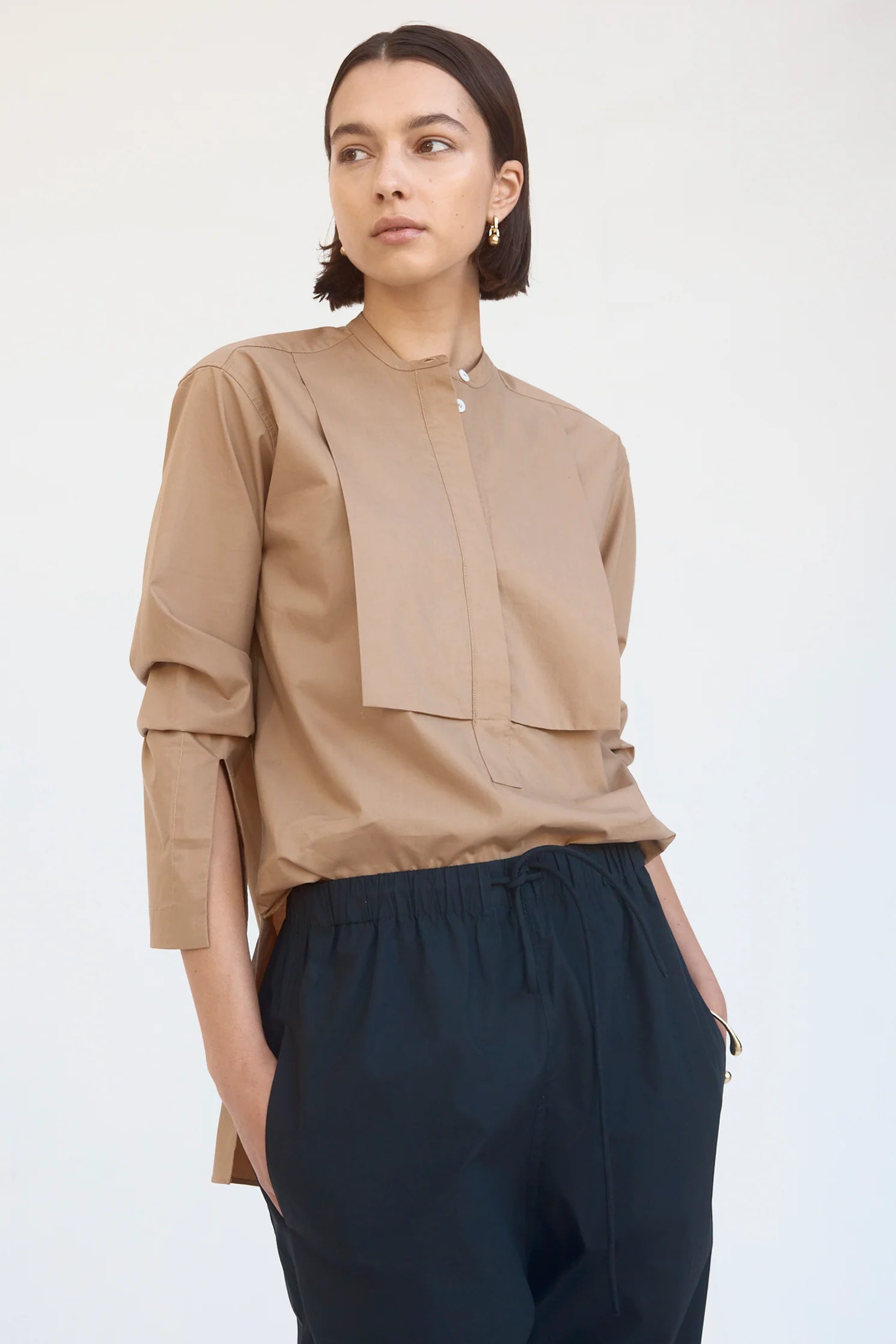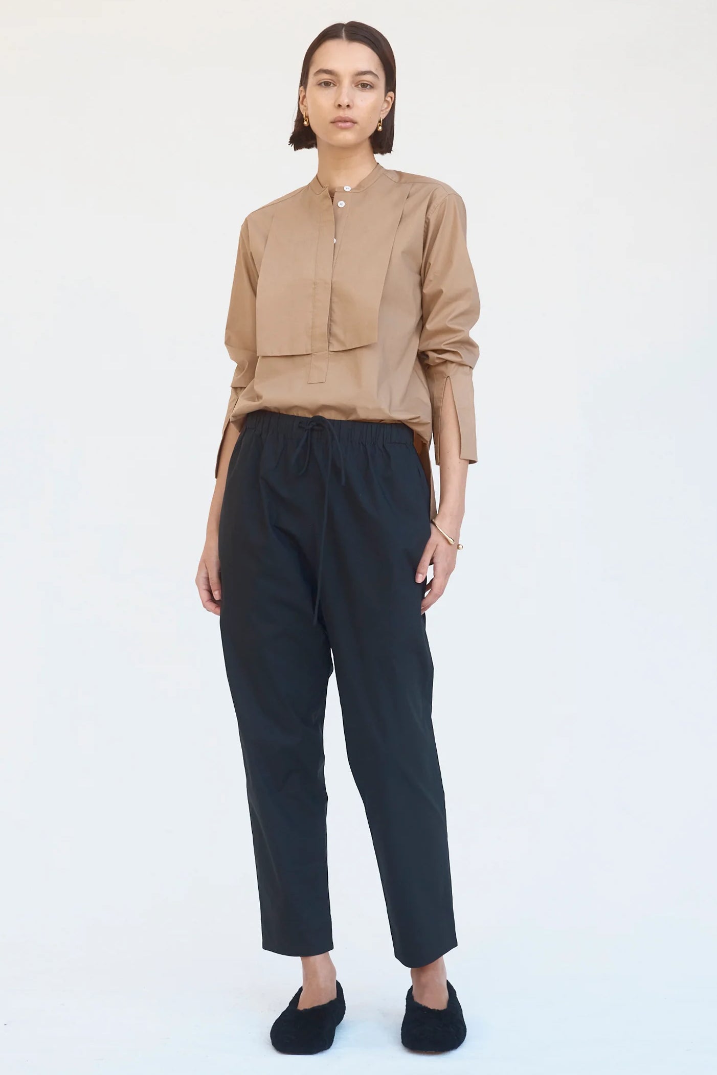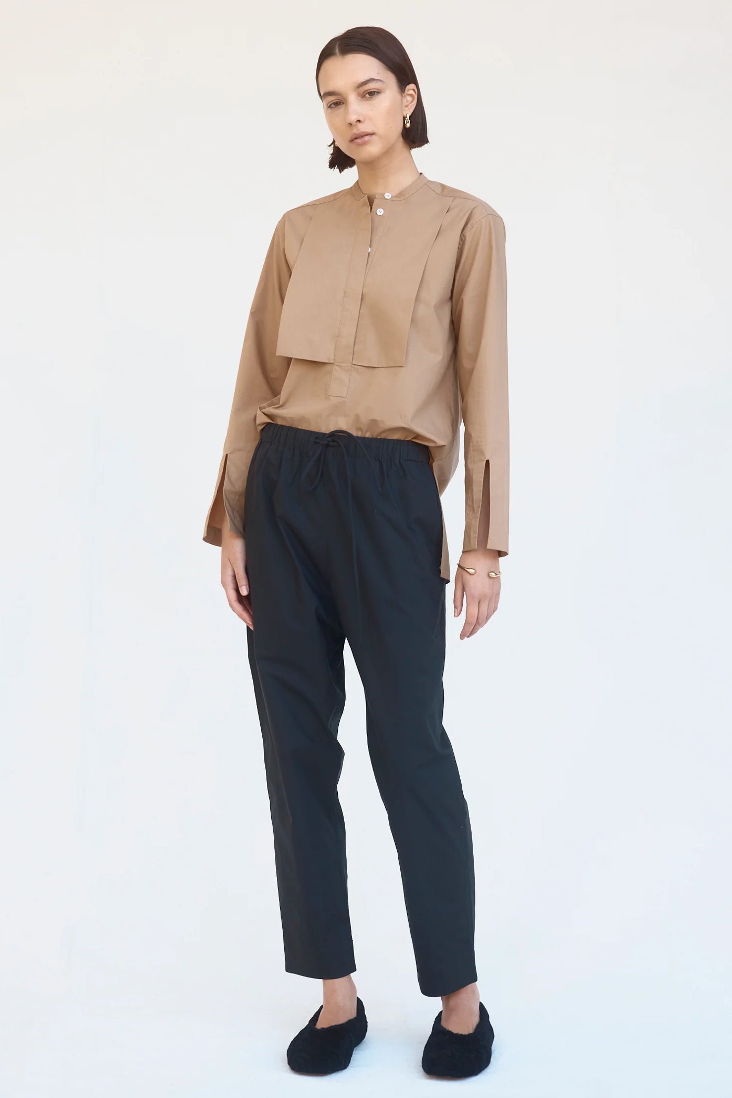 Designed with back patch pockets, a low crotch and subtle taper, these minimalist pants provide comfort and ease. Cut in cool cotton poplin and designed to sit on the high hip, they feature an elasticised waist with self-cover rope draw cord and practical twin side pockets.