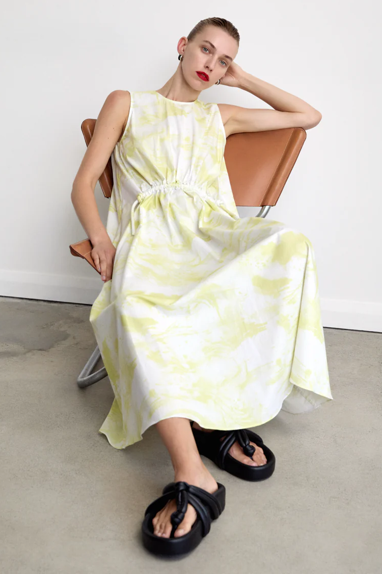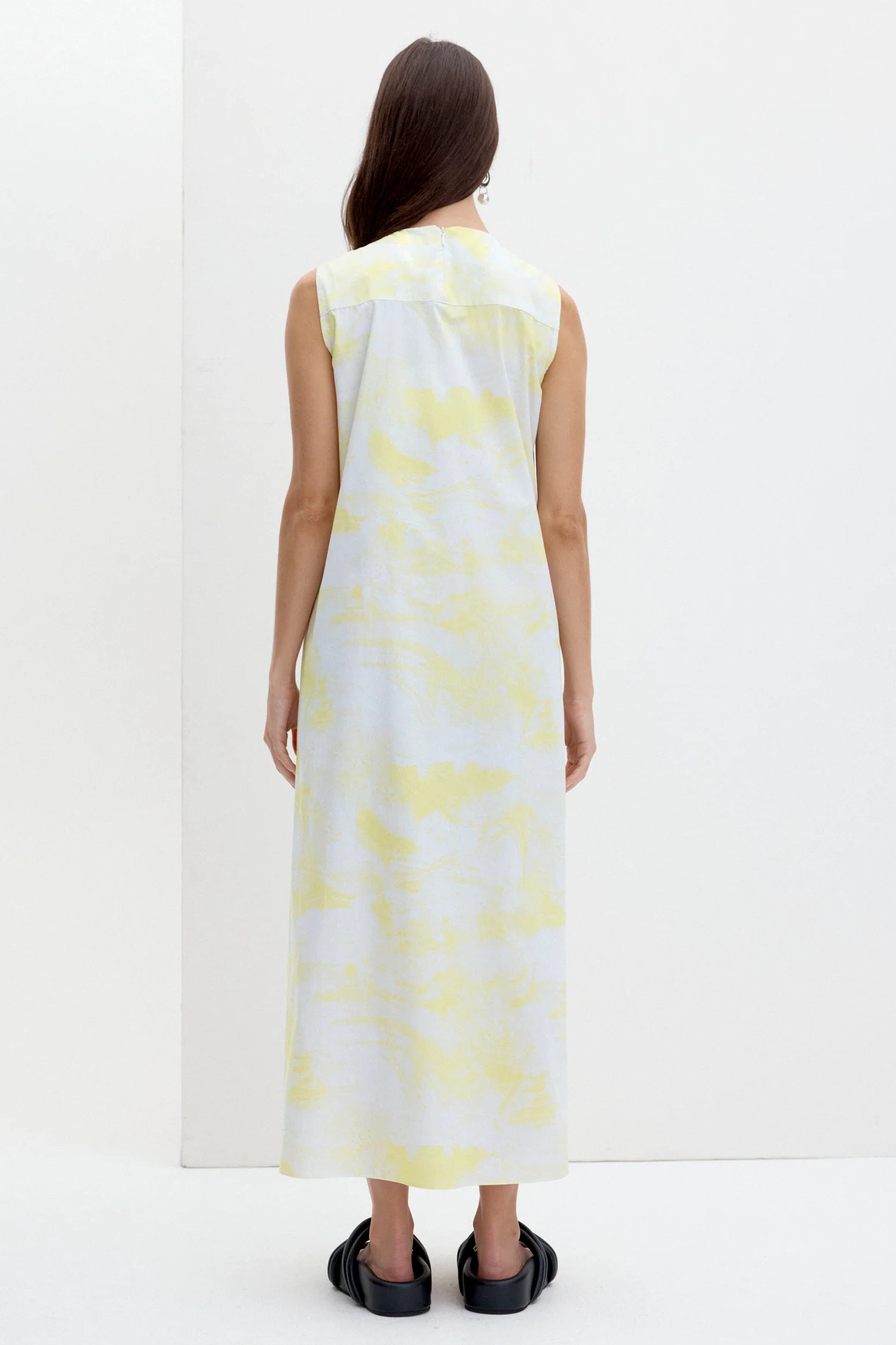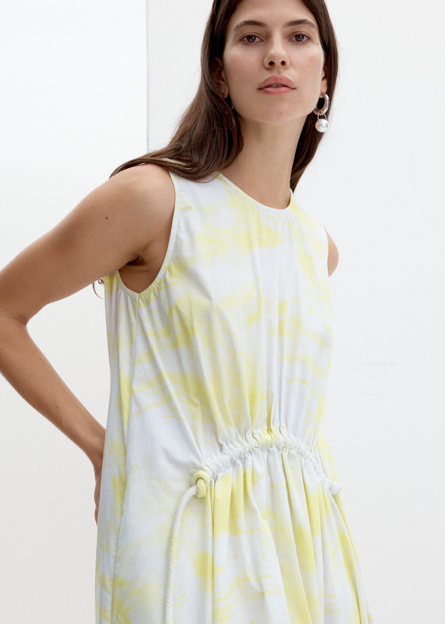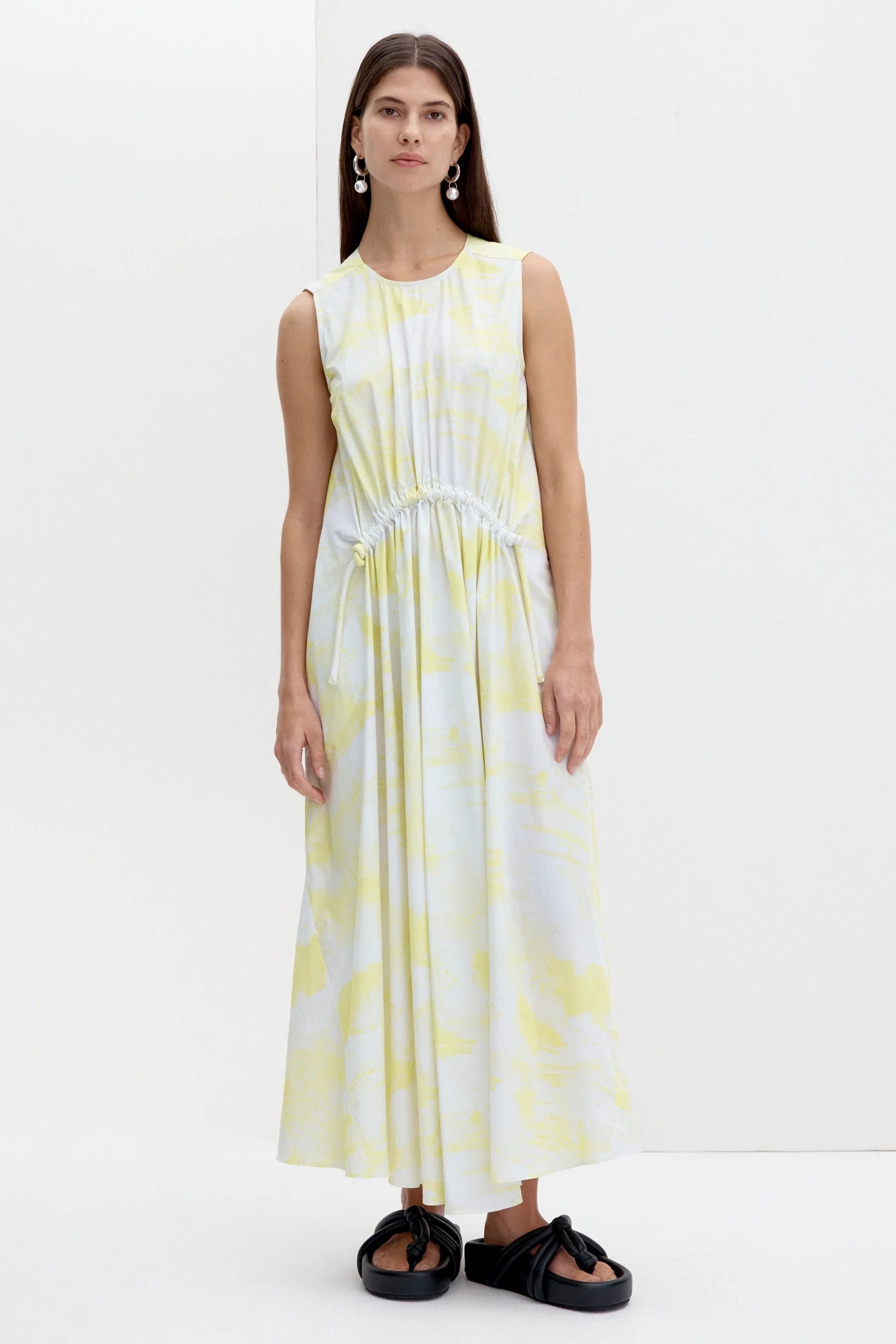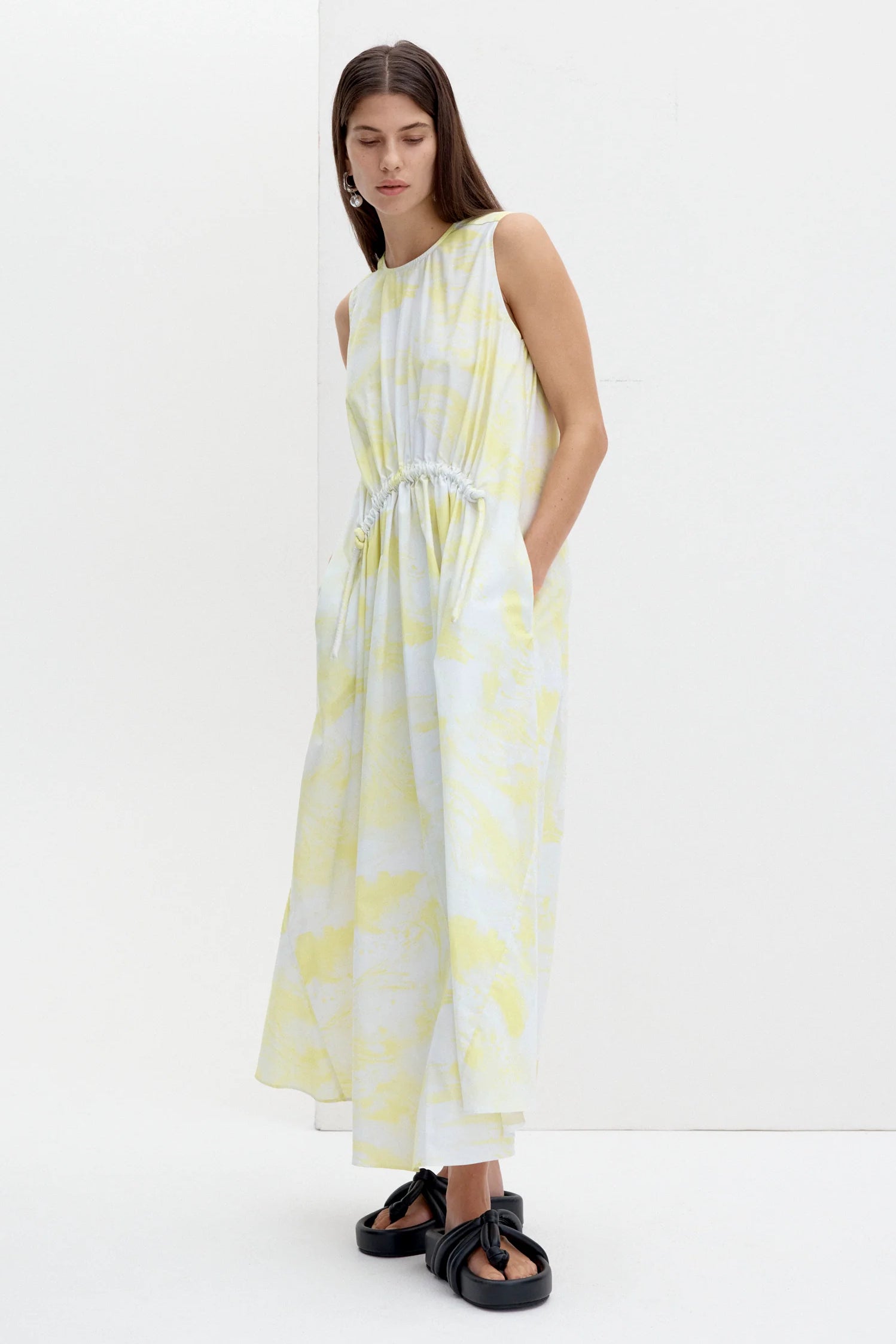 A round necked sleeveless tunic with an elongated body, back yoke and invisible side seam pockets. The stand out feature remains the curved channel gathered by self covered rope which creates a sculptural shape and form. Designed for day or night.