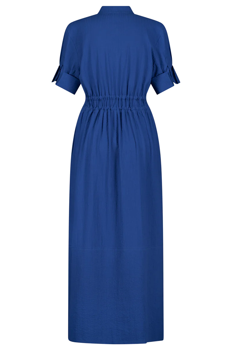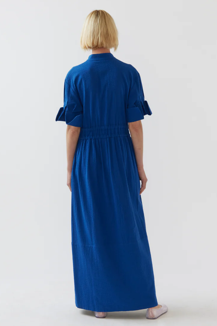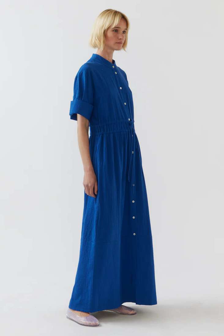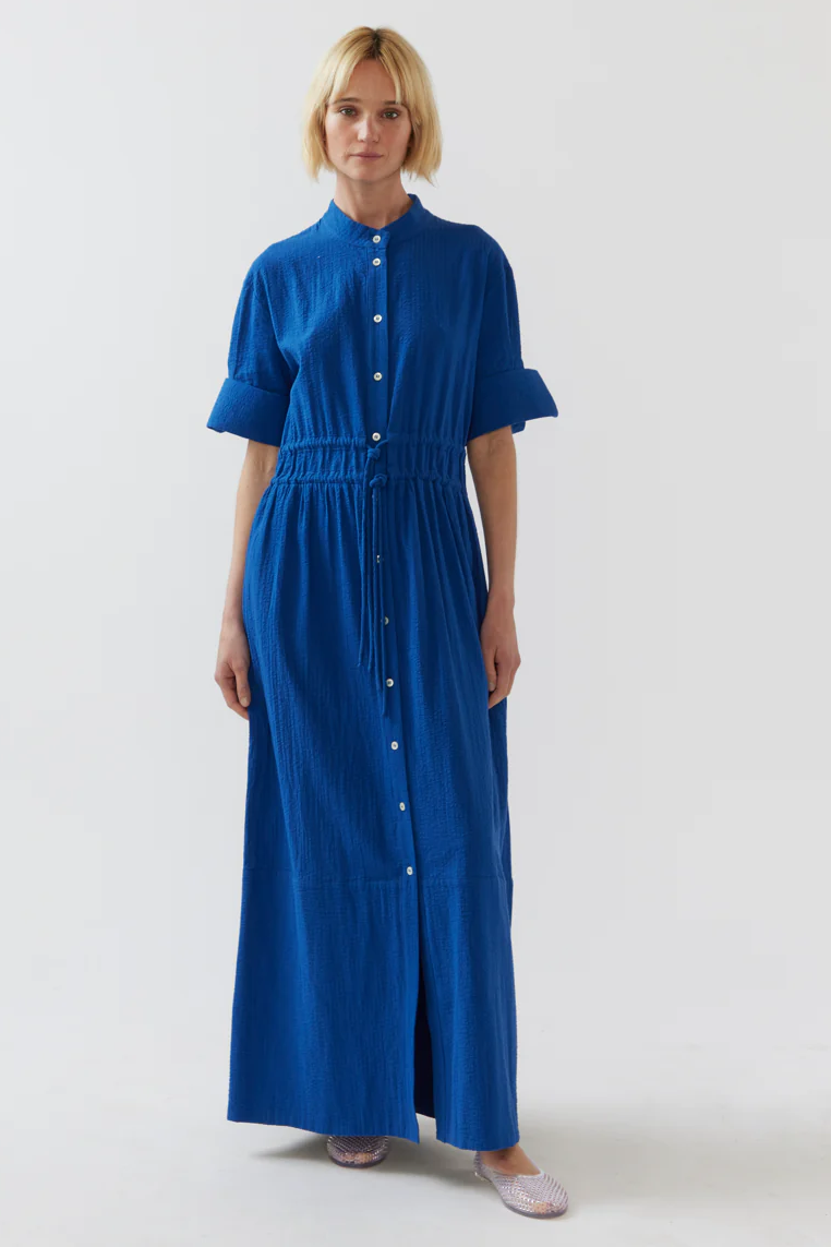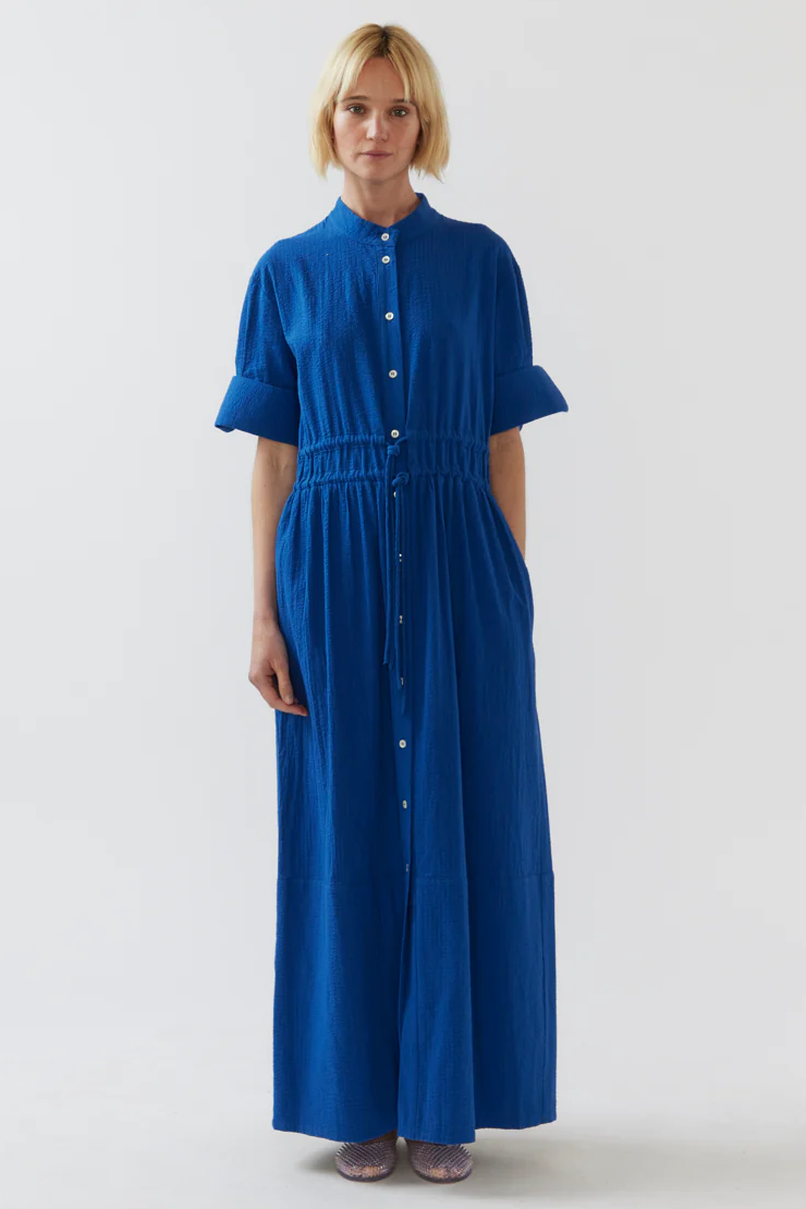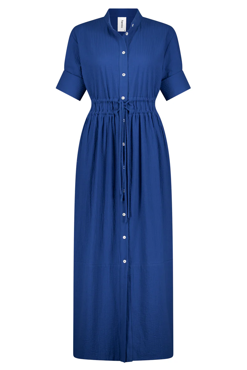 Encapsulating Foemina’s effortless spirit, this button down shirt dress is constructed with a mandarin collar, deep hem, side seam pockets and double cuffed short sleeves. The exposed placket is embellished with trocas shell buttons, while the double drawcord can be used to create texture and define your shape.