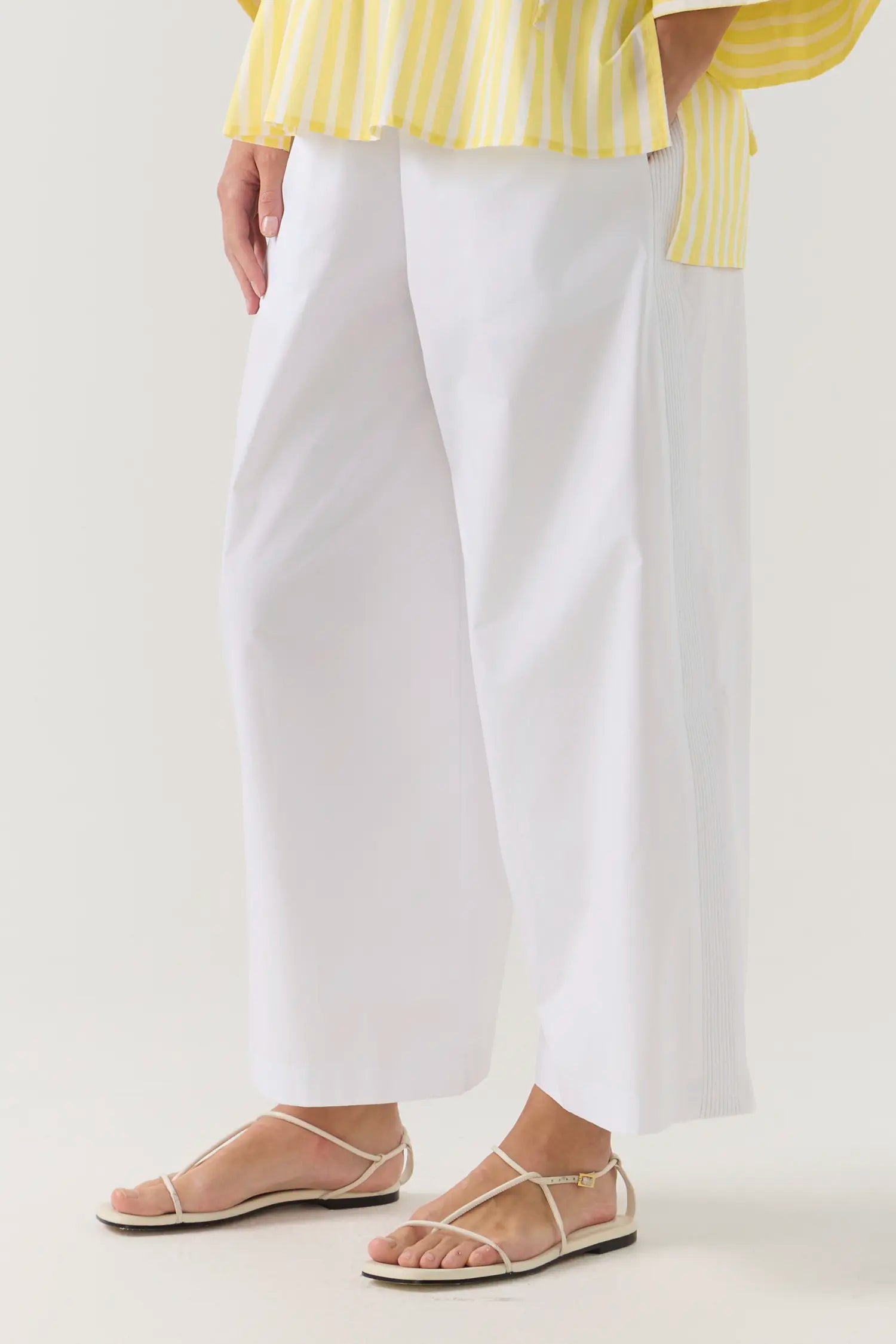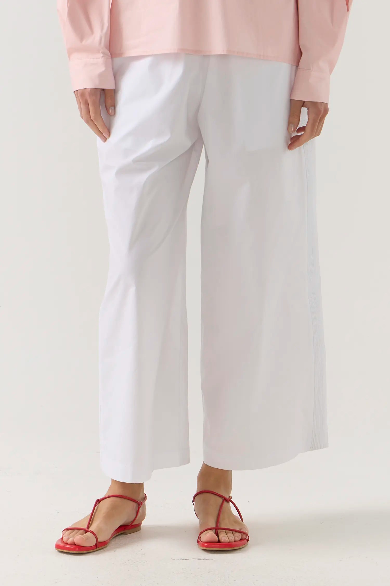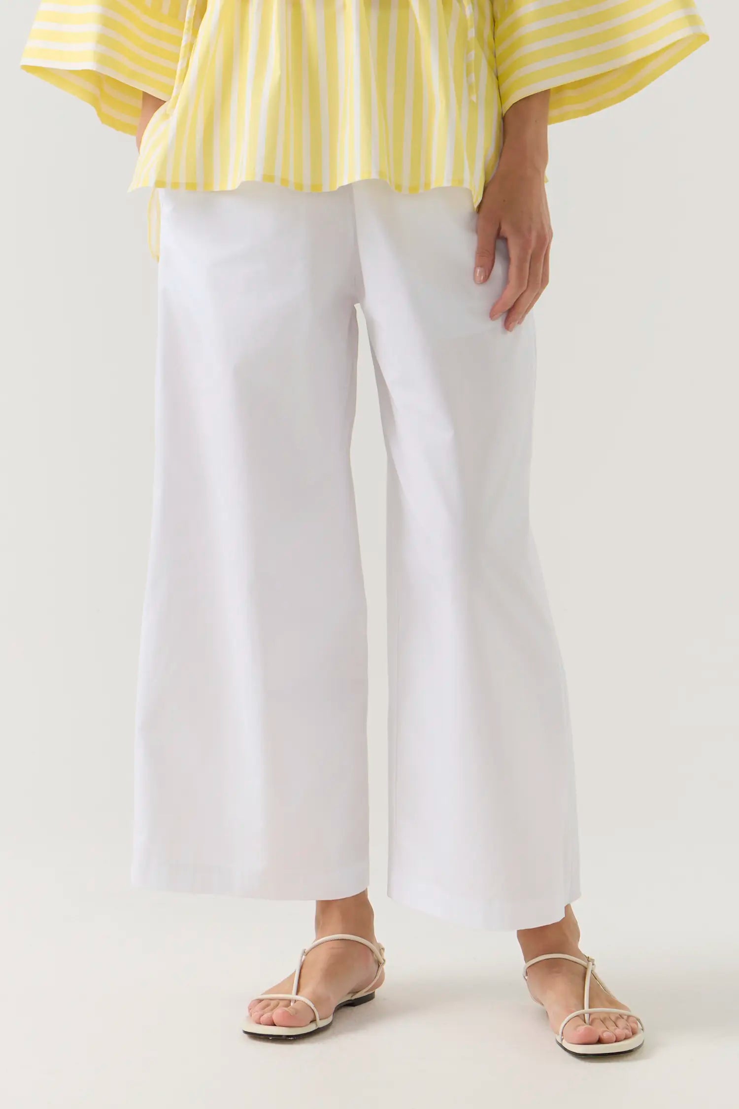 A refined essential designed with comfort in mind, the Sabine Pant is rendered in cotton poplin and features an elasticised front waistband for an effortless fit. Subtle ribbed detailing runs down the side seams, adding a sense of textural depth. Finished with functional touches including side seam pockets and back patch pockets, this wide-leg silhouette offers ease and versatility in equal measure.