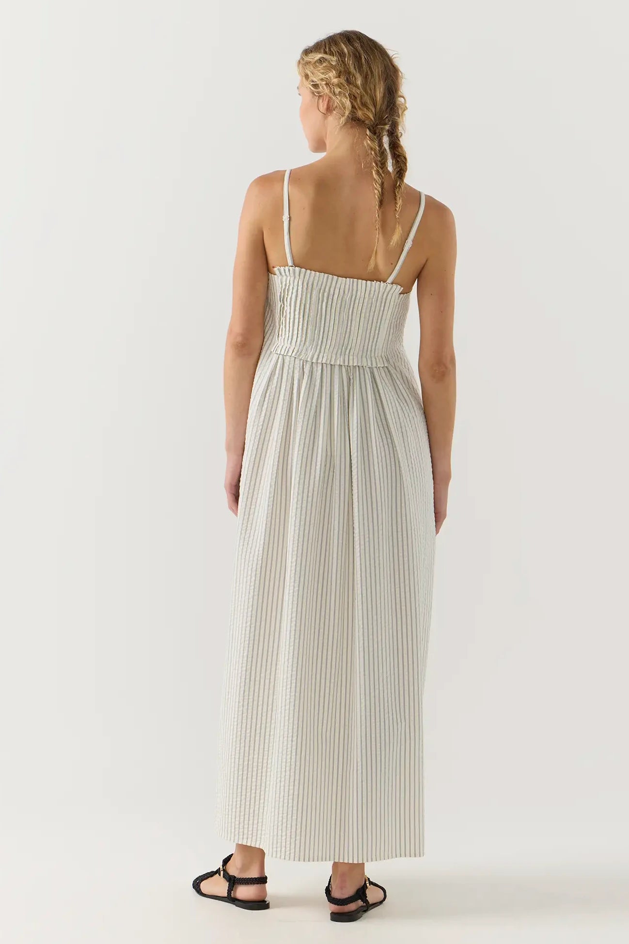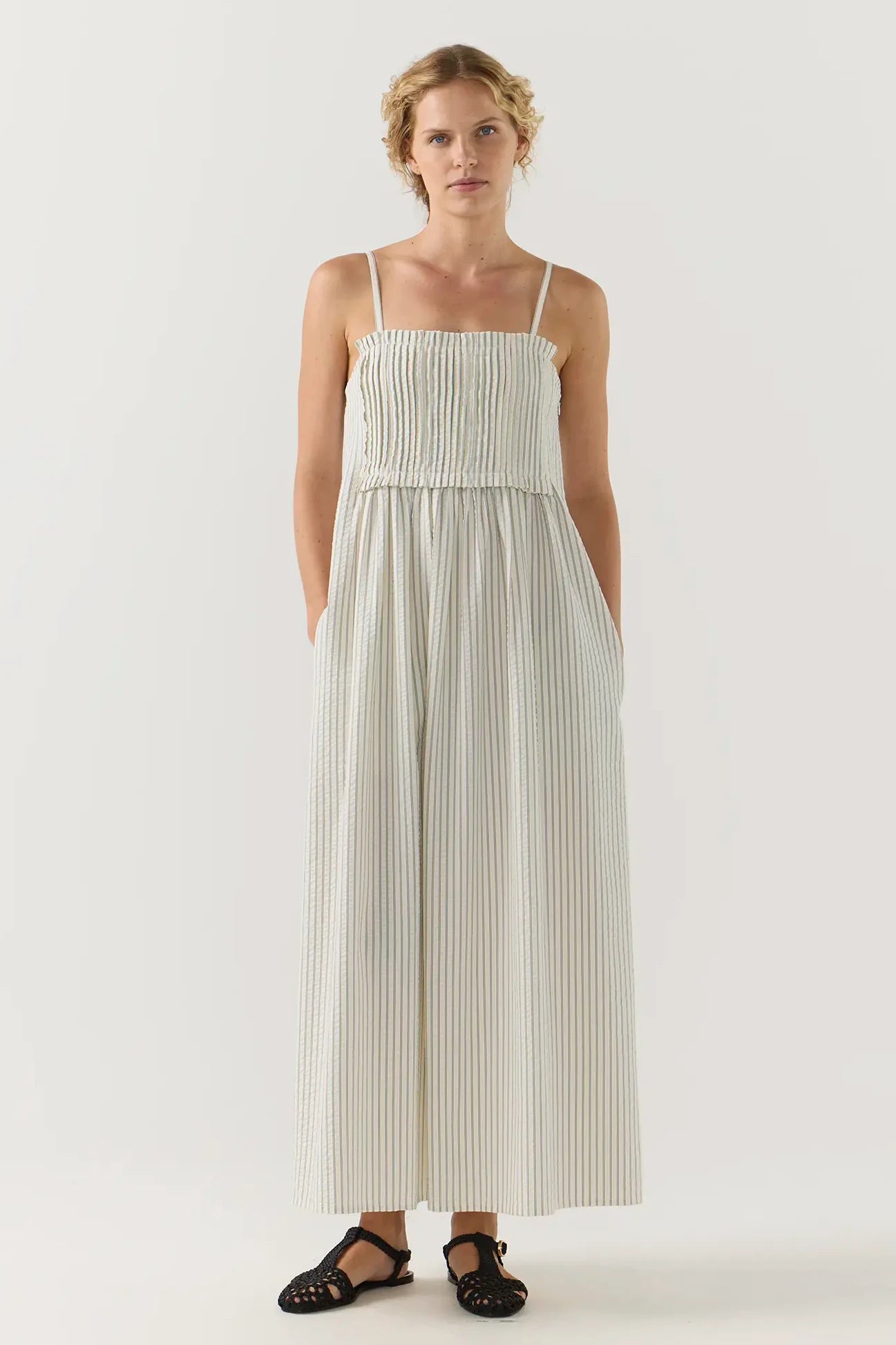 The Sloane Dress embraces structured volume and artisanal detailing in equal measure. Designed with slender straps and a distinctive pleated bodice, it falls into a full-length gathered skirt that moves with ease. Side seam pockets enhance its practicality, making this a bold yet feminine statement piece