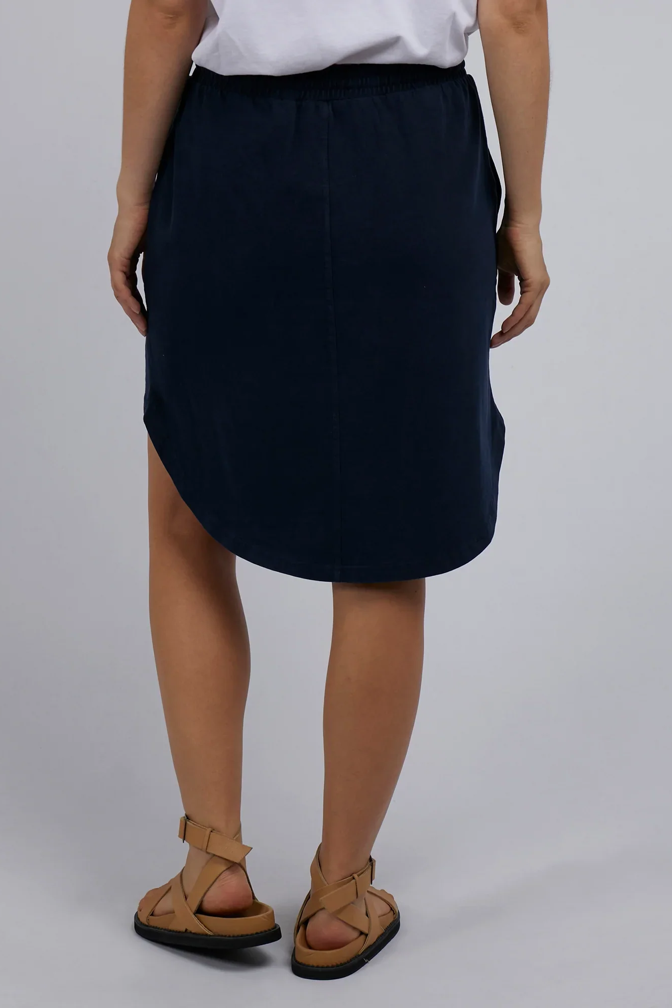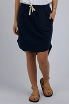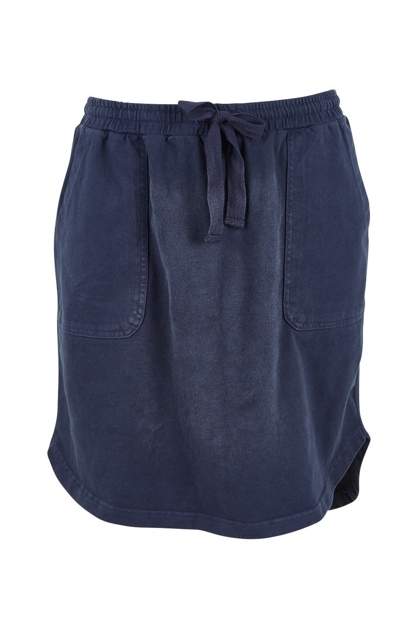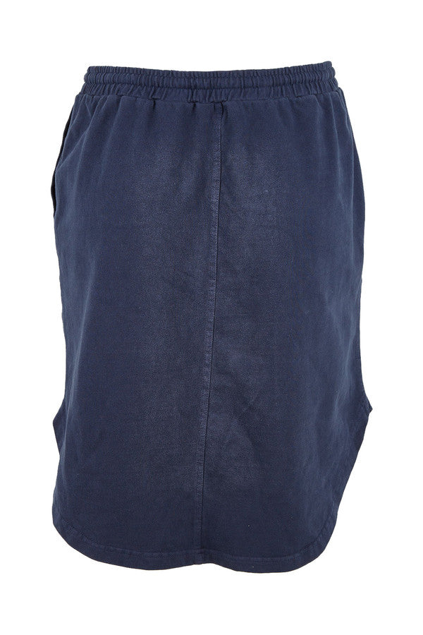 Cultivate a premium collection of comfortable casualwear with help from Australian clothing brand Foxwood. This pop on and go pigment dyed knee length skirt has an elastic waistband with herringbone waist tie and patch pockets making it easy to wear with tanks & tees, sandals or sneakers.