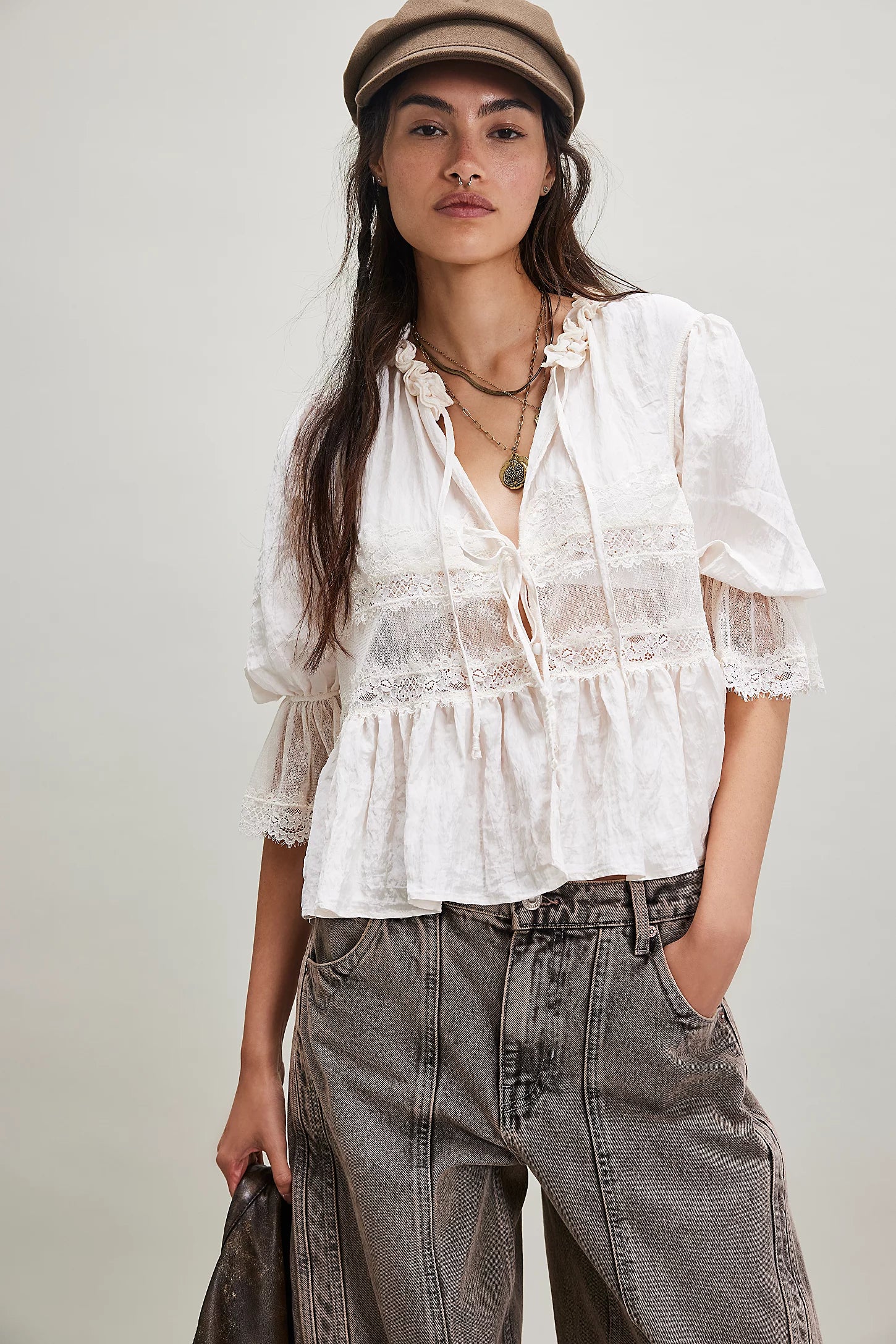 Effortlessly femme, this lace-adorned top features a soft fabrication and flattering silhouette with slightly puffy sleeves and a deep V-neckline. This simple top adds the perfect femme finishing touch to every ‘fit.