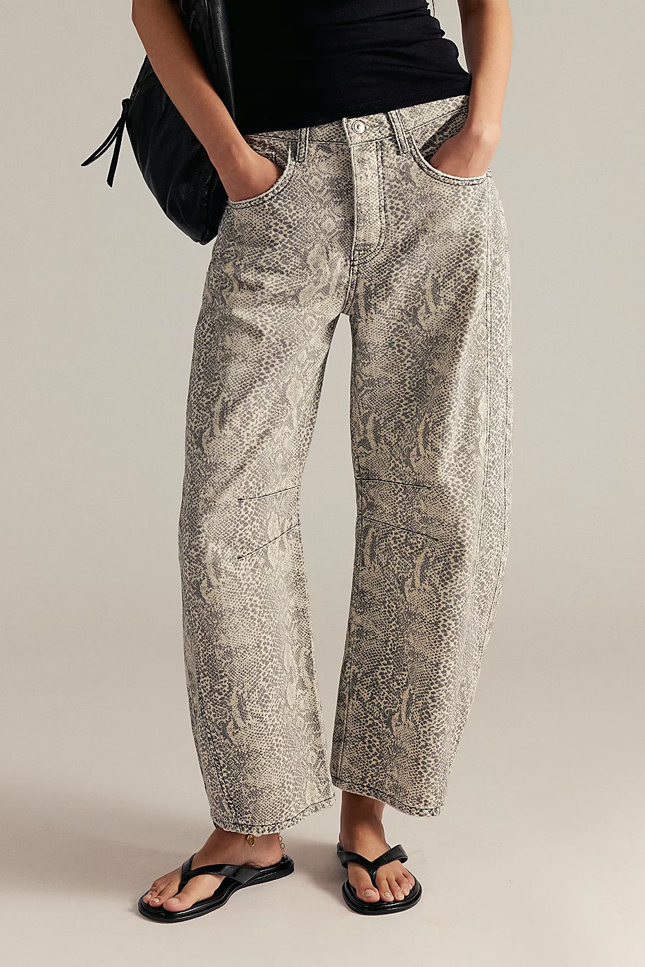 Our most-loved barrel jeans from our We The Free collection, now featured in a playful printed fabrication. So bold barrel jeans from our We The Free collection featured in a mid-rise fit with subtle distressed detailing and wide-legs that taper at the ankle. This playful pair of jeans is a fun silhouette to add to your denim collection — we recommend ordering your true size for a traditional fit, or sizing up for a low-slung, baggy style.