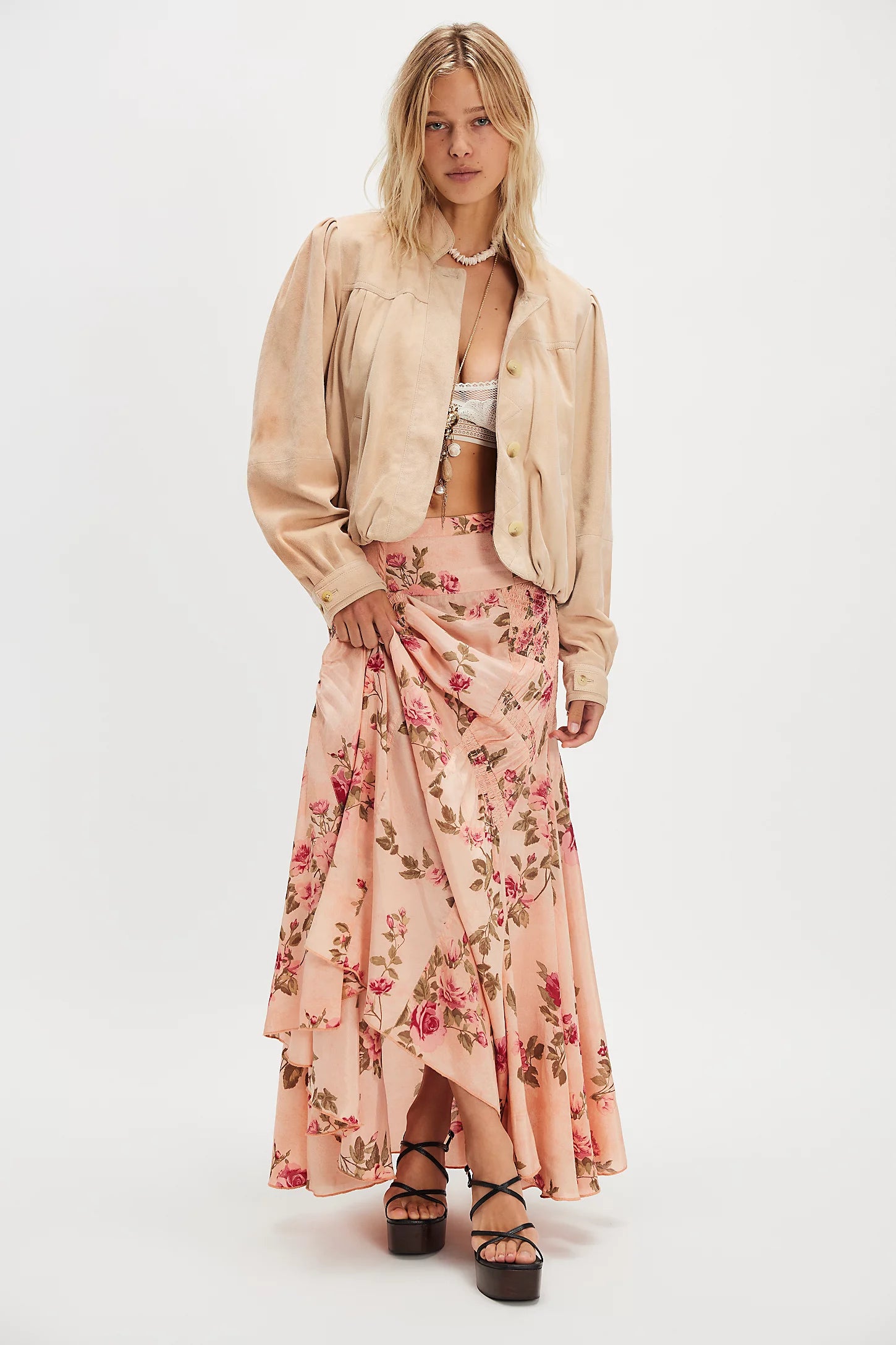 So fresh in florals, this bold maxi skirt features a classic rose print throughout with shirred paneling and textured piecing throughout for added dimension.