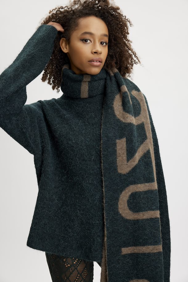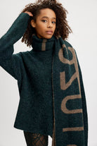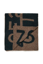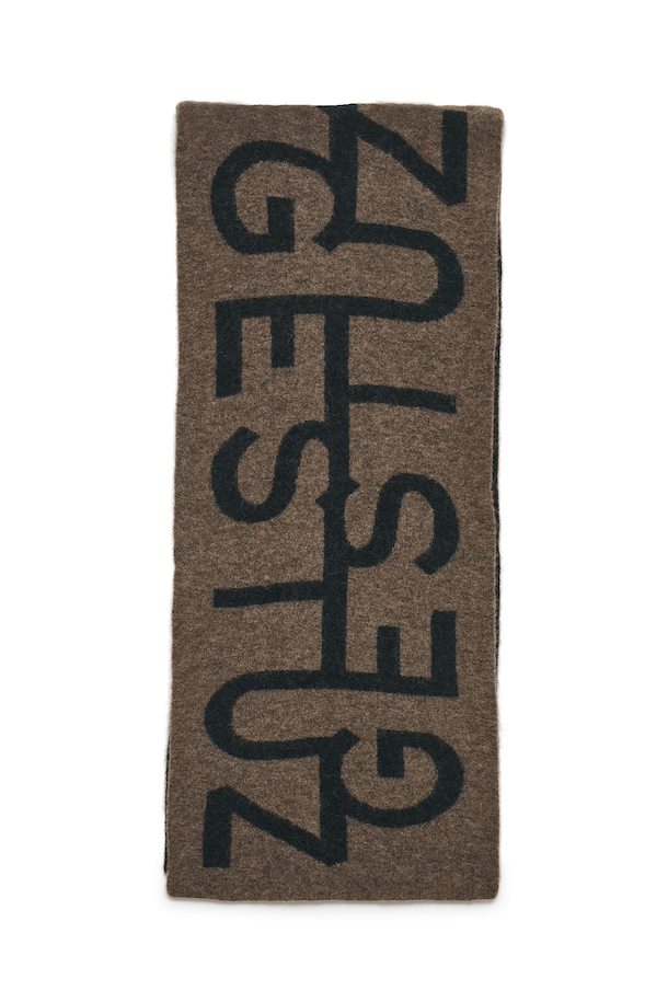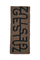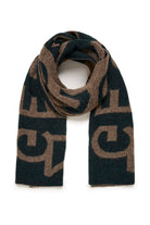 Taupe and Black ‘AlphaGZ’ scarf from Gestuz. Made of a blend of alpaca wool, wool and recycled material, this item showcases a logo pattern.