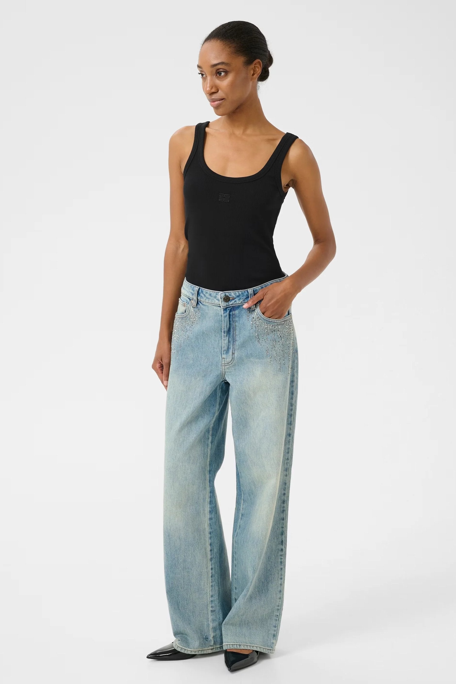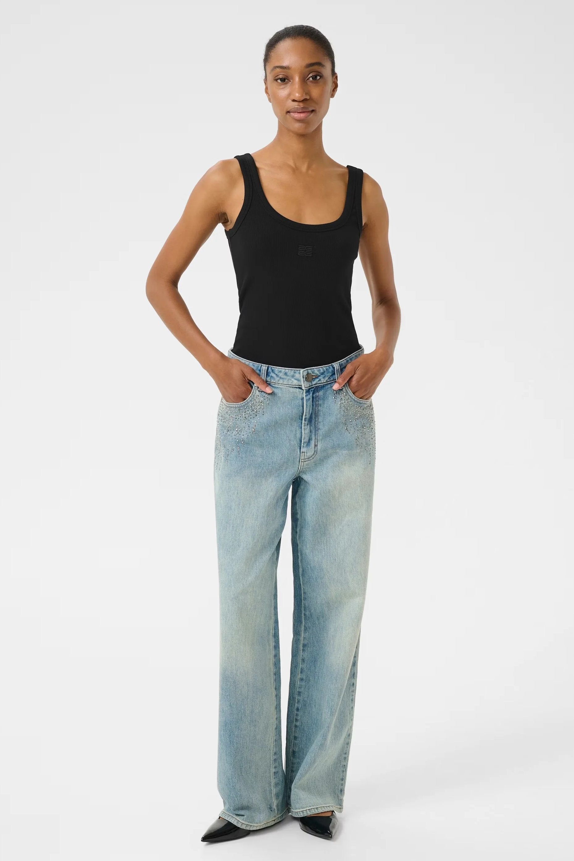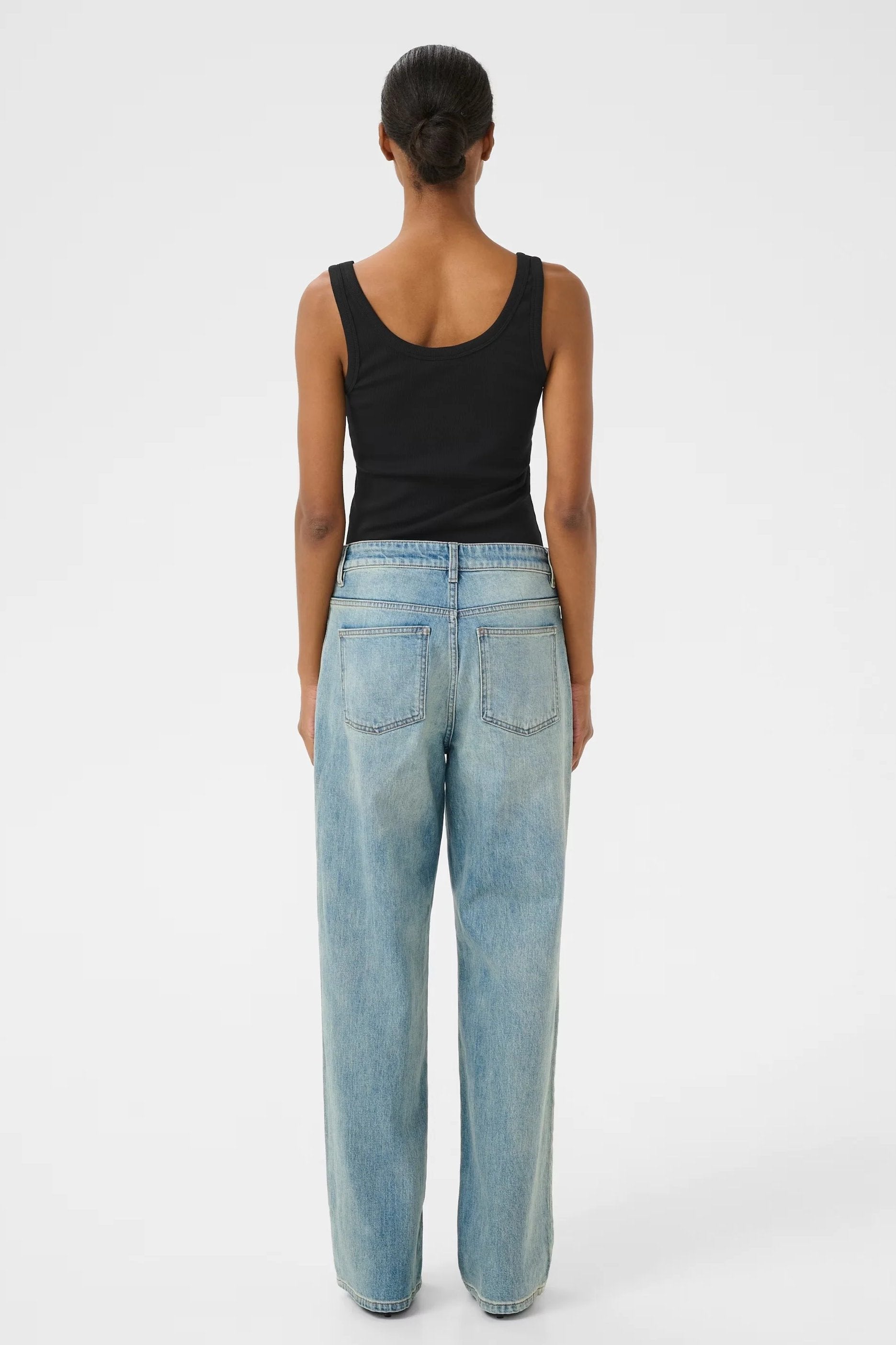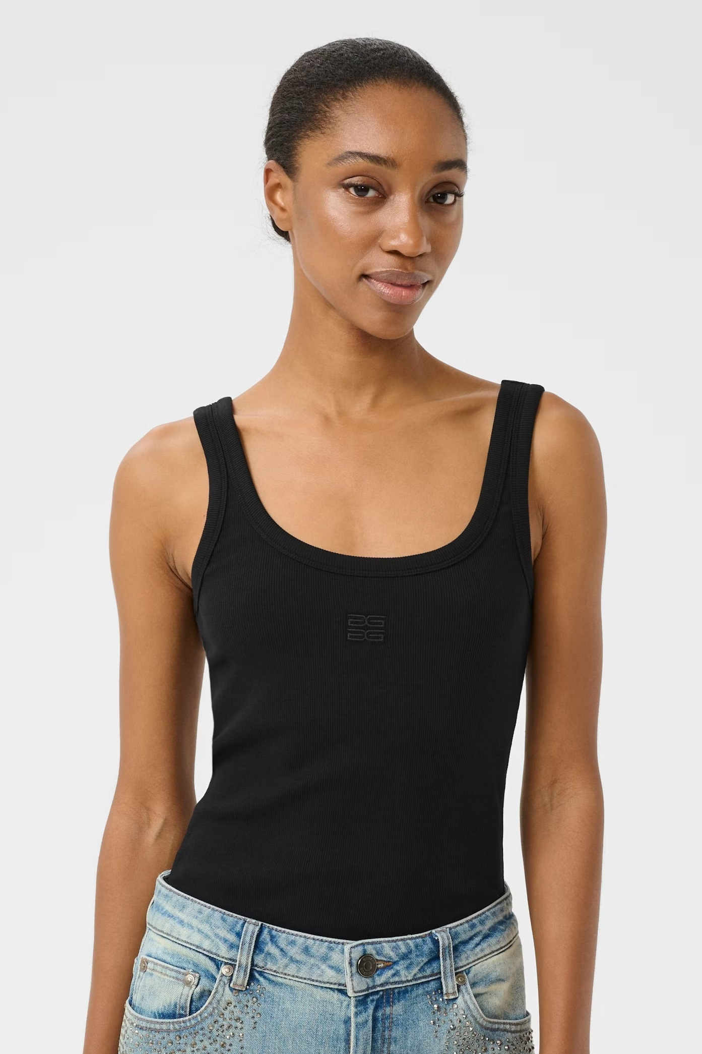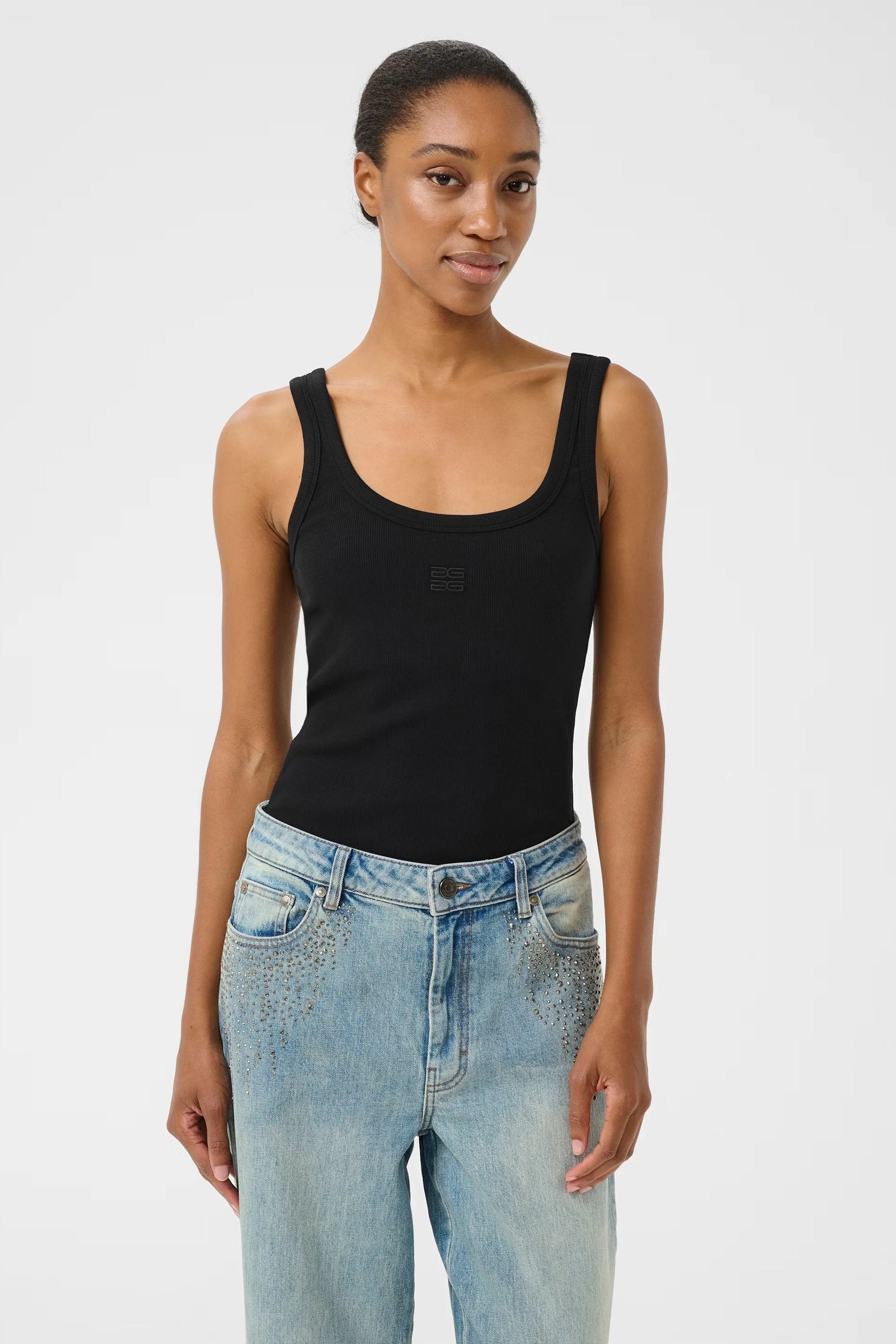 - Rib scoop neck signature tank. Finished with external bind, with double scoop neckline.