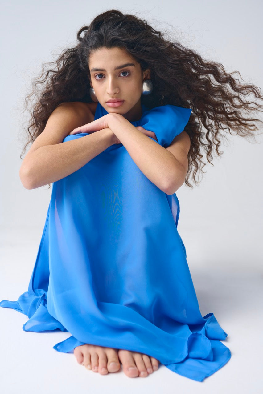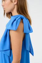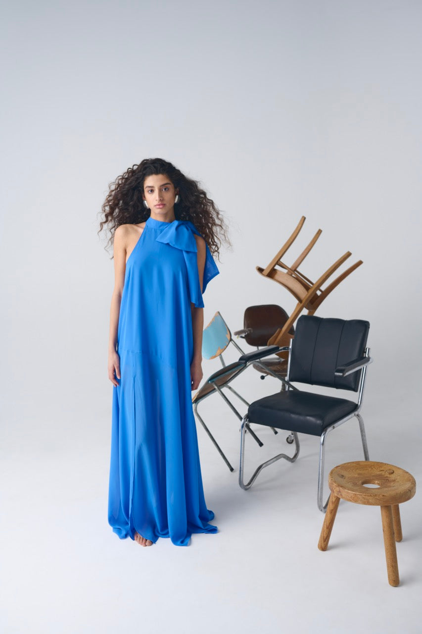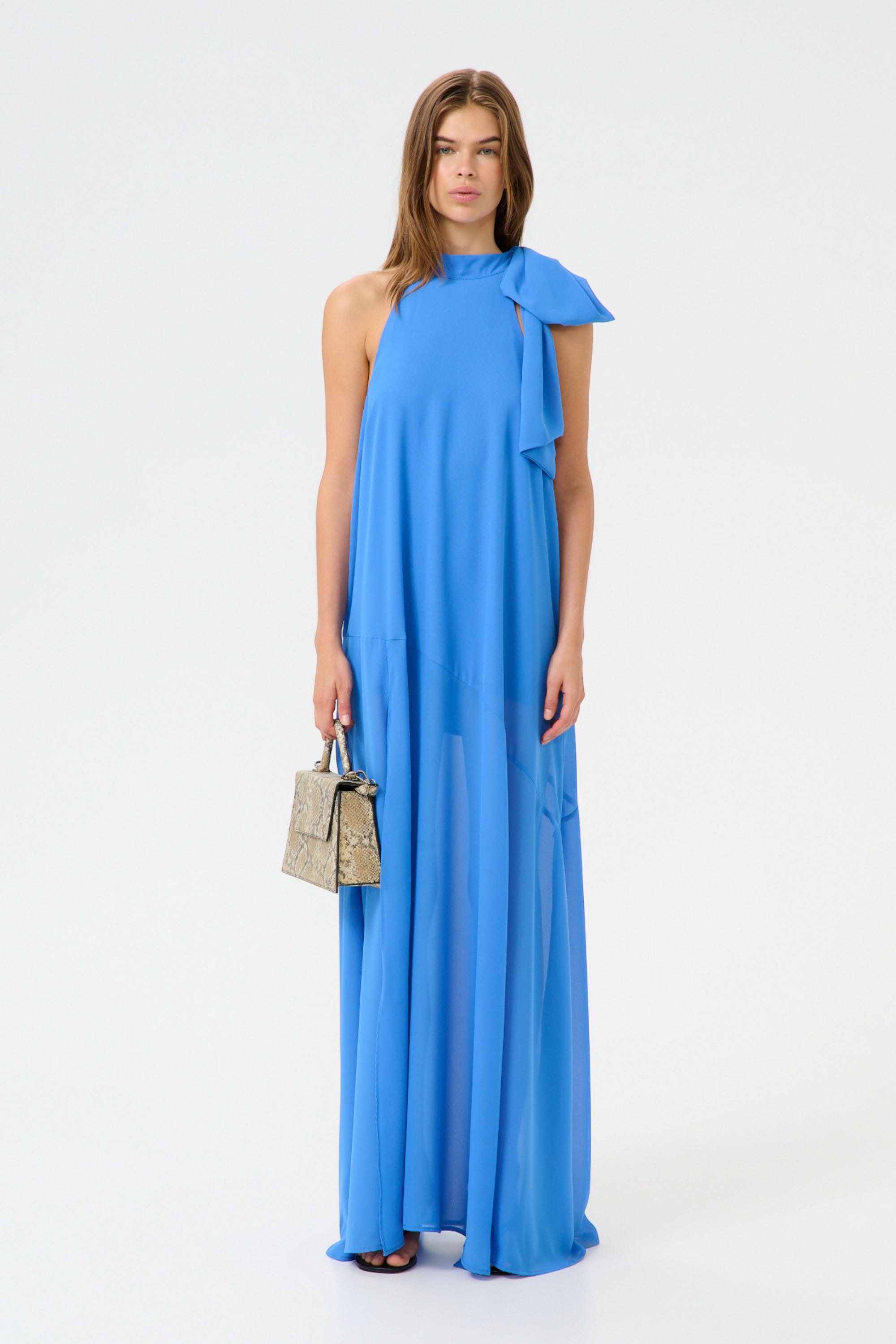 Sleeveless long dress with a loose, flowing fit, shoulder bow detail, and high side slit. The softly draped design offers elegant movement and a feminine silhouette.