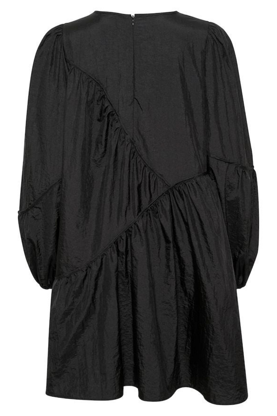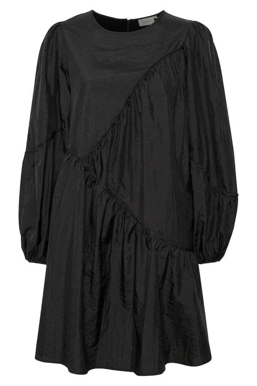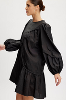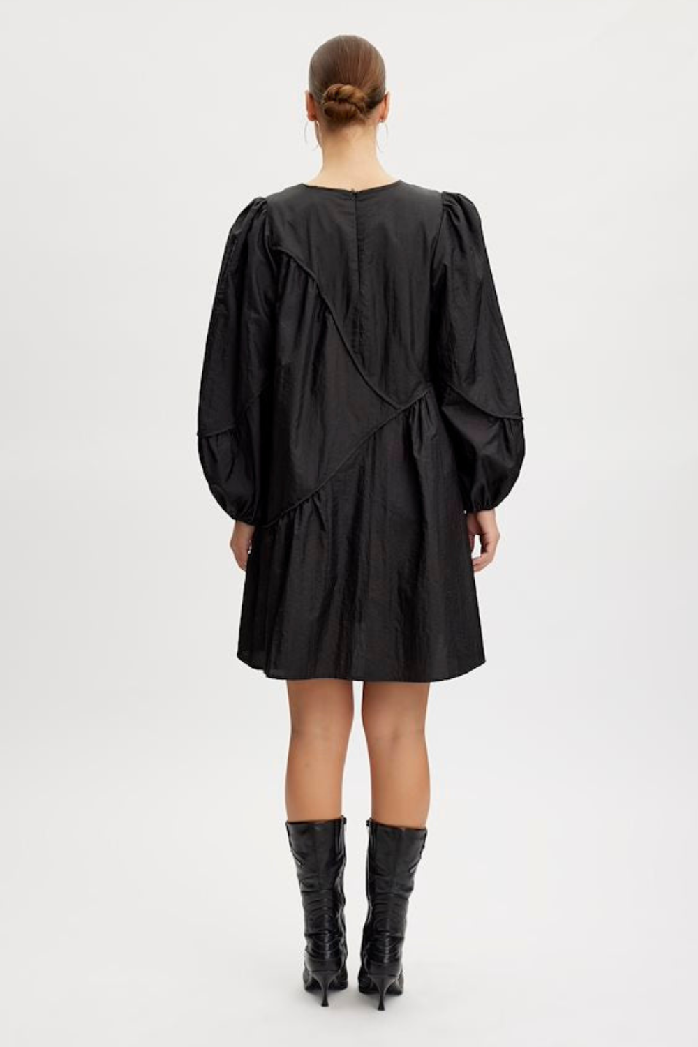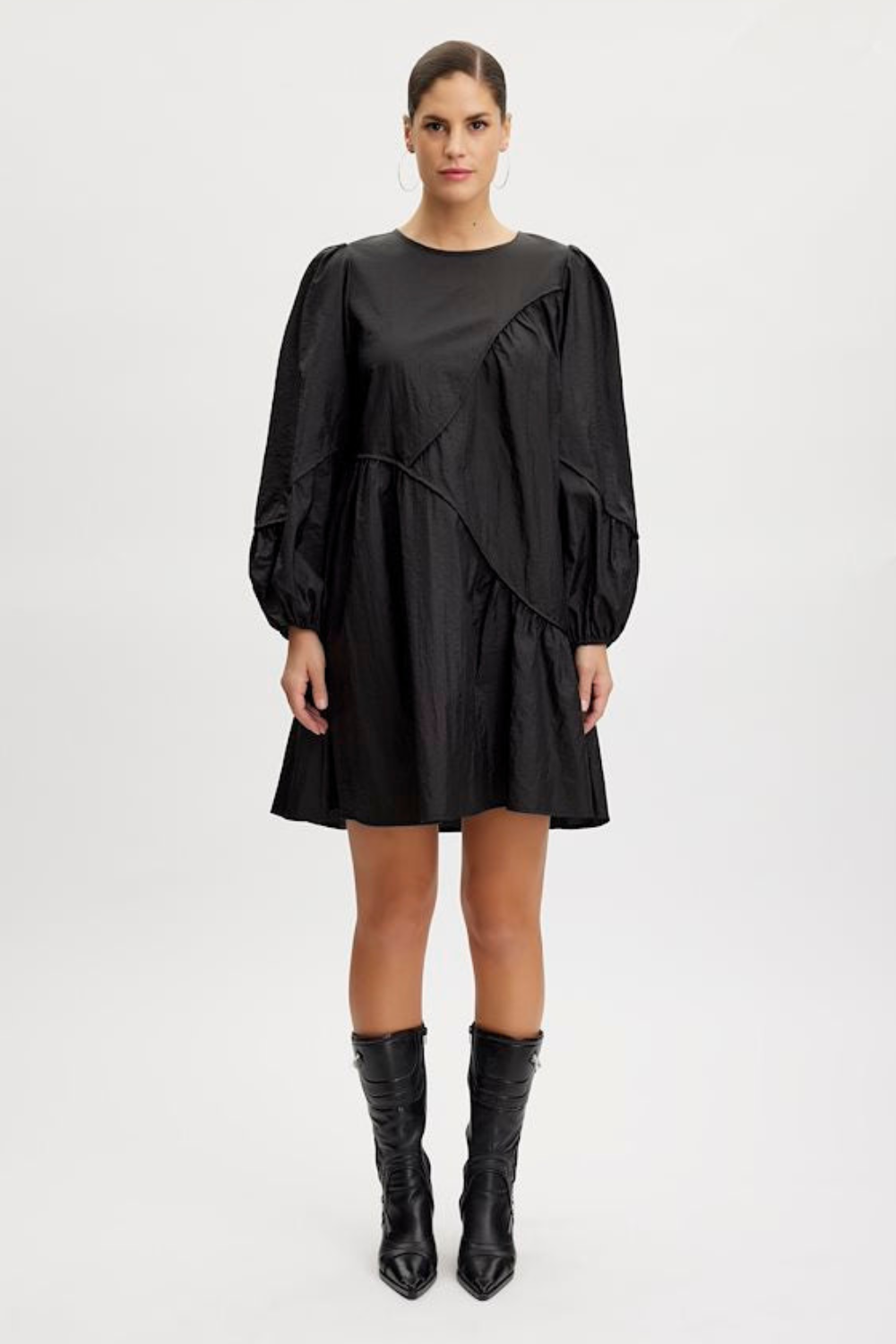 This patchwork-inspired knee-length dress has a unique design with creative details. In an oversized fit with an A-line structure, puff sleeves, exposed seams, asymmetrical gathered hemline and back zipper closure. Style with high-heeled boots or chunky wedges for a dynamic, feminine look.