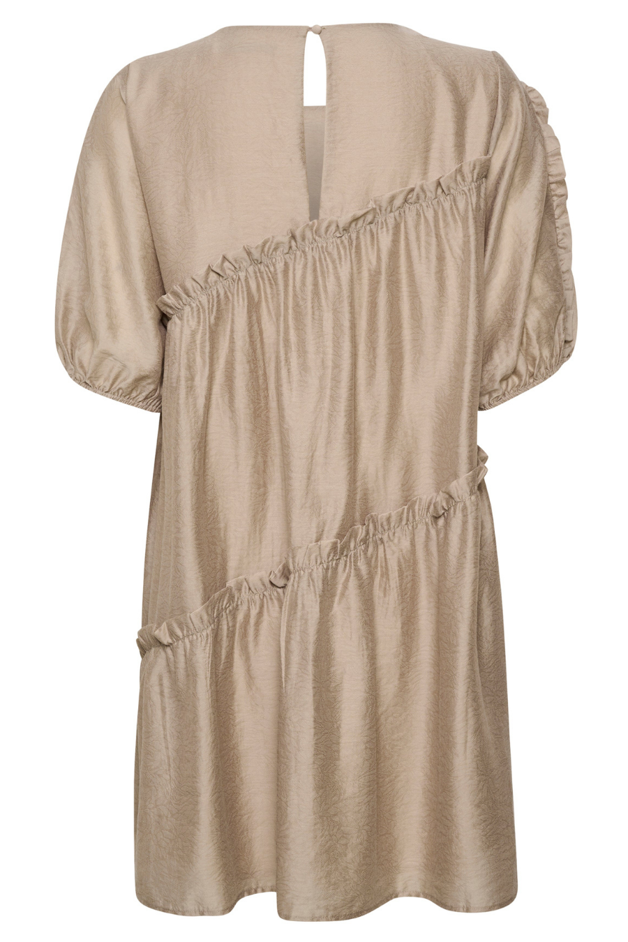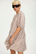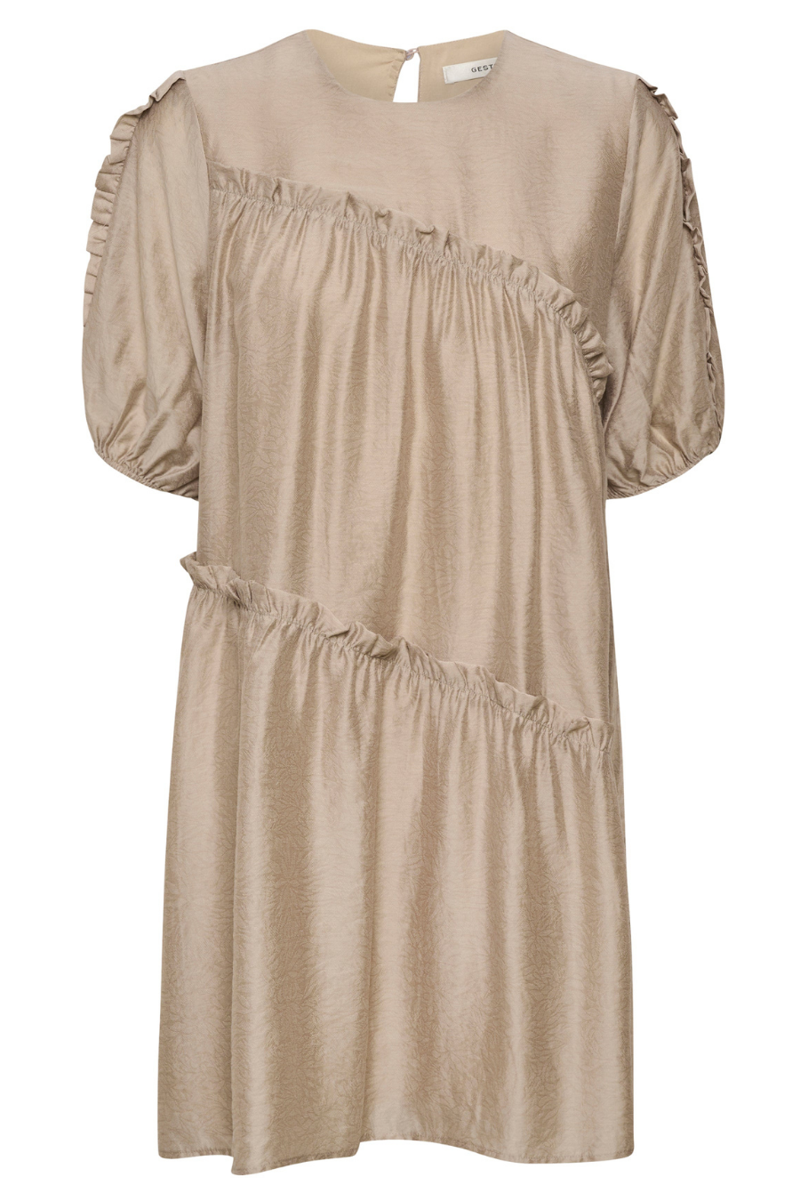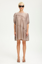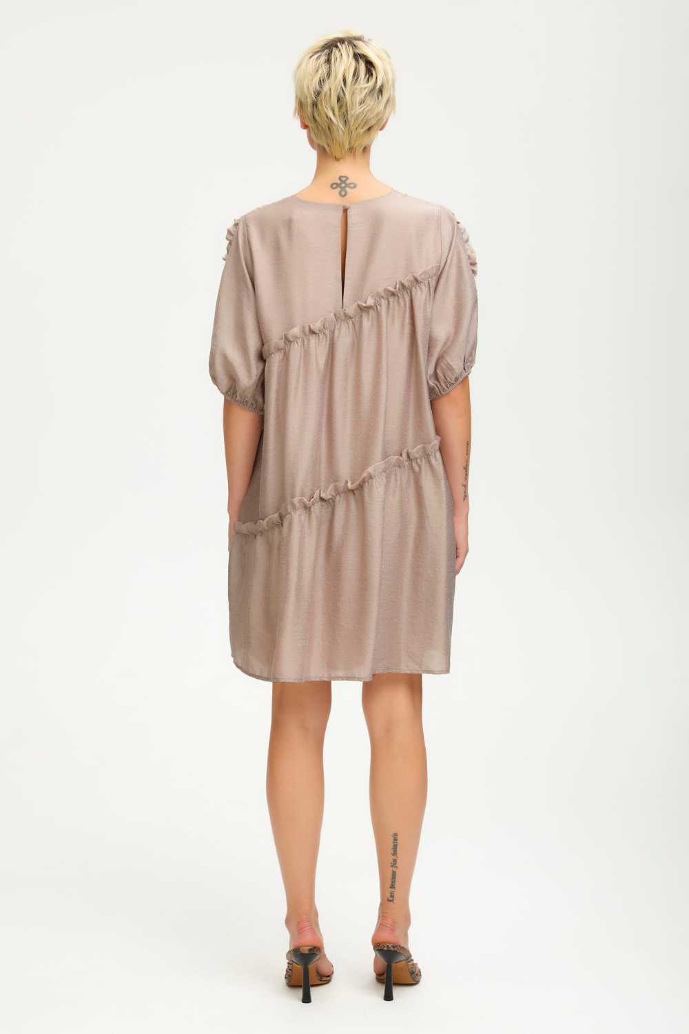 A fashion-forward short dress with unique stitching details. Designed for a relaxed fit, with crew neck, puff sleeves, asymmetrical tiered layers, gathered heading ruffles, and a back keyhole button closure. In a luminescent jacquard fabric responsibly made with Tencel from Lenzing. Style with luxury sneakers.