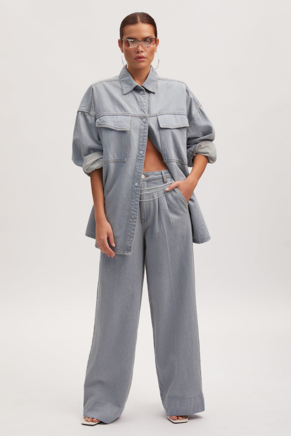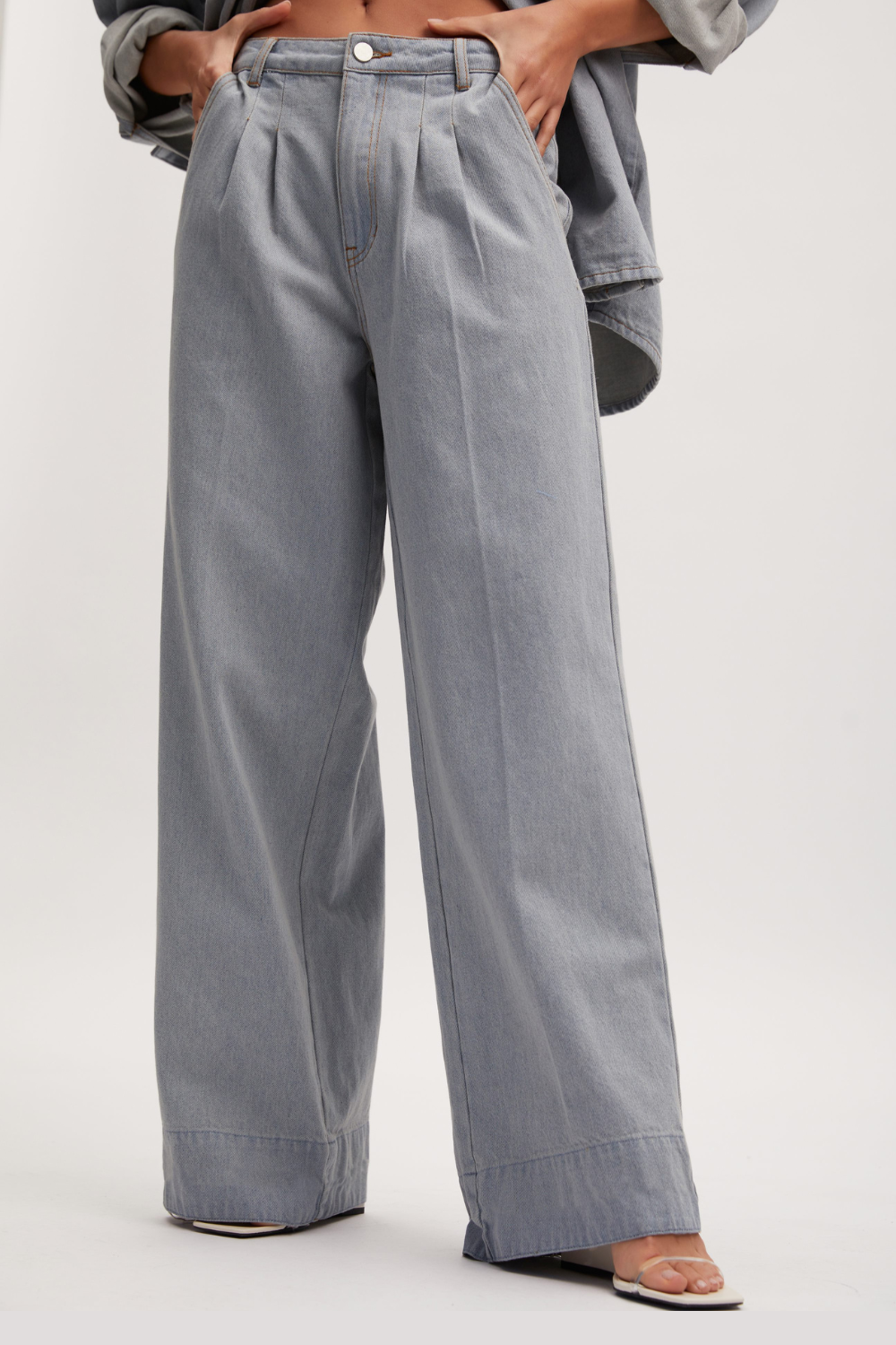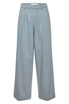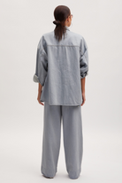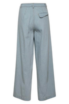 These high waisted, wide leg pants come in a cool tint for spring. With front darts, belt loops, seam details at the hem, and a single back pocket with an asymmetrical flap. Made with a responsible blend with recycled cotton. Style with the Zelda Shirt for a complete look.
