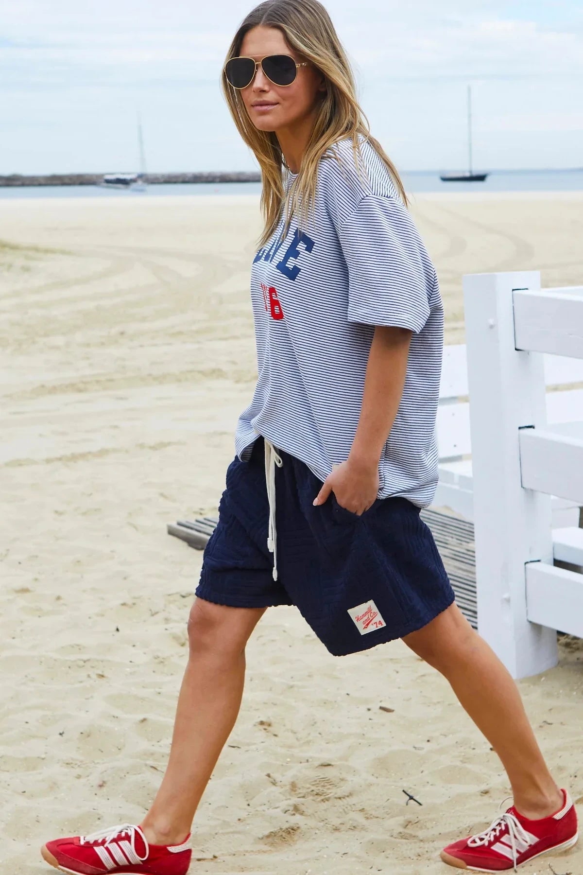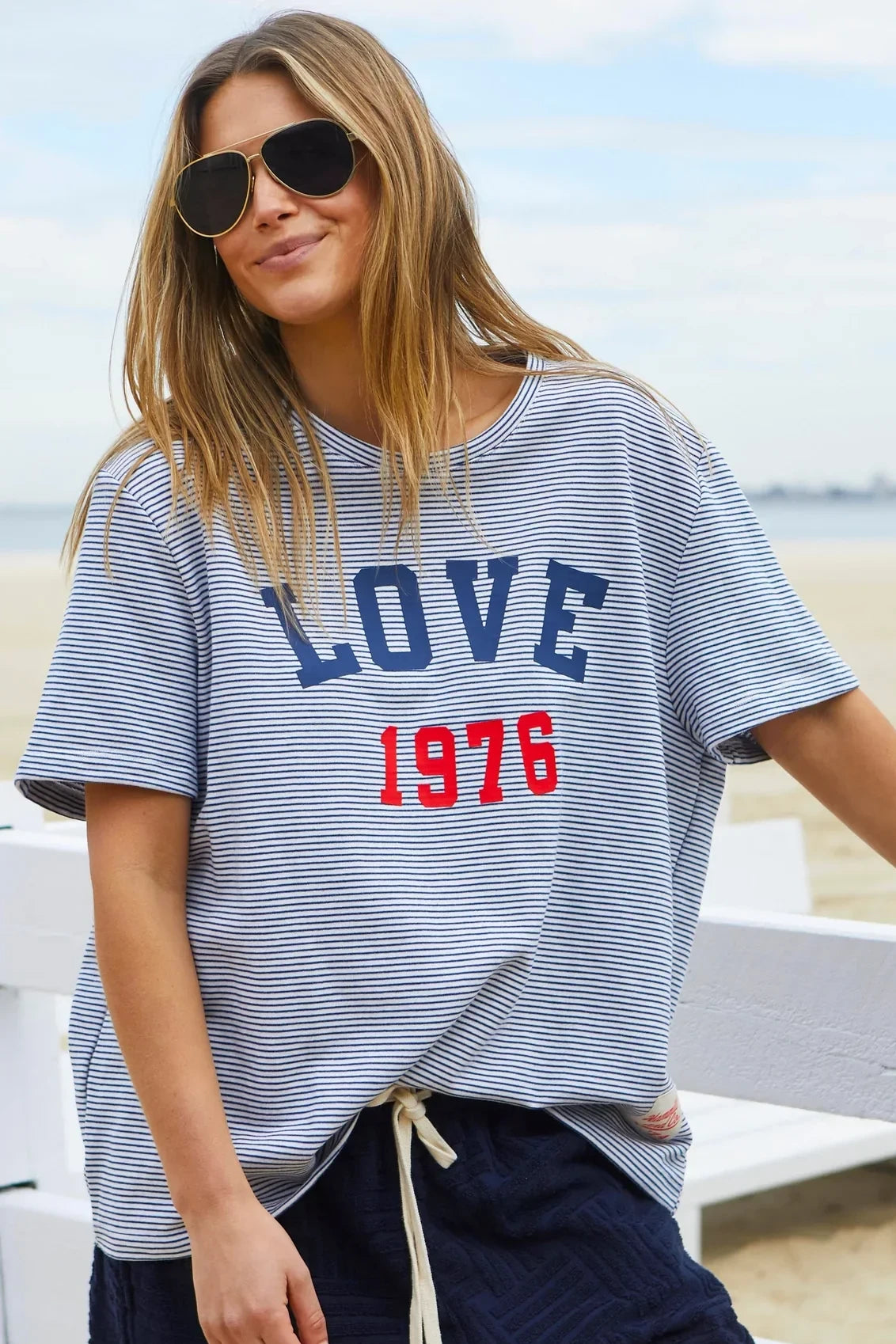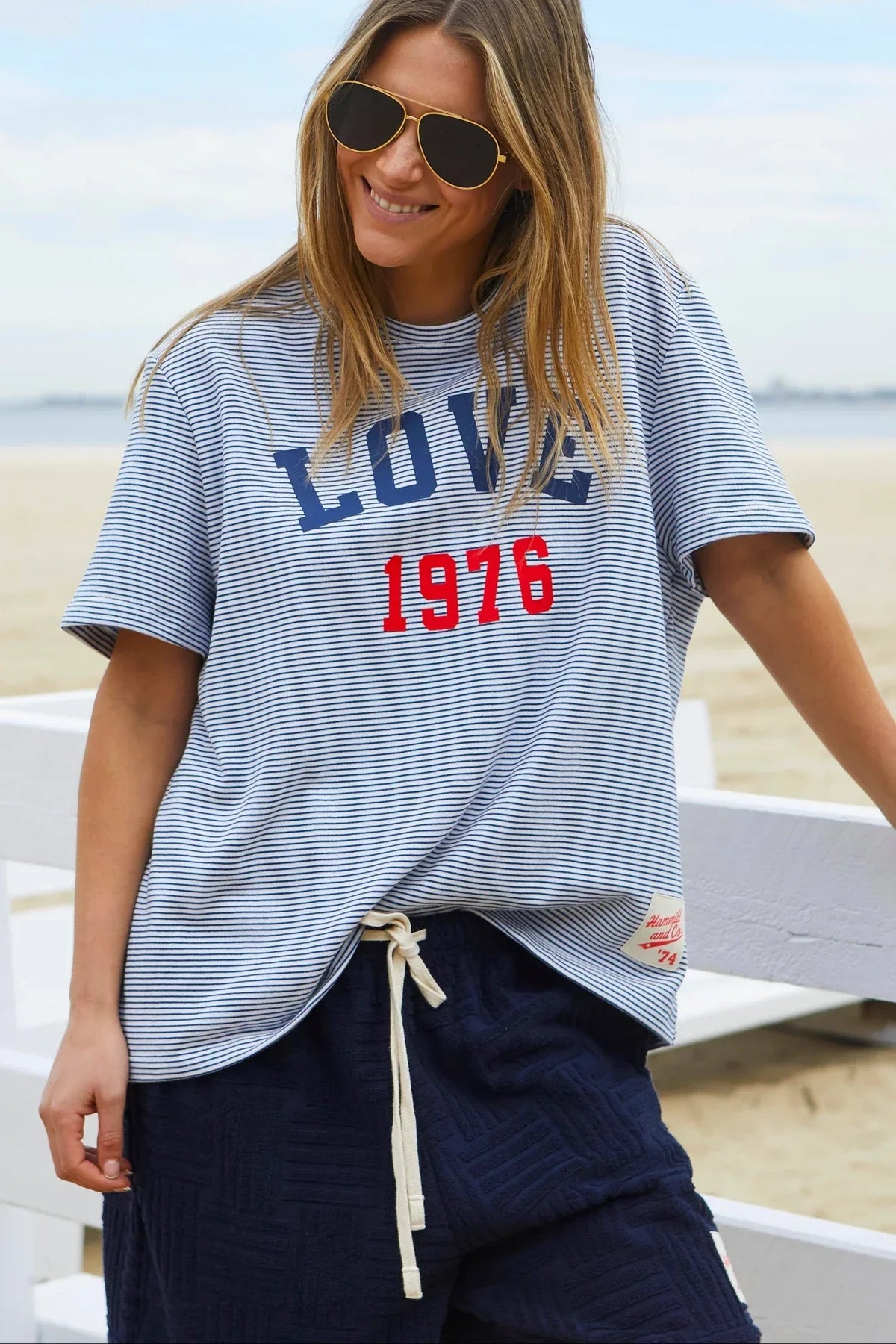This tee is a total throwback in the best way. With fine navy and white stripes and a pop of red“1976 LOVE” across the front, it’s giving vintage souvenir tee meets cool street style. The fit is oversized and relaxed — made for casual summer days.