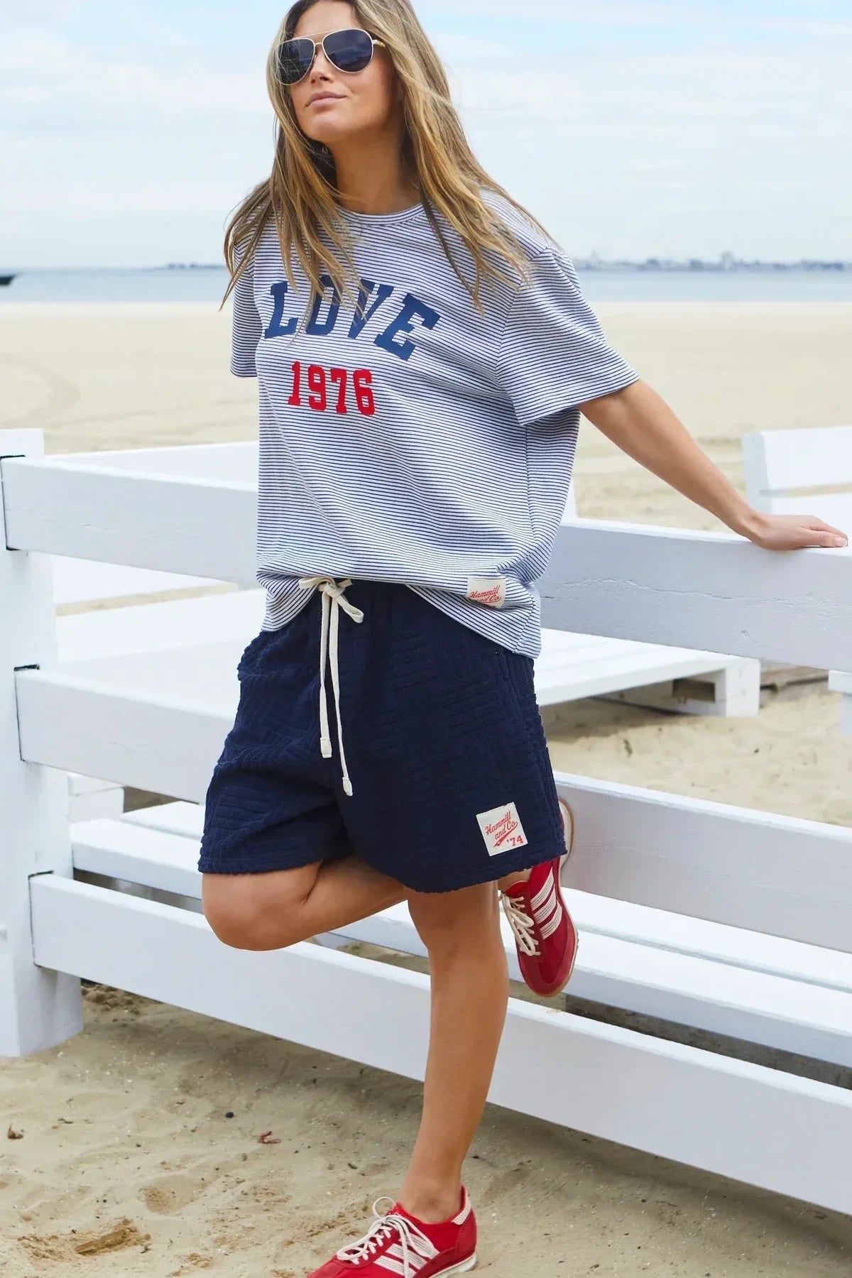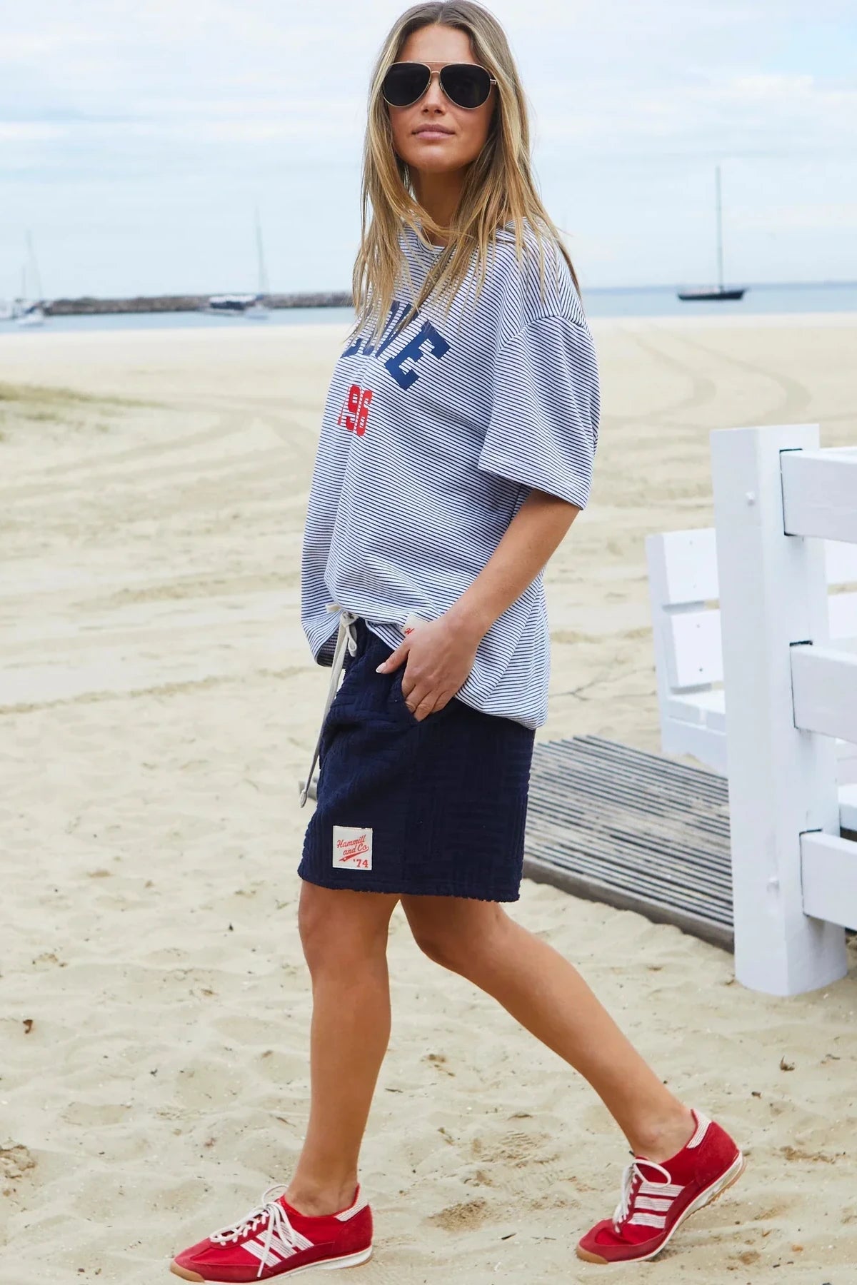 These shorts are pure chill vibes. Made from super-soft navy towelling fabric, they’ve got a textured pattern that gives them a bit of edge. The relaxed fit, comfy elastic waistband, and drawstring tie make them perfect for throwing on after a swim or just cruising around town.