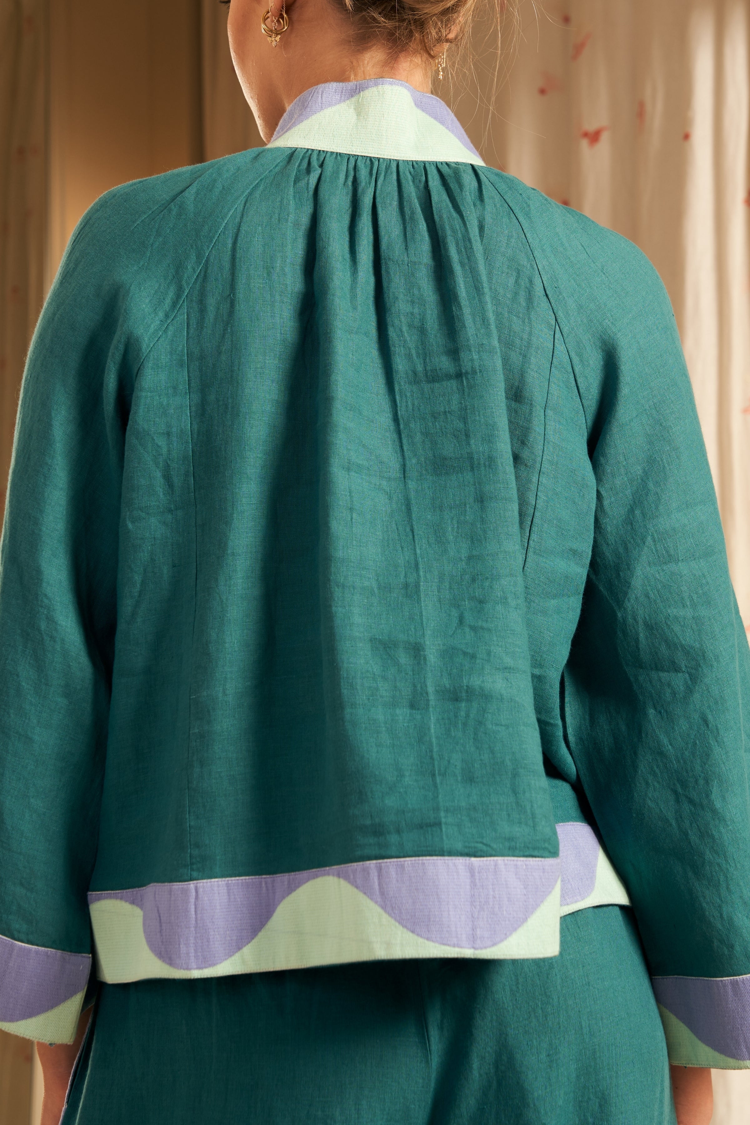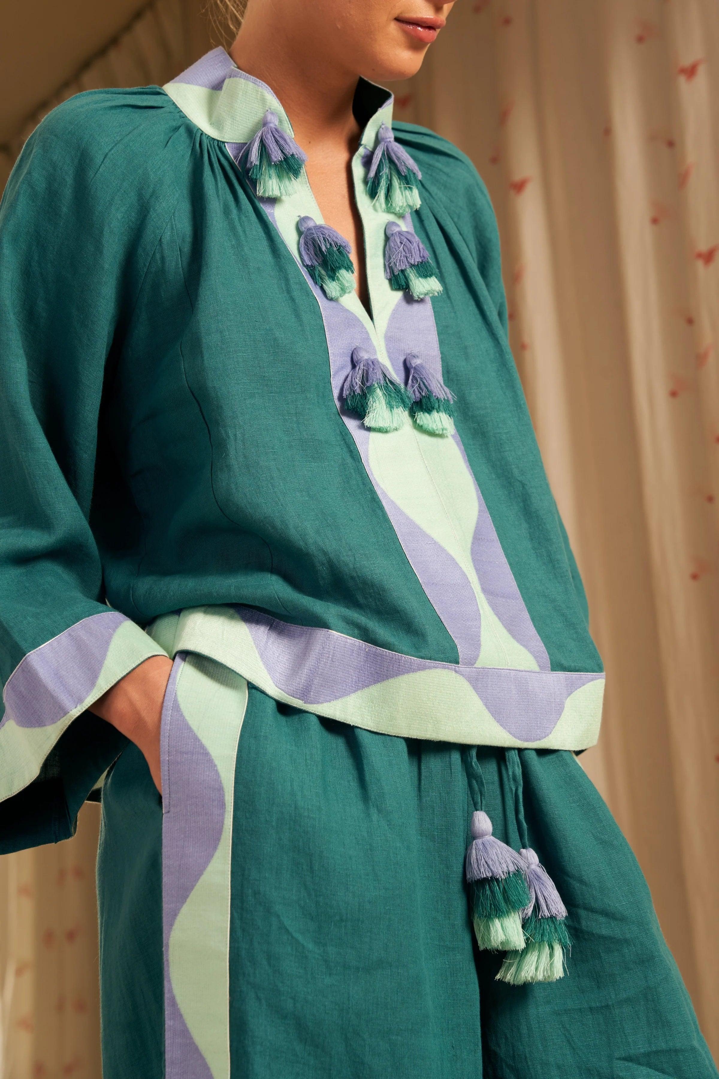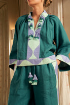- Framed by two colour wave embroidery and finished with hand made, tiered cotton tassels at the neckline