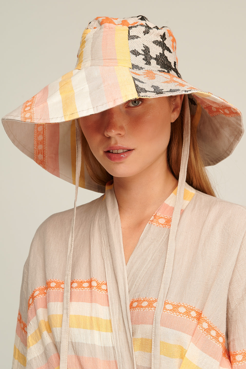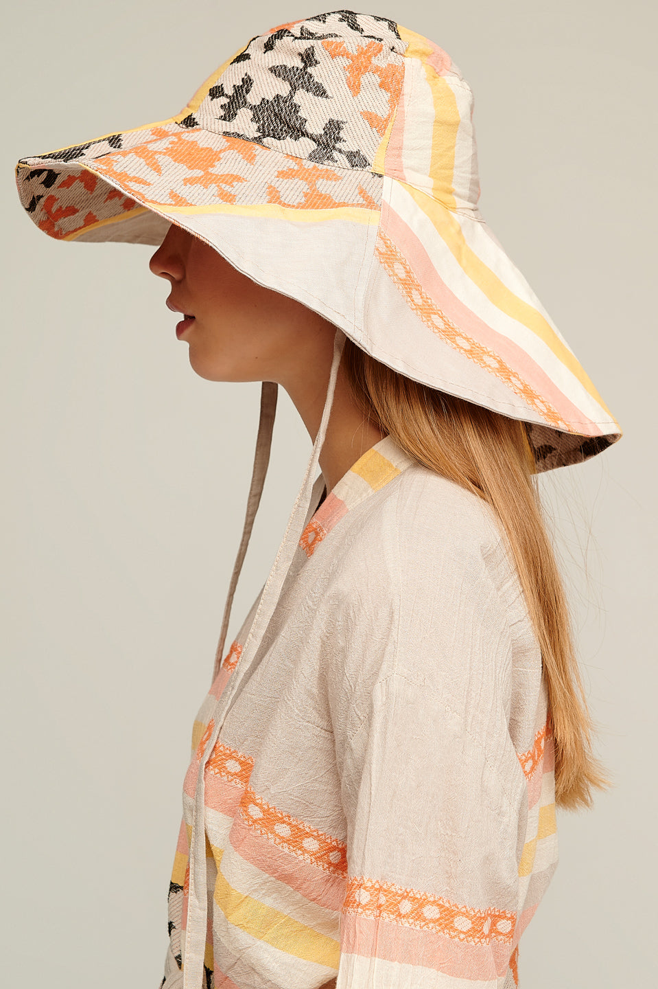 A beautifully soft cotton hat with a wide and downwards sloping brim which can be worn back with the matching Pearl & Caviar Dress. So many to choose from. Make a gorgeous statement this Summer.