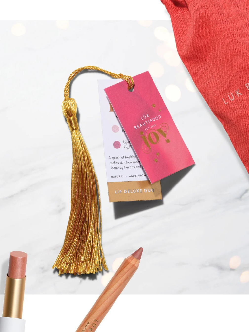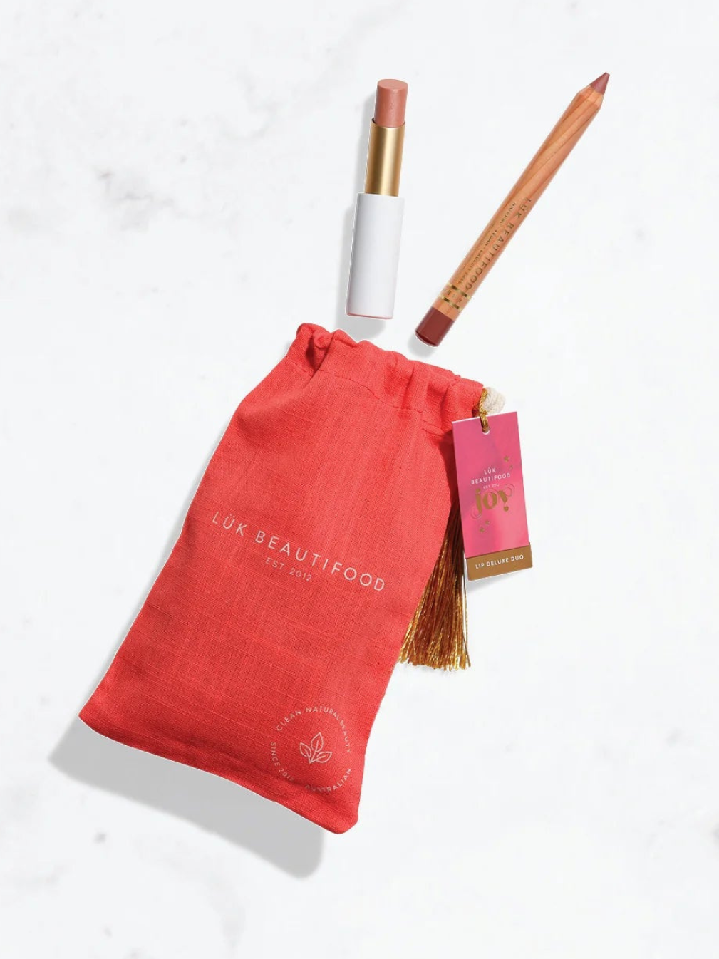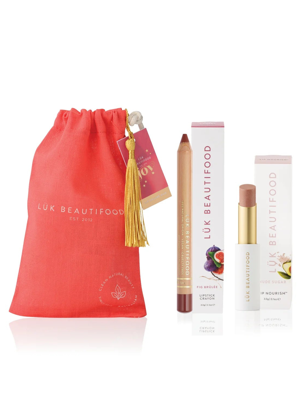 Lip Duo Deluxe in Nude Mauve is the perfect curated pair of our best-selling balmy natural Lip Nourish™ and Lipstick Crayon. This splash of healthy nude gives the perfect natural lip, to make your skin look more alive and instantly healthy and glowing. Give the gift of double happiness, beautifully packaged in an eco luxe bag with gold tassels and a tag ready to gift or keep!
