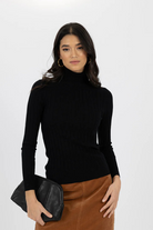 - Classy ribbed skivvy with turtleneck and long sleeves.