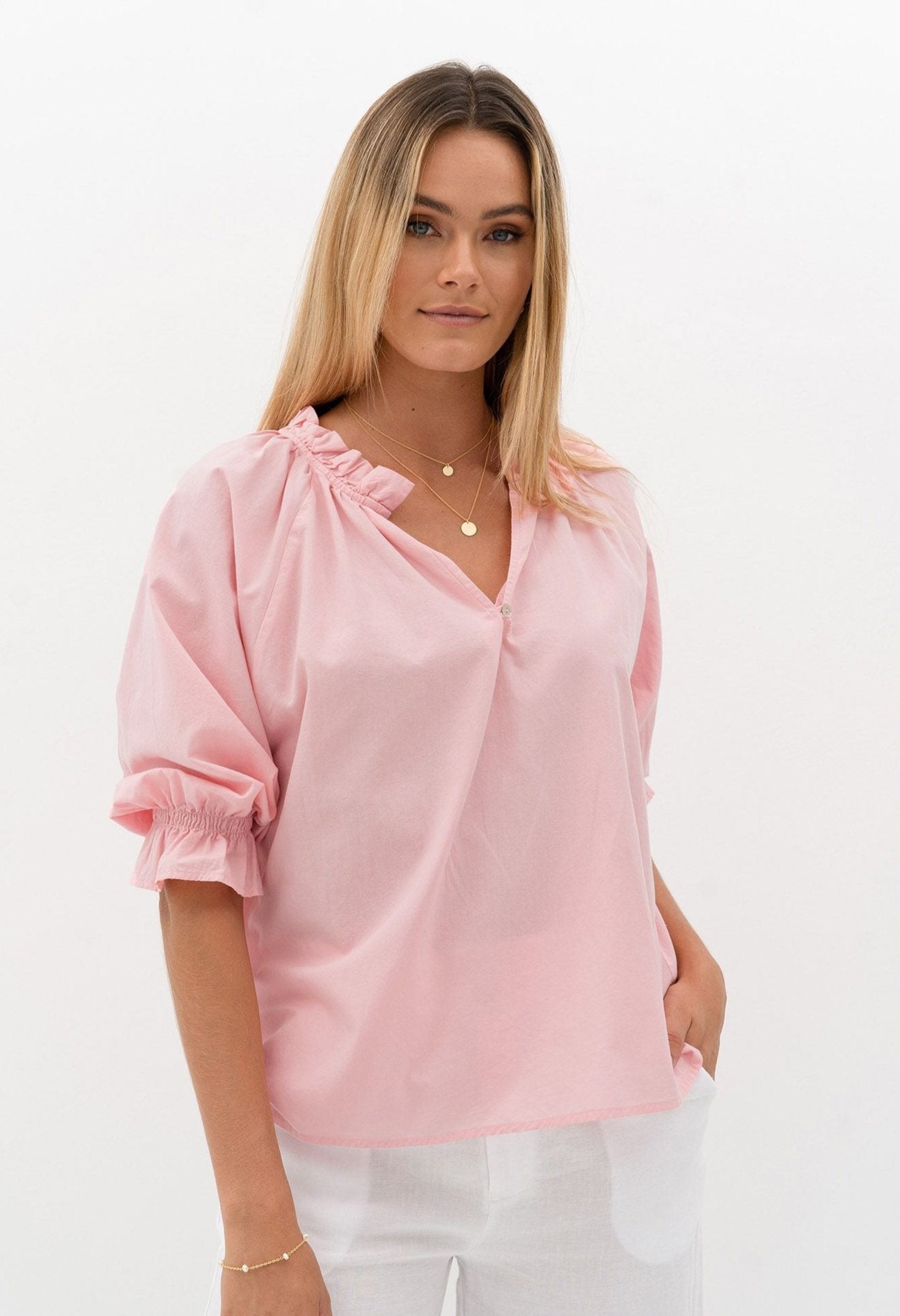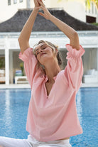 Meet the Splice Blouse from Humidity Lifestyle, crafted from 100% Cotton for an exceptionally soft feel. The half sleeve top with elasticated cuff with frill and the V neckline with button tab gives your look the perfect touch of elegance. Not to mention the back neck frill, adding a unique and stylish flair that will complete any outfit! Available in White, Melon, Sorbet & Sky.