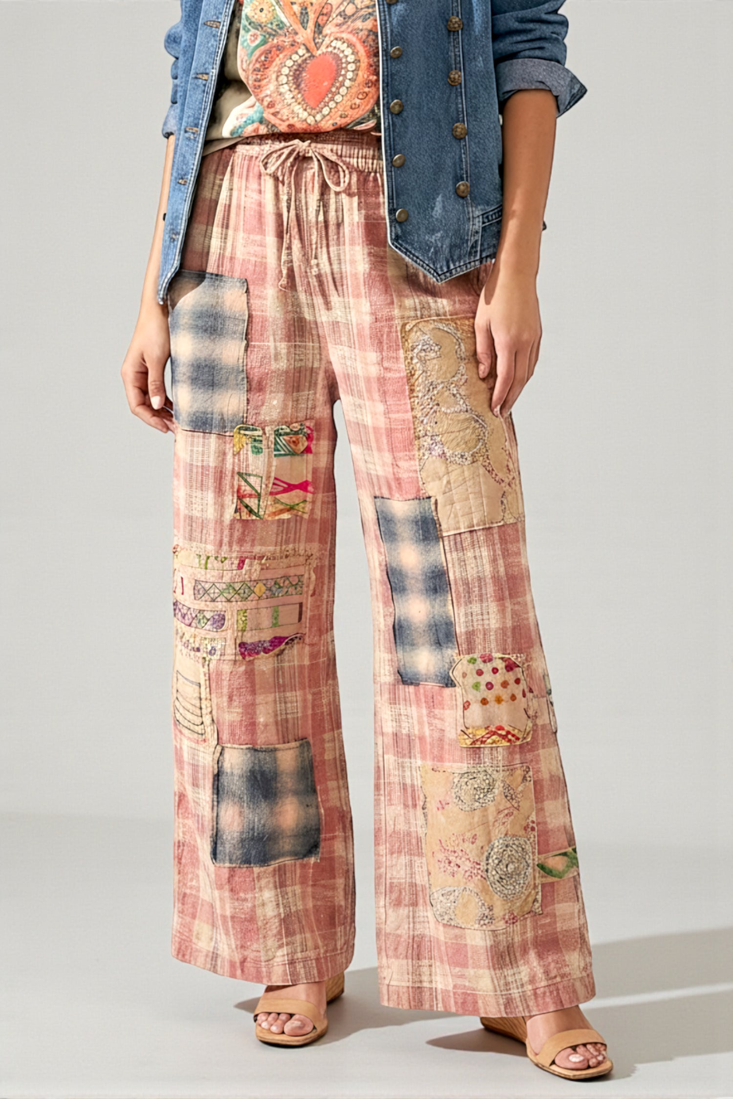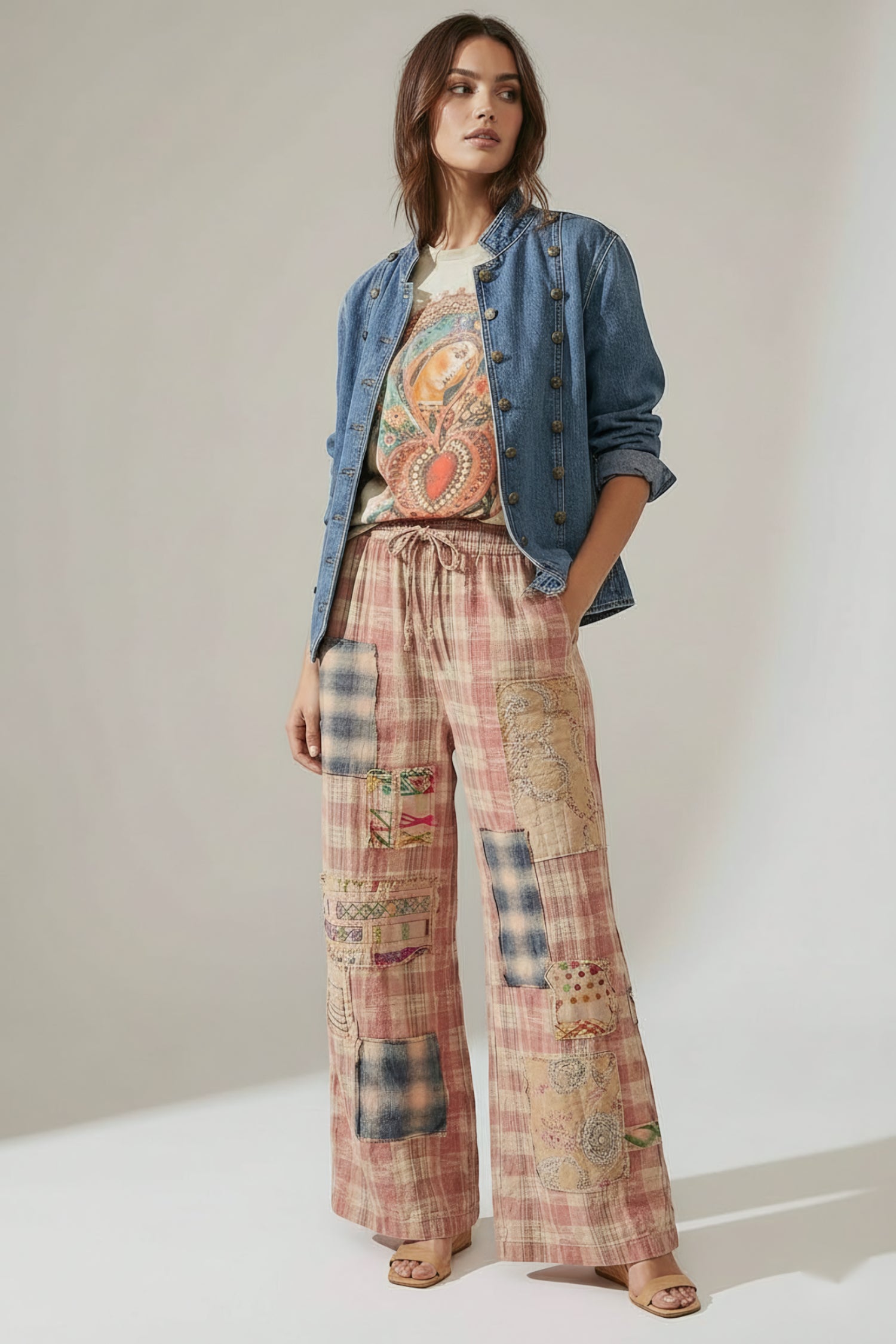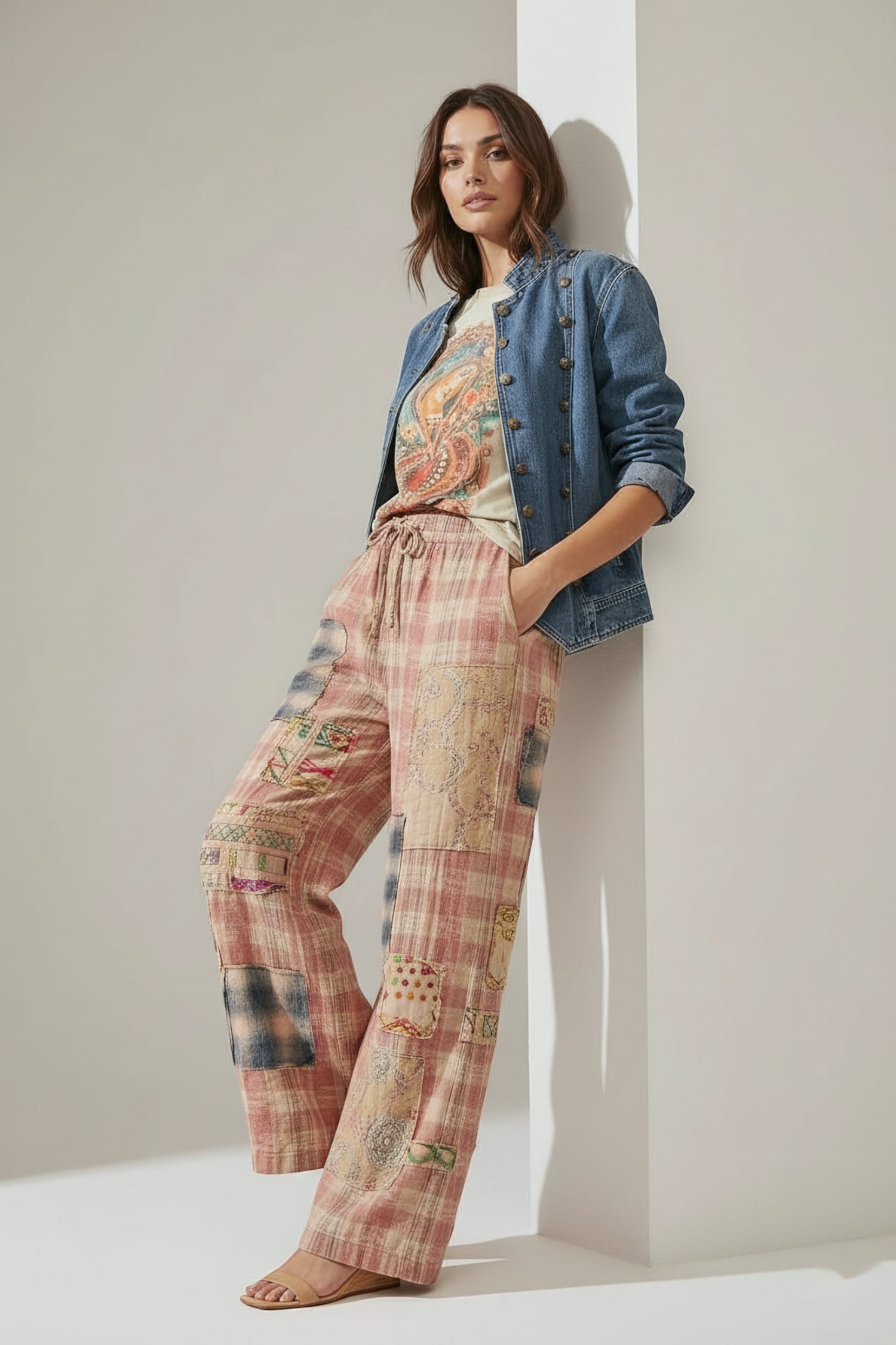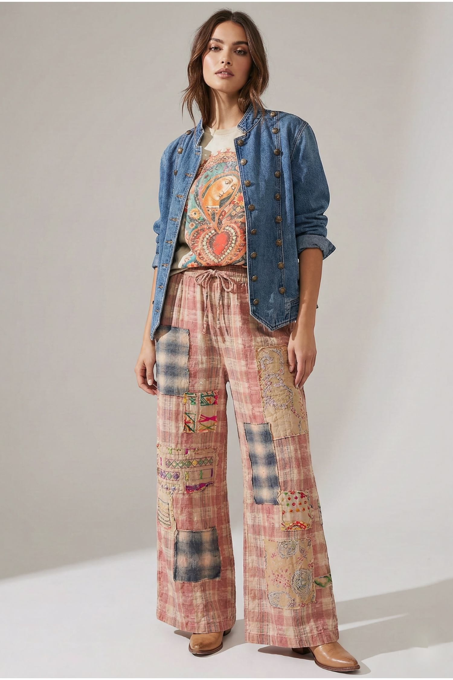 Step into a canvas of comfort and creativity with the Meadow Views Sunrise Pants. Designed for the free spirit who craves elevated glamour with a grounded, artisan touch, these pants feature a soft, sunrise-pink plaid base adorned with curated patchwork squares. Each patch tells a story, featuring intricate embroidery and vintage-inspired textiles that channel a true artisan aesthetic. The relaxed wide-leg silhouette moves with you, making them perfect for studio days or sun-drenched weekend wanderings. Paired with a simple tee or a denim jacket, these pants transform an outfit into a work of art.