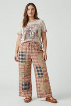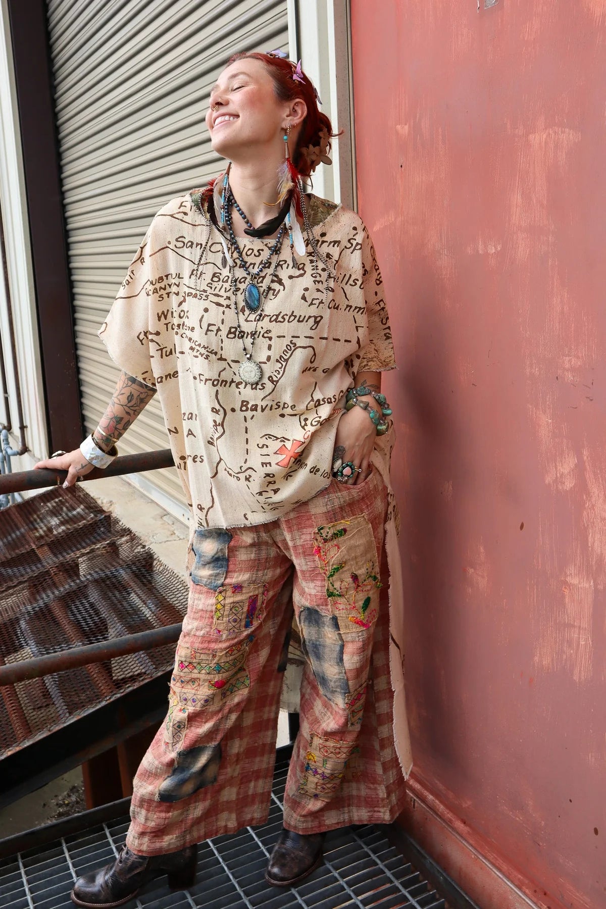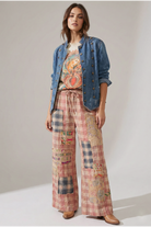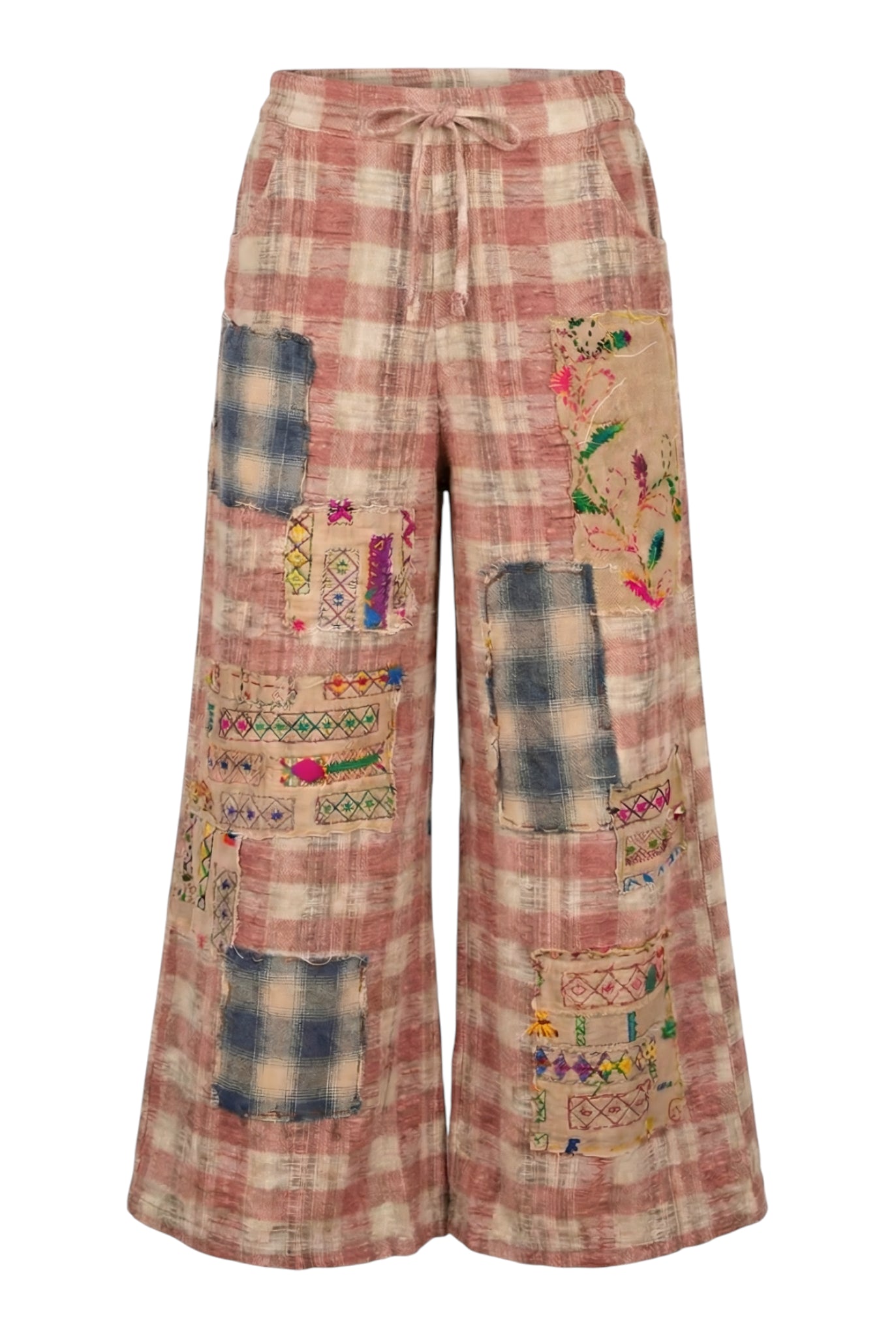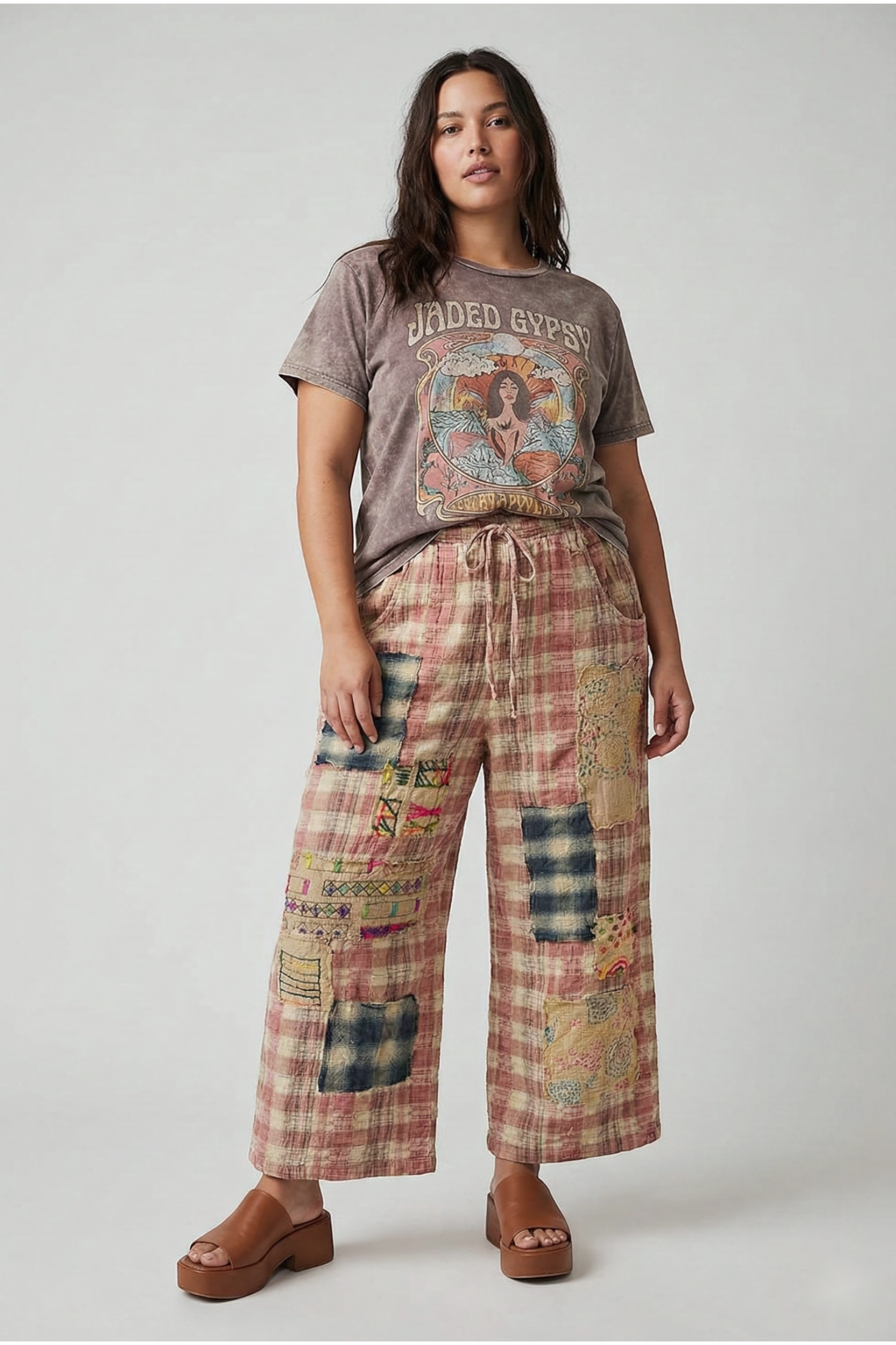 Step into a canvas of comfort and creativity with the Meadow Views Sunrise Pants. Designed for the free spirit who craves elevated glamour with a grounded, artisan touch, these pants feature a soft, sunrise-pink plaid base adorned with curated patchwork squares. Each patch tells a story, featuring intricate embroidery and vintage-inspired textiles that channel a true artisan aesthetic. The relaxed wide-leg silhouette moves with you, making them perfect for studio days or sun-drenched weekend wanderings. Paired with a simple tee or a denim jacket, these pants transform an outfit into a work of art.
