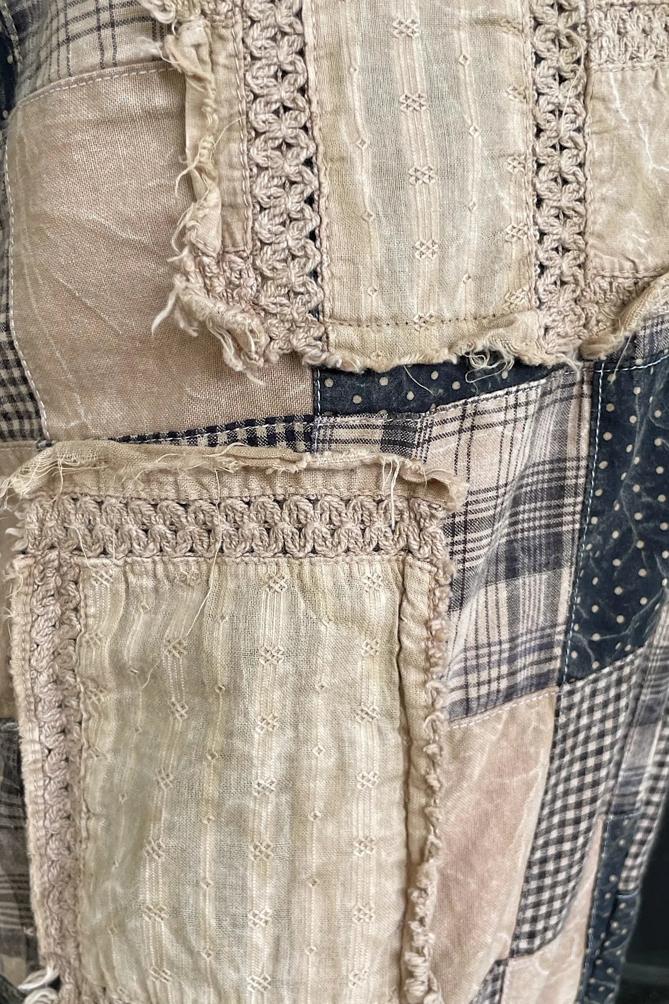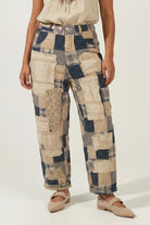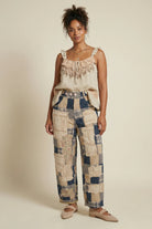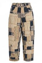 - Lightweight pants with raw edge seams and vintage inspired patchwork