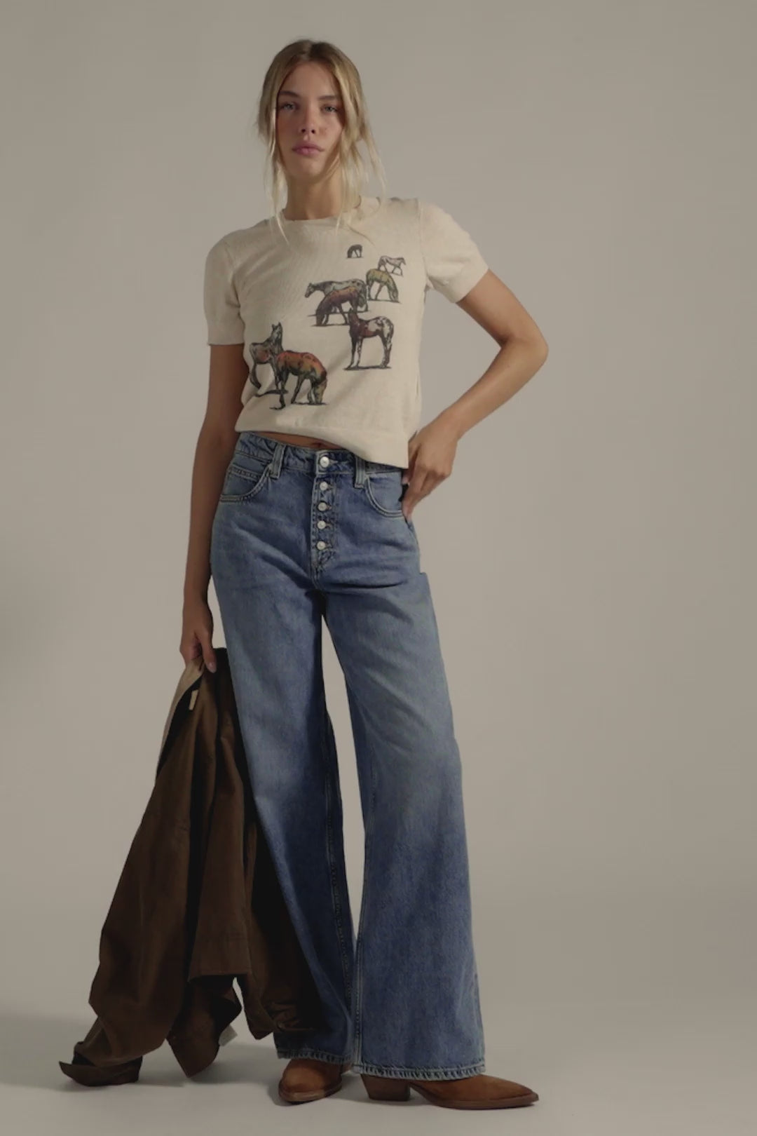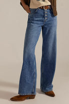 - Exposed button fly closure,, five-pocket design, puddled hemline
