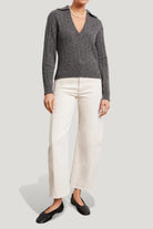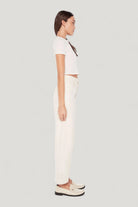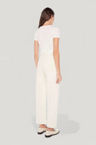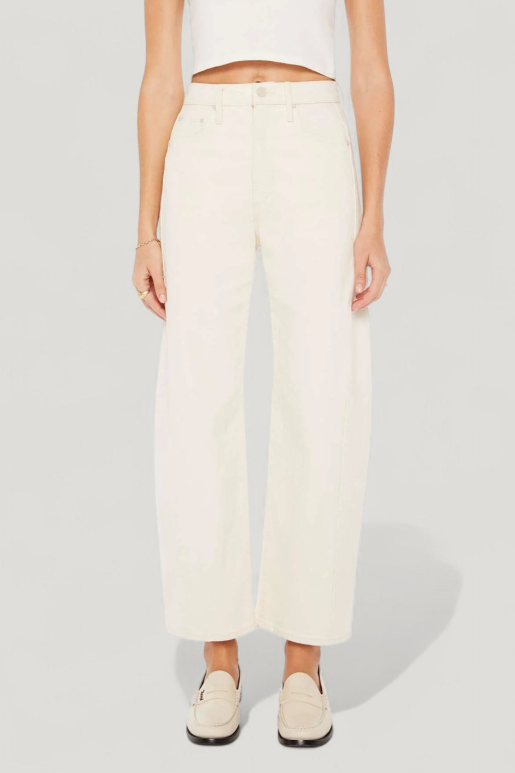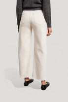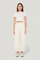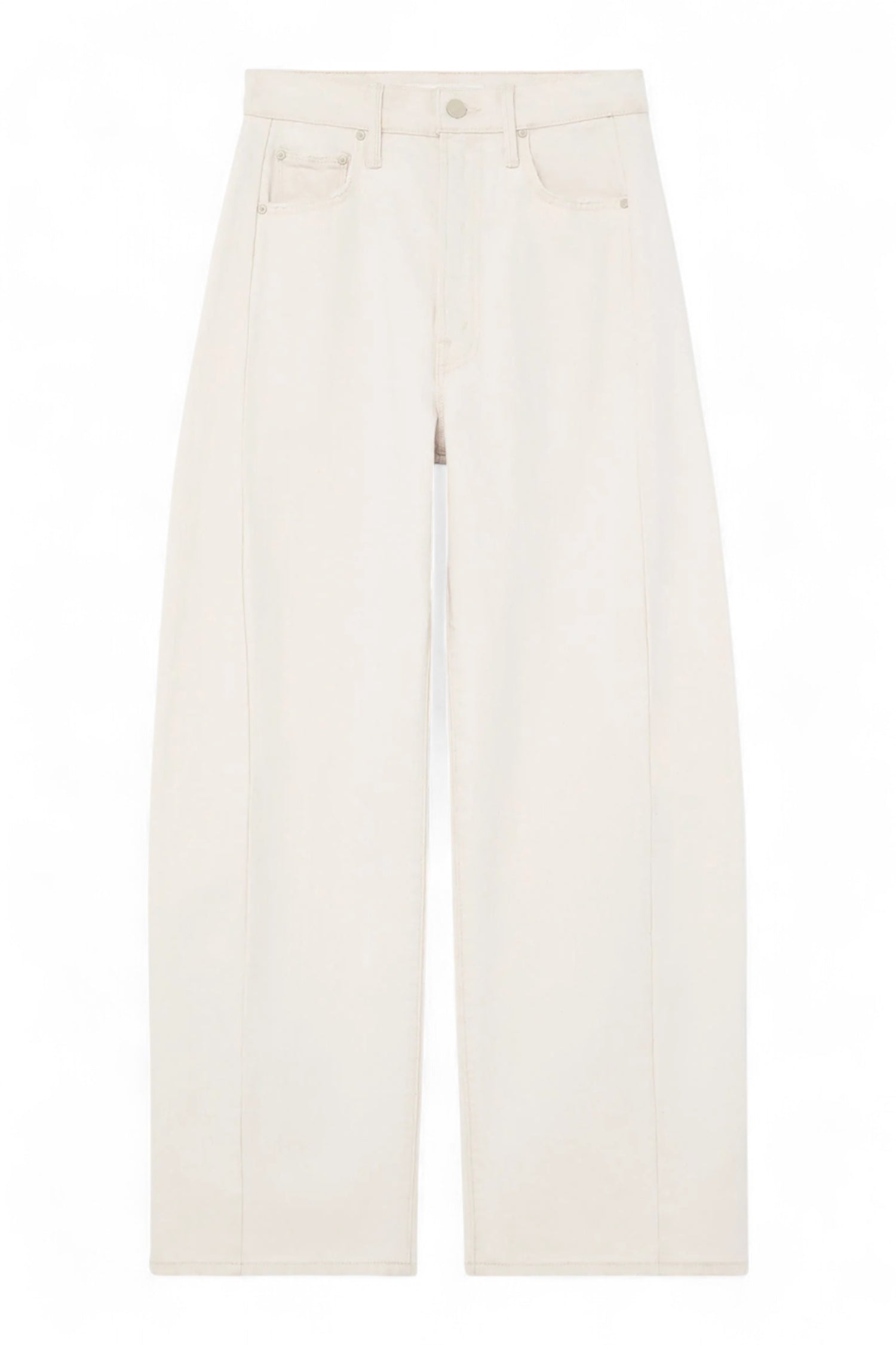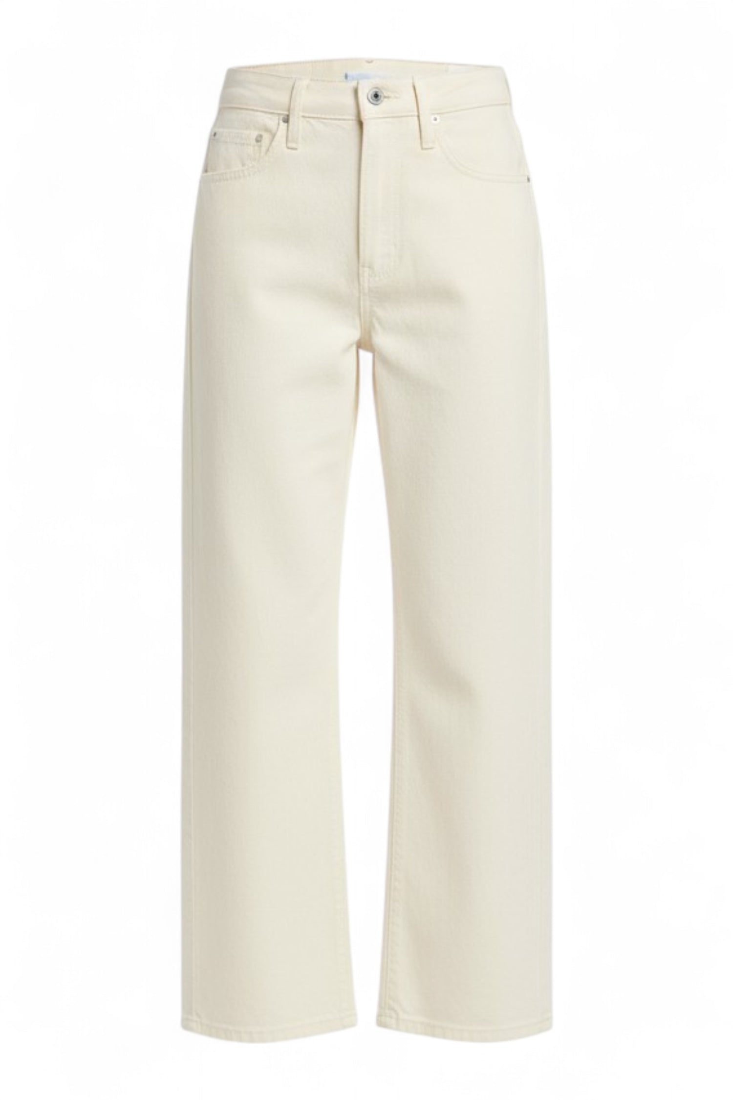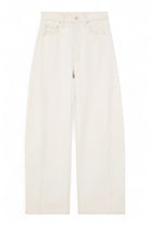 Au naturel. A super high-waisted jean with a wide, curved leg, a 29" inseam, and a clean hem. Cut from a SUPERIOR cotton blend with a touch of stretch, Act Natural is a creamy white hue with tonal hardware. Done in eggshell-white denim with the hardware to match, these jeans have an ultrahigh rise, curved wide legs, and a clean, ankle-length hem. Don’t miss the cool outer seams running down each leg—it’s a subtle detail that adds dimension.