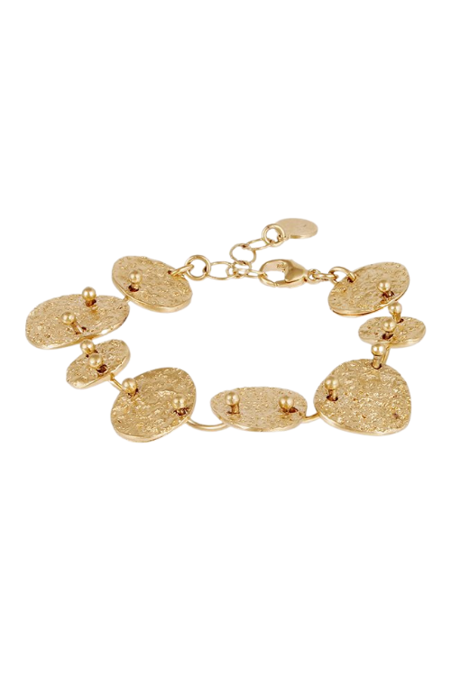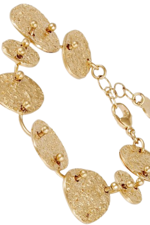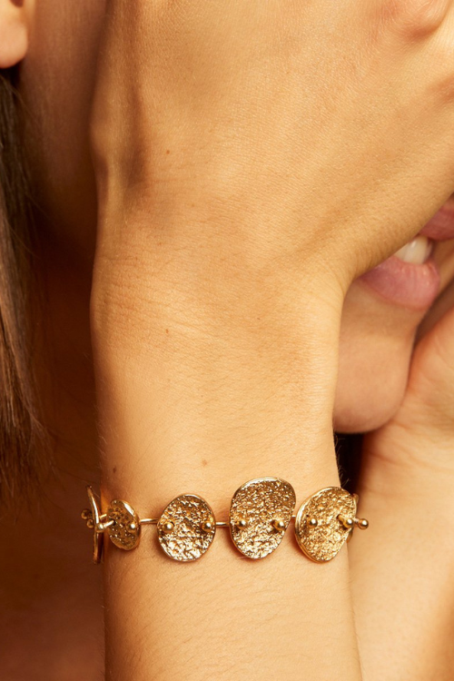Eclipse gold plated bracelet, inspired by the surface of the moon, composed of fine links and irregular rounds delicately hammered by a craftsman. A collection of singular shapes where irregularity creates charm.