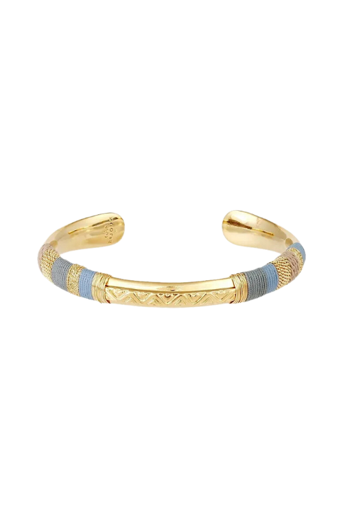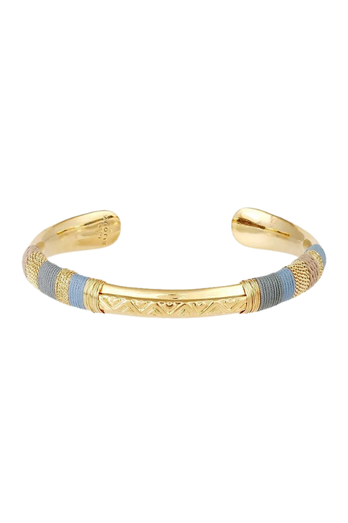 This exquisite Gas Massai Bracelet is crafted with a gold-plated bangle and wrapped in a captivating blend of threads and gold wire. Its elegant combination of organic and mineral materials will transport you on a journey of refined beauty.