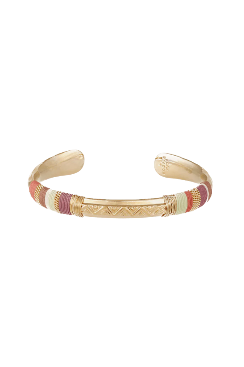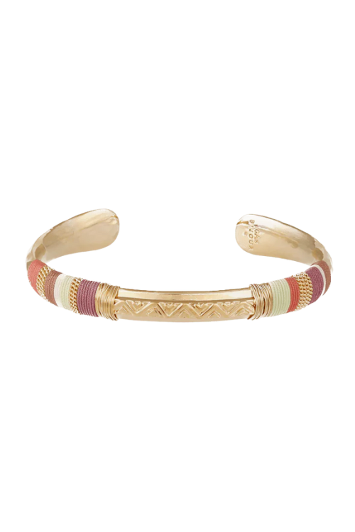 This exquisite Gas Massai Bracelet is crafted with a gold-plated bangle and wrapped in a captivating blend of threads and gold wire. Its elegant combination of organic and mineral materials will transport you on a journey of refined beauty.