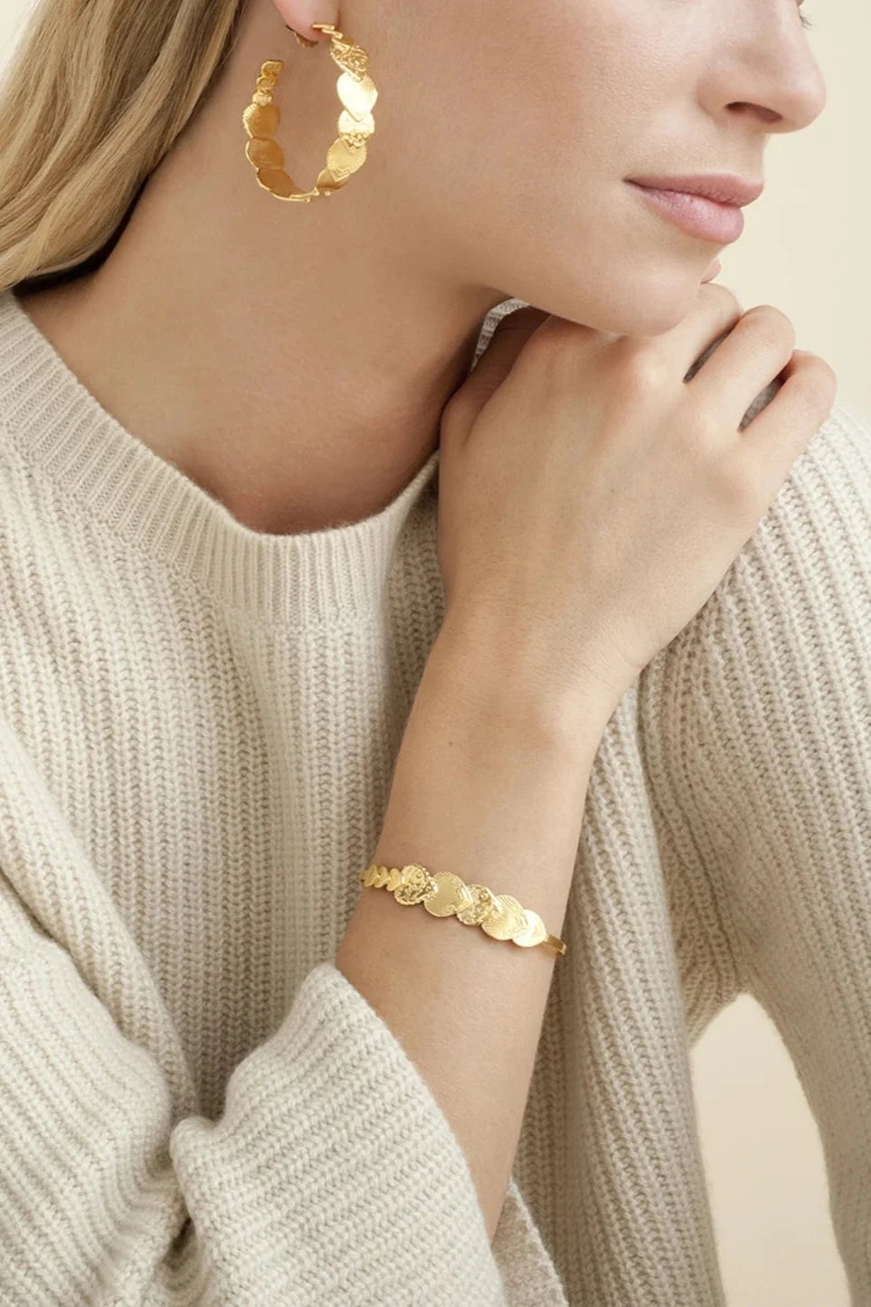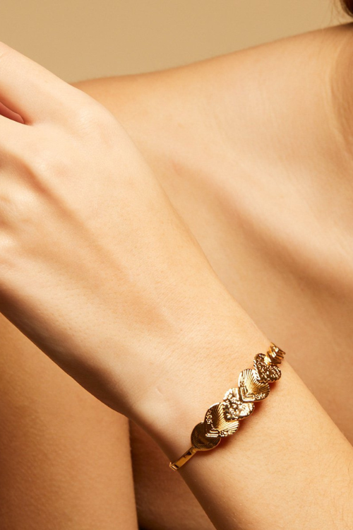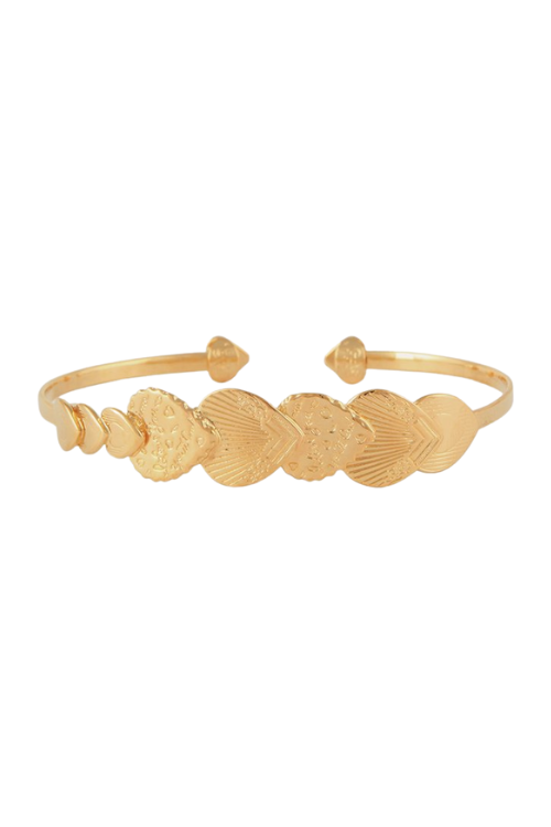 Gold plated bracelet adorned with multiple delicately engraved hearts.
